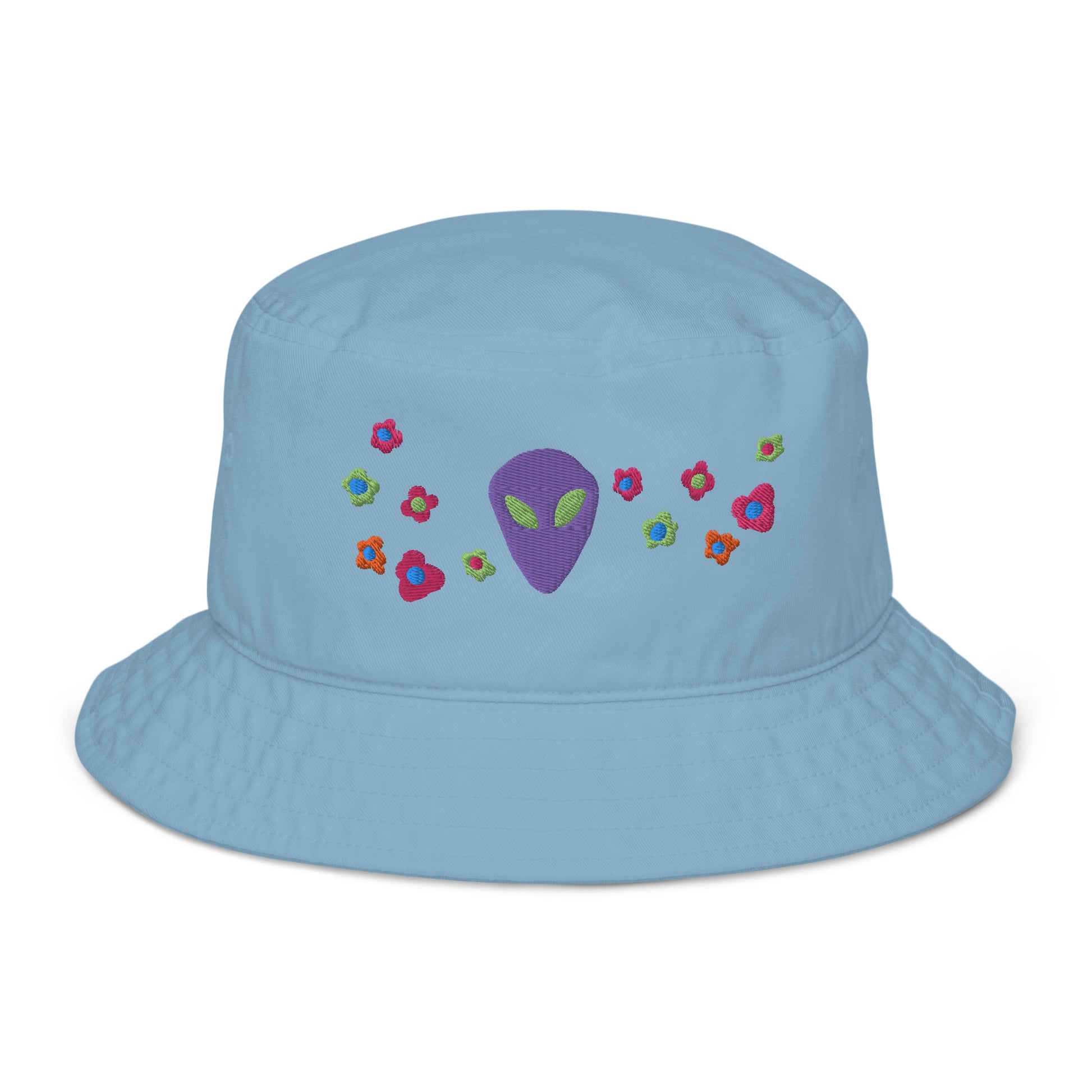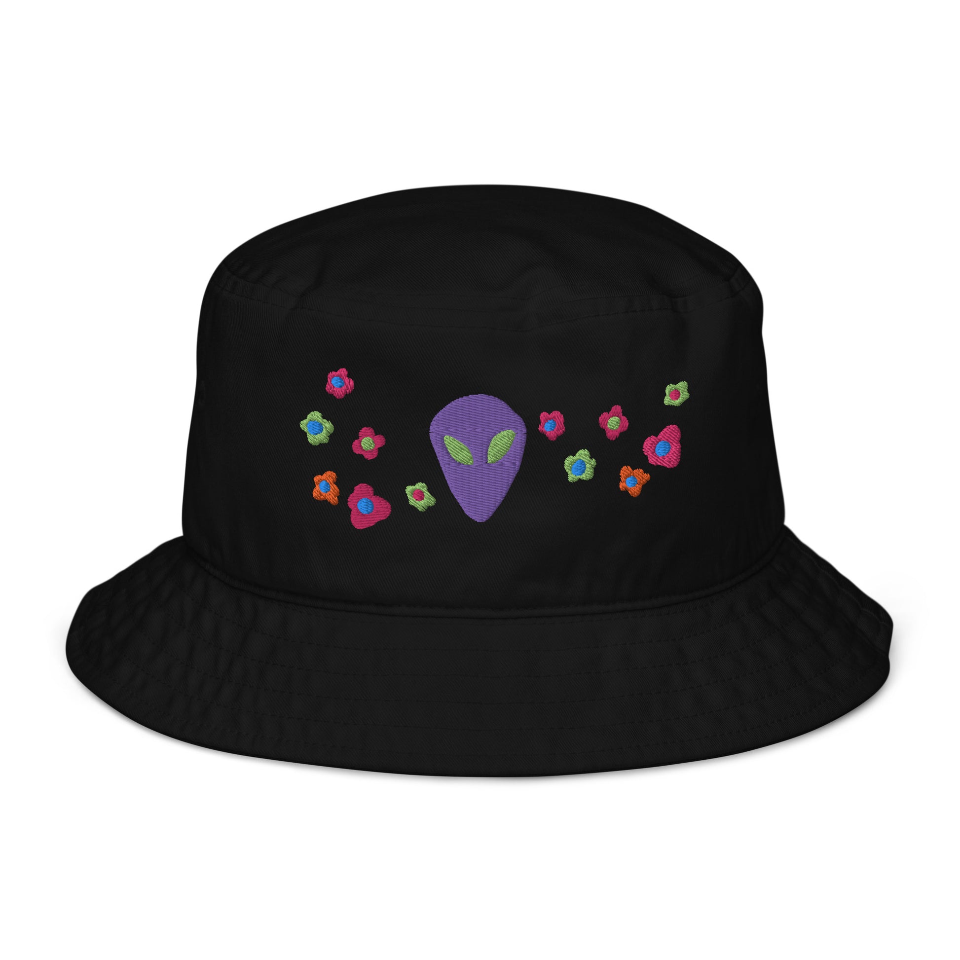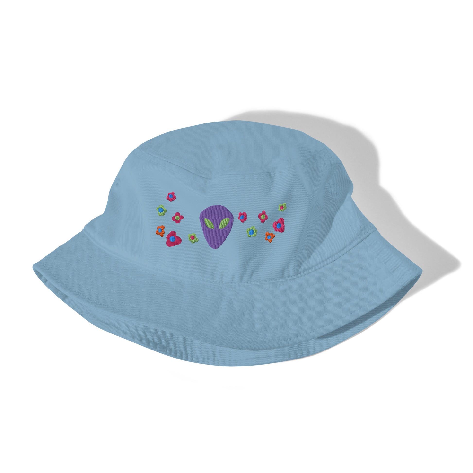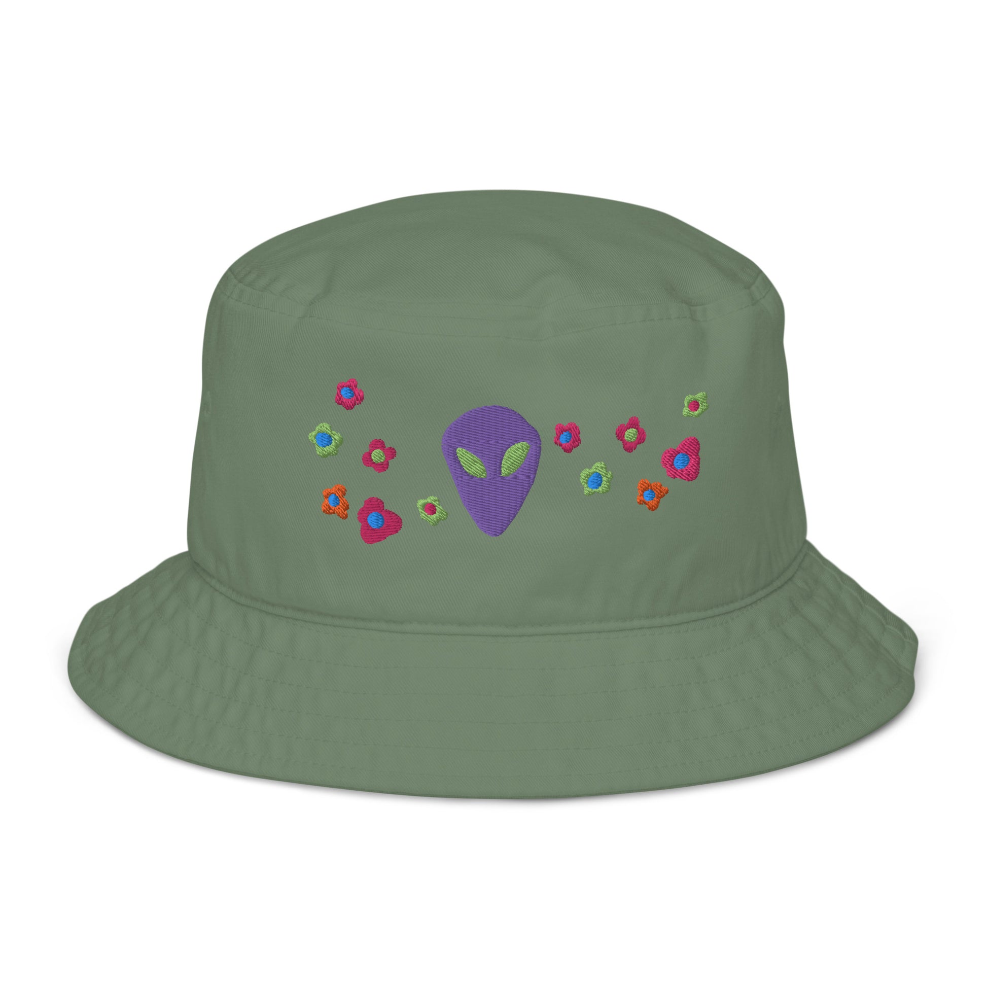 Introducing our 100% cotton eco-conscious Bucket Hat, a stylish and sustainable accessory that seamlessly blends cosmic charm with the beauty of nature. Crafted for those who value both fashion and environmental consciousness, this hat is the perfect choice for the eco-conscious trendsetter. With a captivating purple alien face embroidered on the front, adorned with mesmerizing green eyes and surrounded by an array of colorful flowers, this hat is a true celebration of cosmic wonder and the vibrant spirit of the natural world.