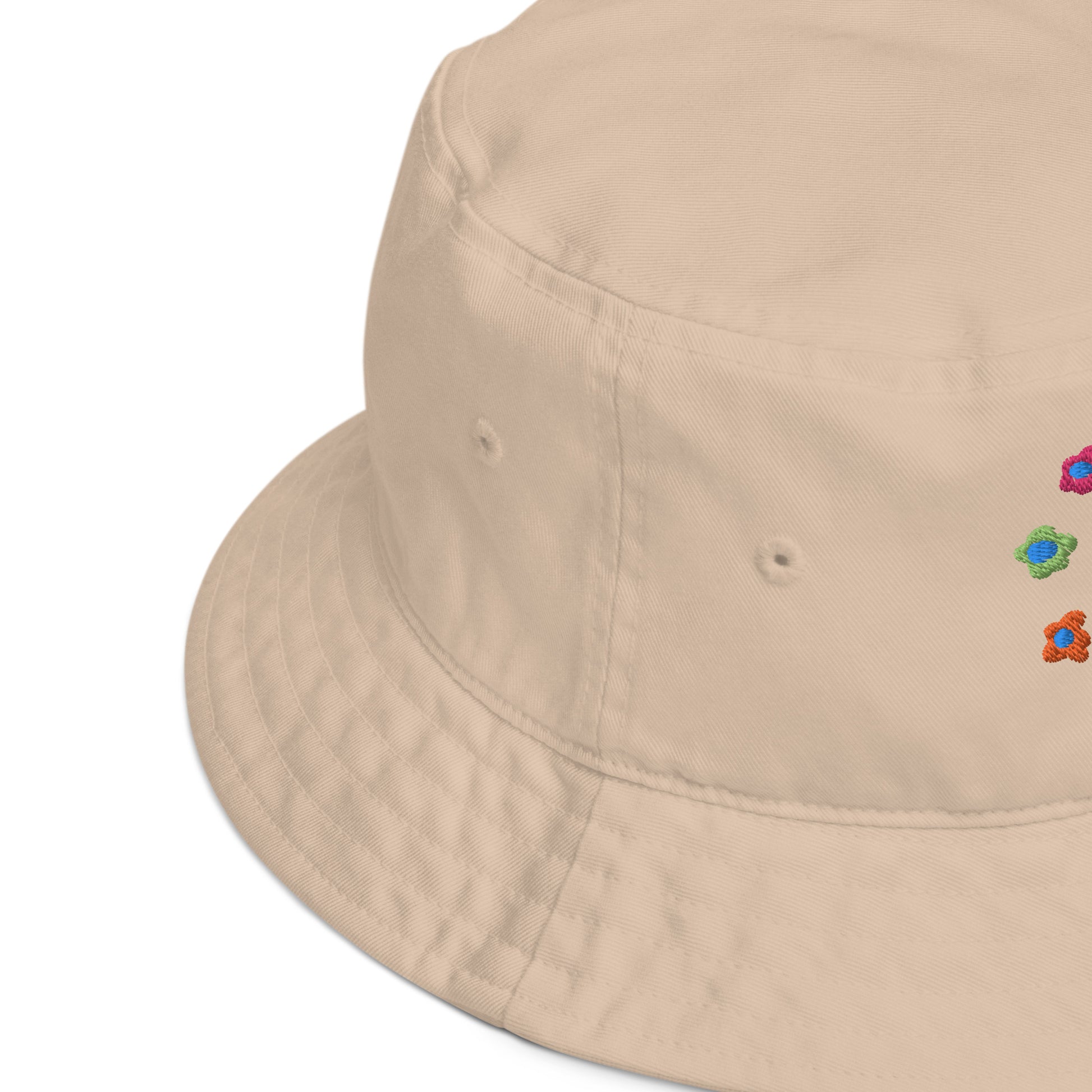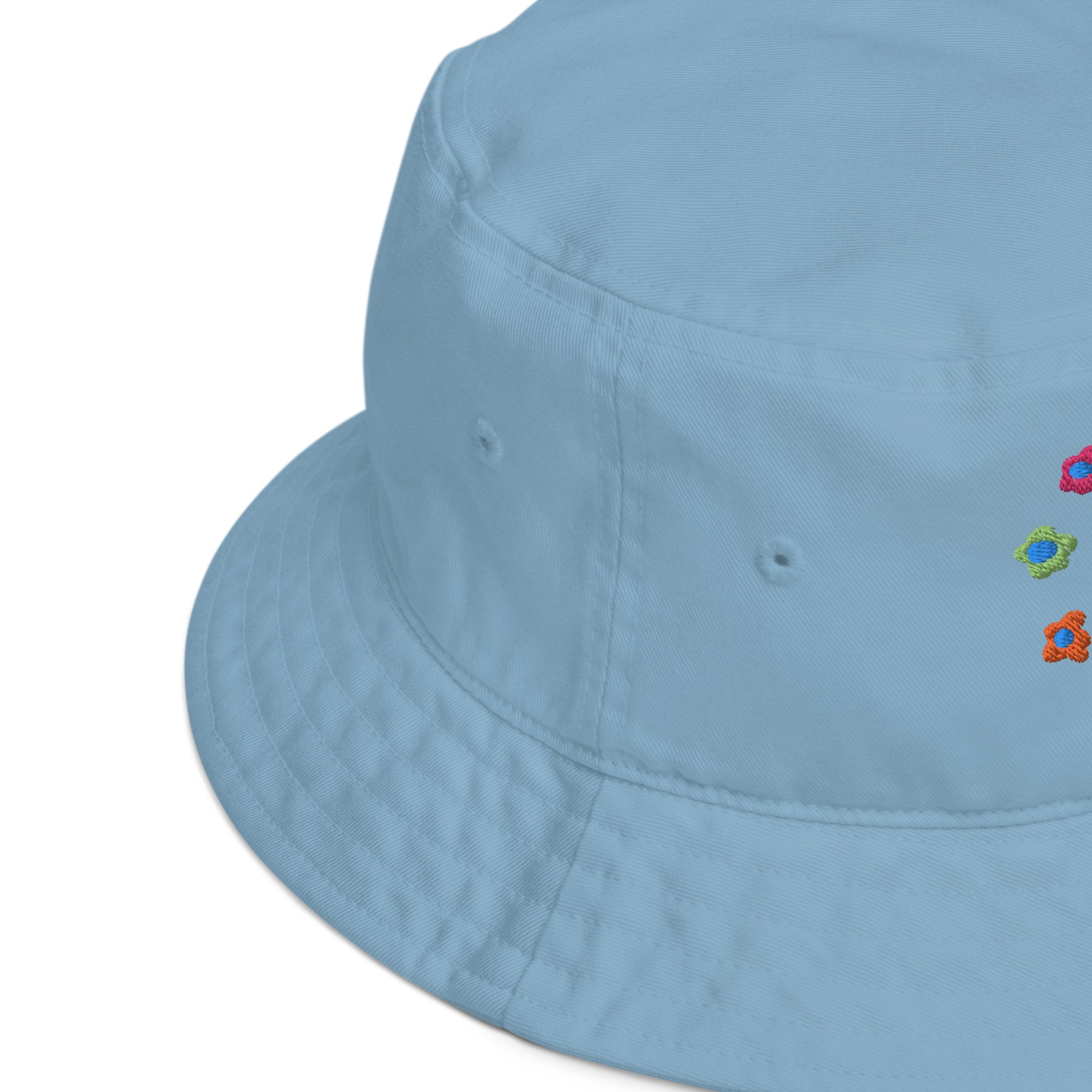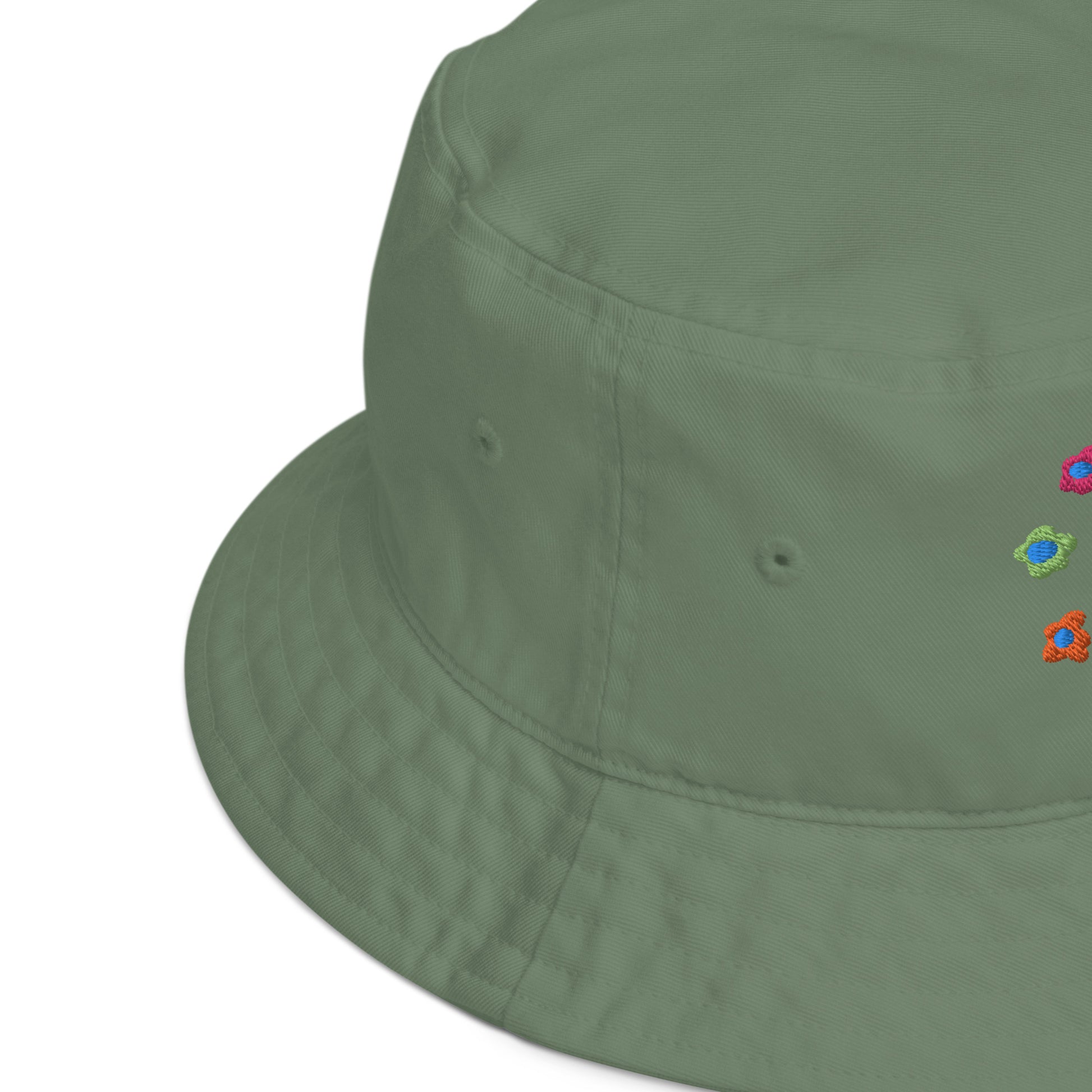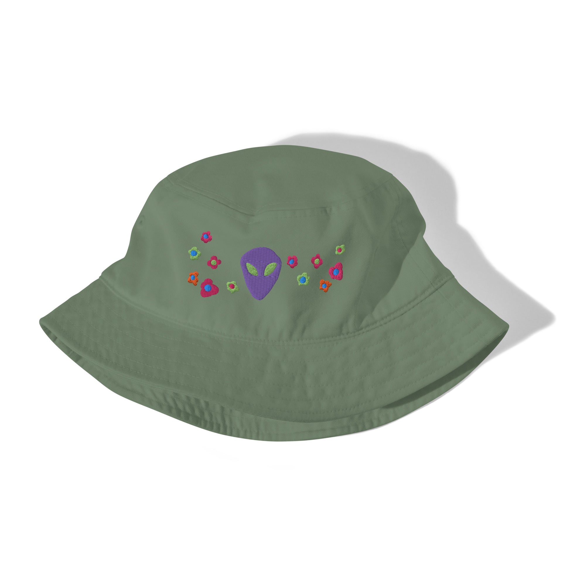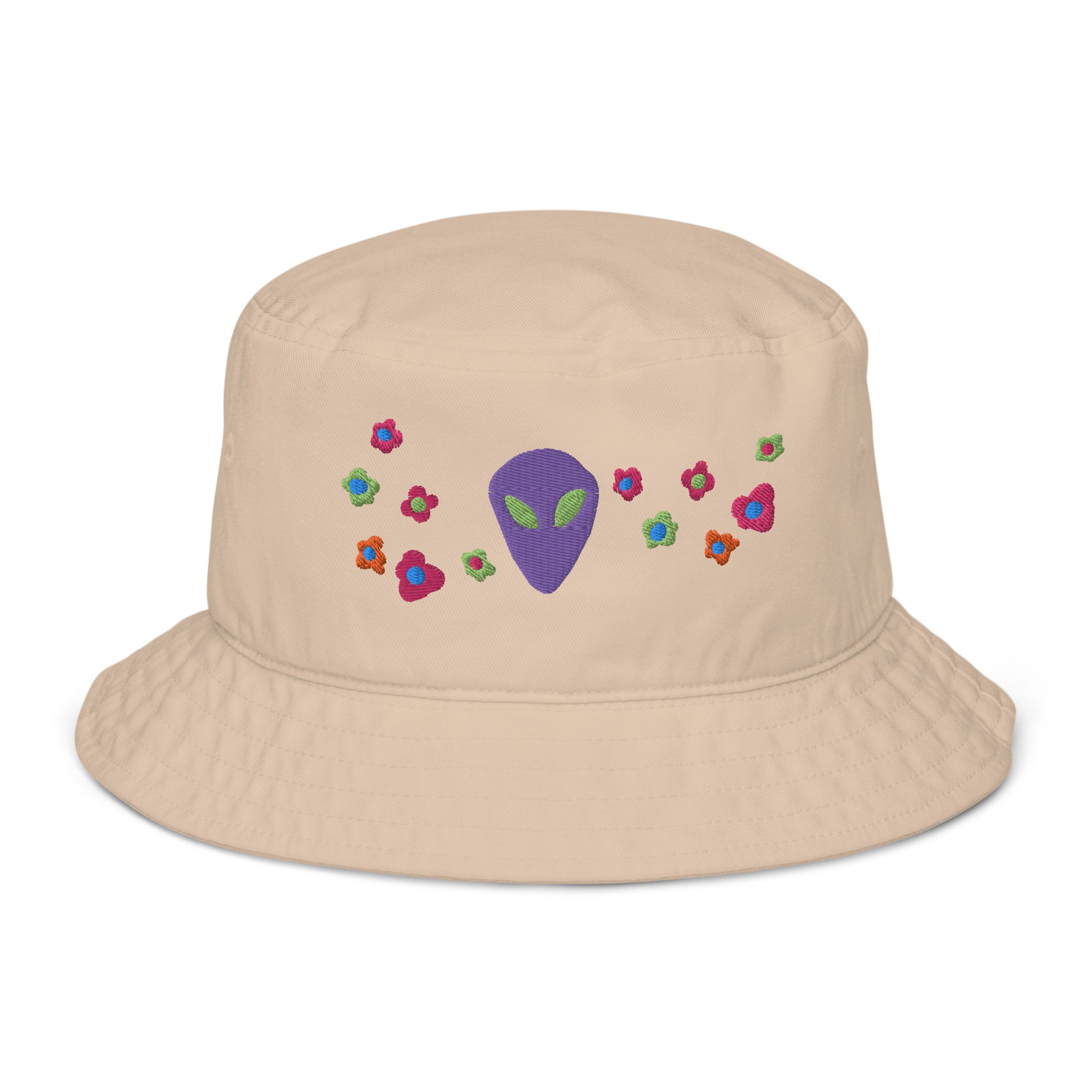 Introducing our 100% cotton eco-conscious Bucket Hat, a stylish and sustainable accessory that seamlessly blends cosmic charm with the beauty of nature. Crafted for those who value both fashion and environmental consciousness, this hat is the perfect choice for the eco-conscious trendsetter. With a captivating purple alien face embroidered on the front, adorned with mesmerizing green eyes and surrounded by an array of colorful flowers, this hat is a true celebration of cosmic wonder and the vibrant spirit of the natural world.