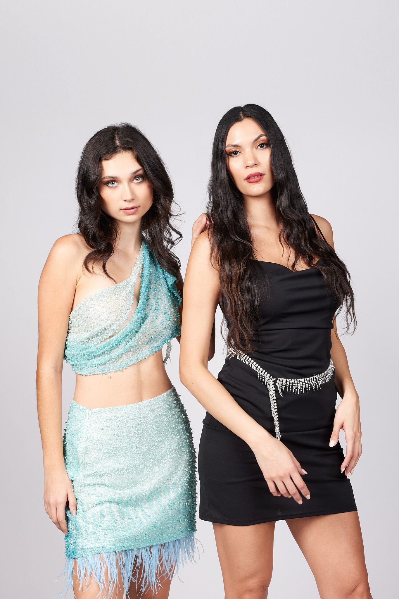 The most divine, aquatic inspired, embroidered blue ombre fabric with blue feather trim at the hem gives you the perfect party mini skirt. Dress this piece up or down for a beautiful luxe fashion statement.