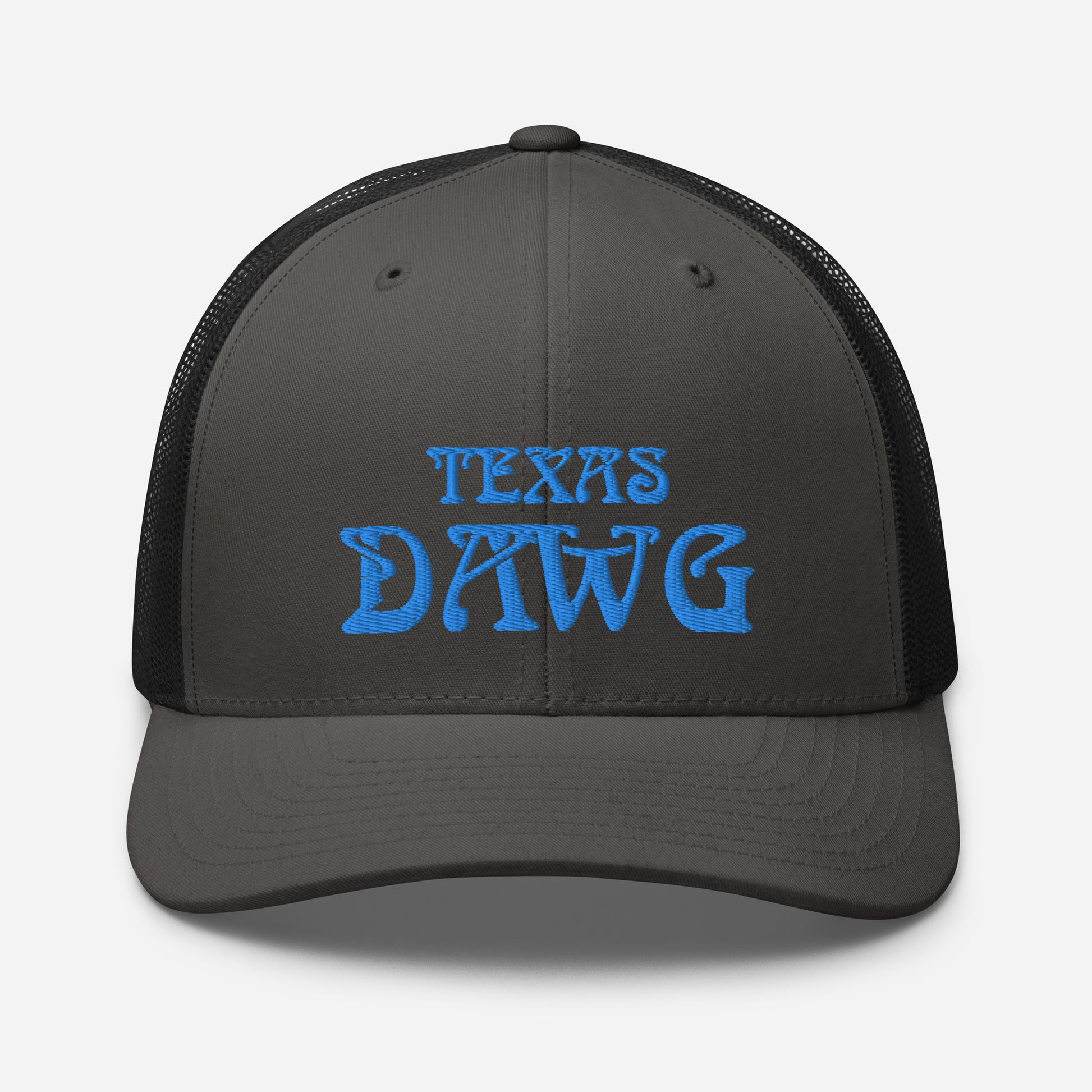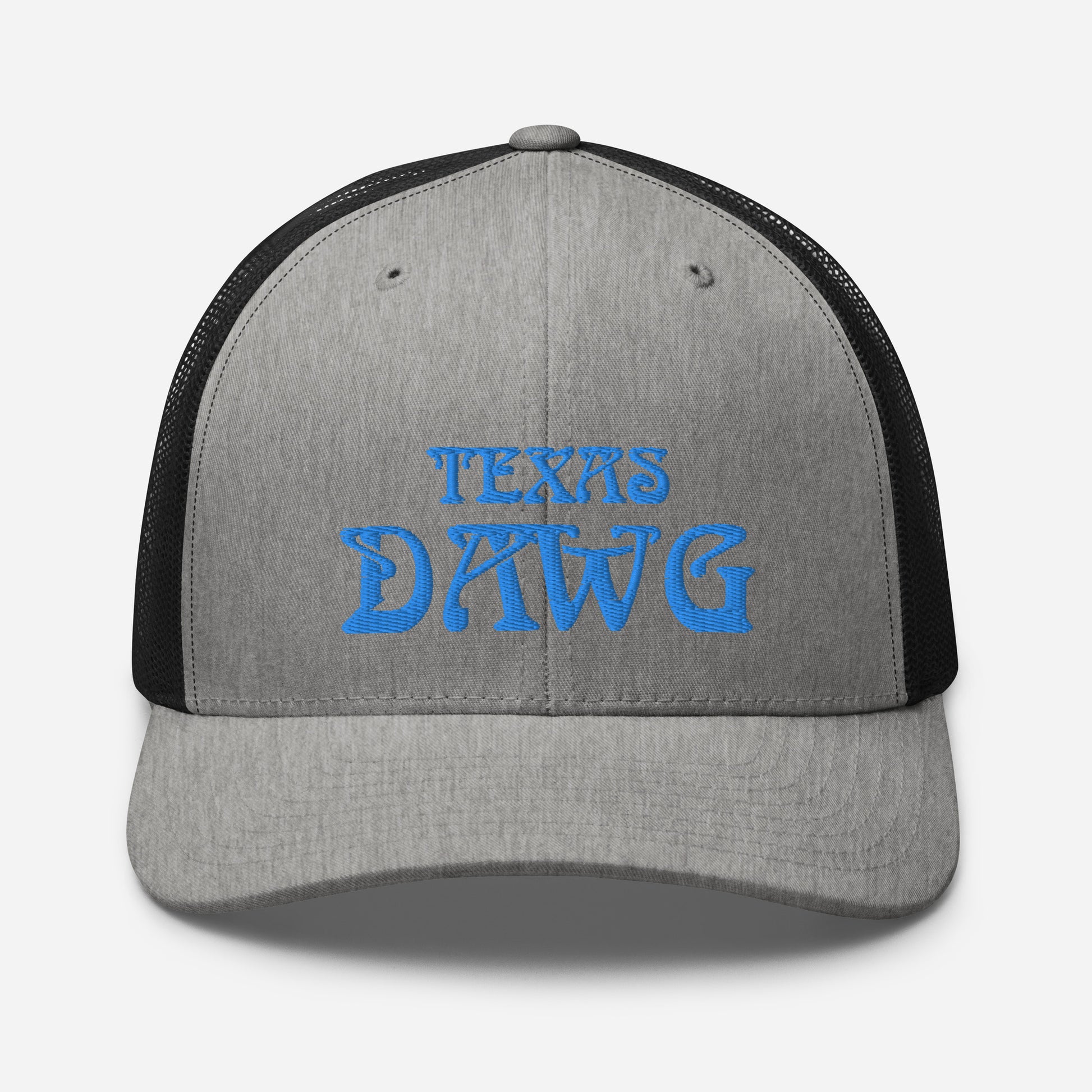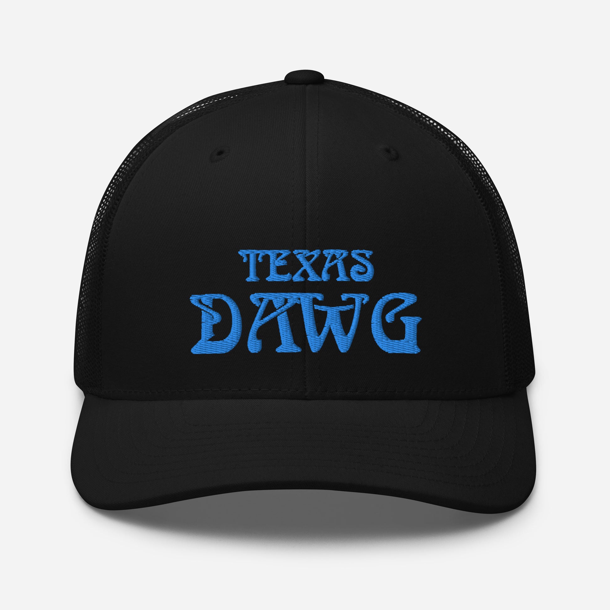 This six-panel trucker cap with a mesh back will be a comfy and classic choice for a perfect day in the sun or a funny trucker cap perfect for crazy hat day. Texas Dawg is embroidered on the front in a fancy font and our iconic blue color.
