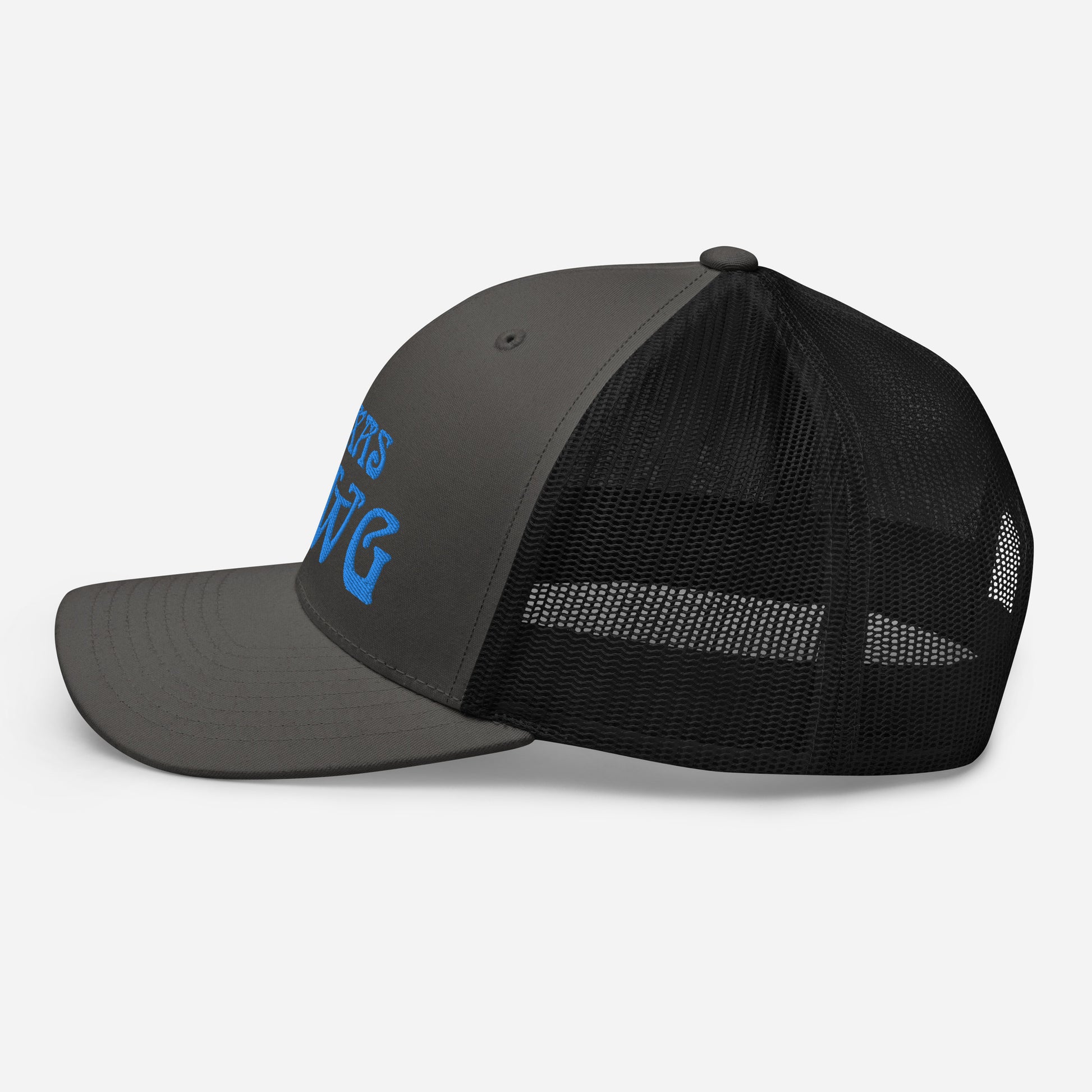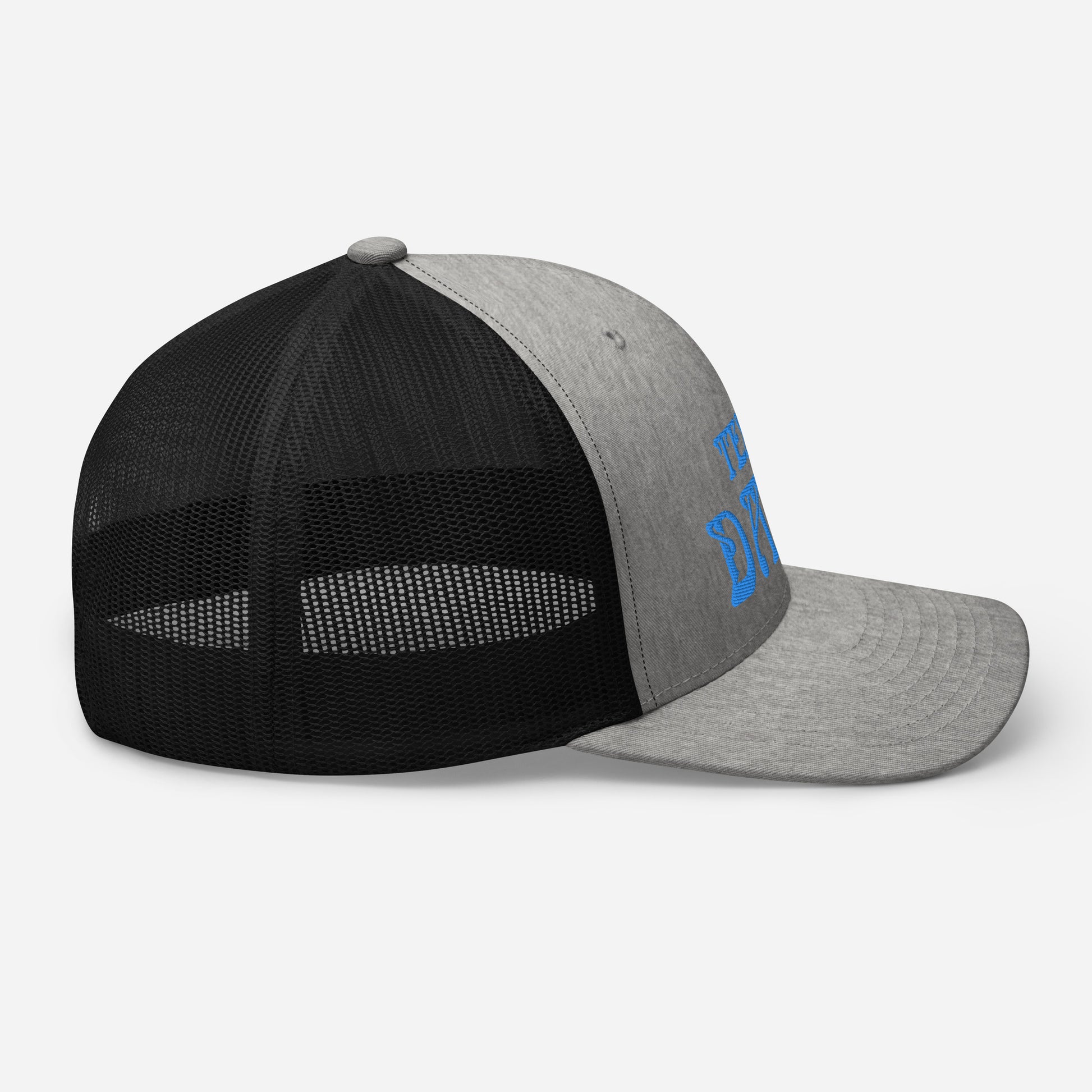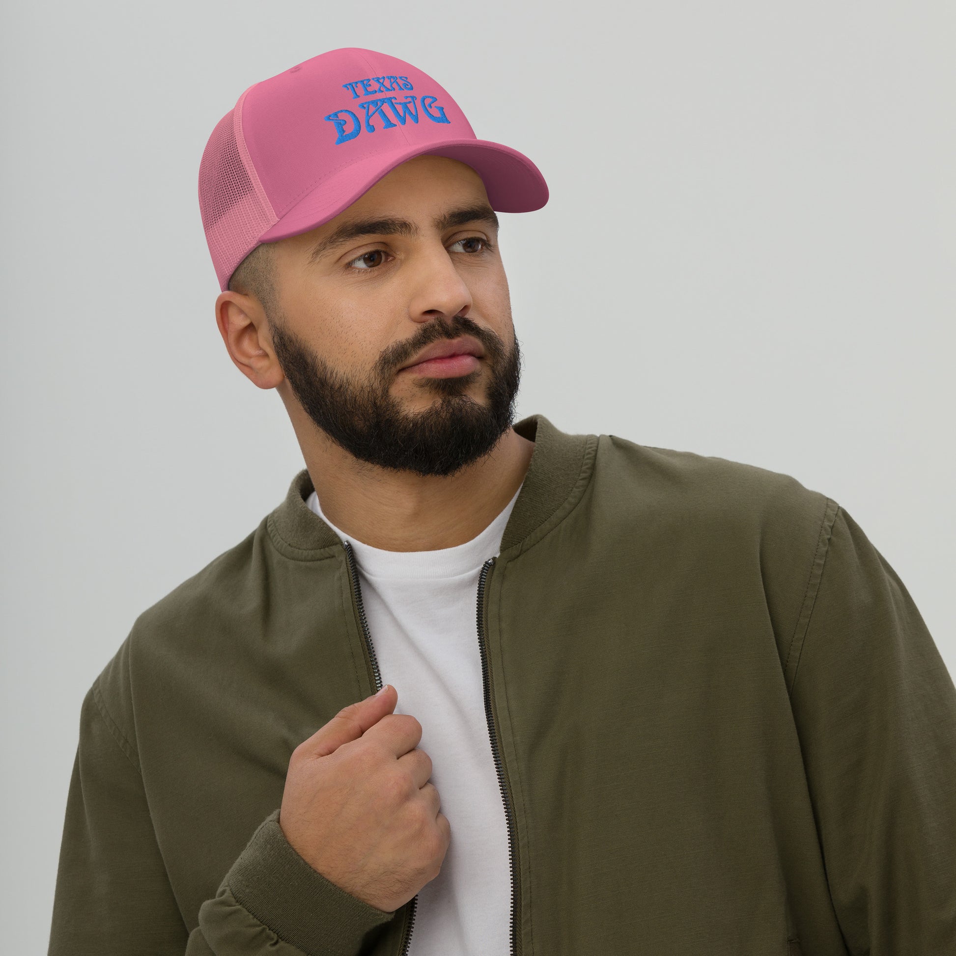 This six-panel trucker cap with a mesh back will be a comfy and classic choice for a perfect day in the sun or a funny trucker cap perfect for crazy hat day. Texas Dawg is embroidered on the front in a fancy font and our iconic blue color.