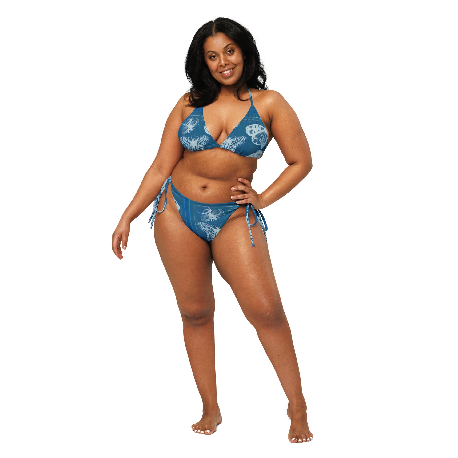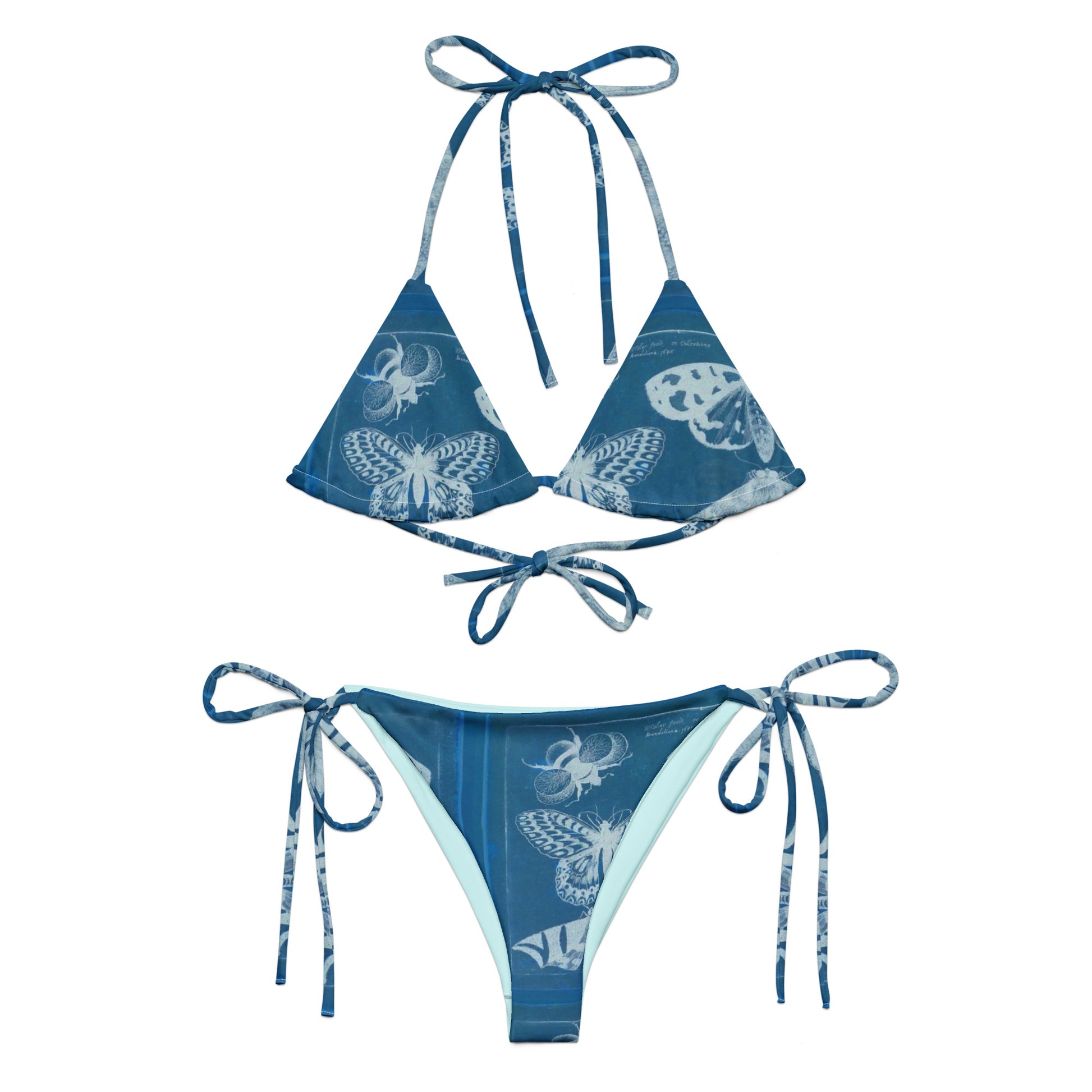 Unveil the beauty of nature with our Recycled Butterflies & Bees String Bikini. Crafted from sustainable materials, this swimwear not only showcases your commitment to the environment but also embraces a timeless elegance. Against a tranquil blue canvas, delicate white stencil sketches of butterflies and a delightful bumblebee come to life. The artistic simplicity of this print captures the gentle nature of butterflies and the buzzing energy of bees, creating a harmonious balance between eco-conscious fashion and natural grace. Step into the pool with confidence and style.