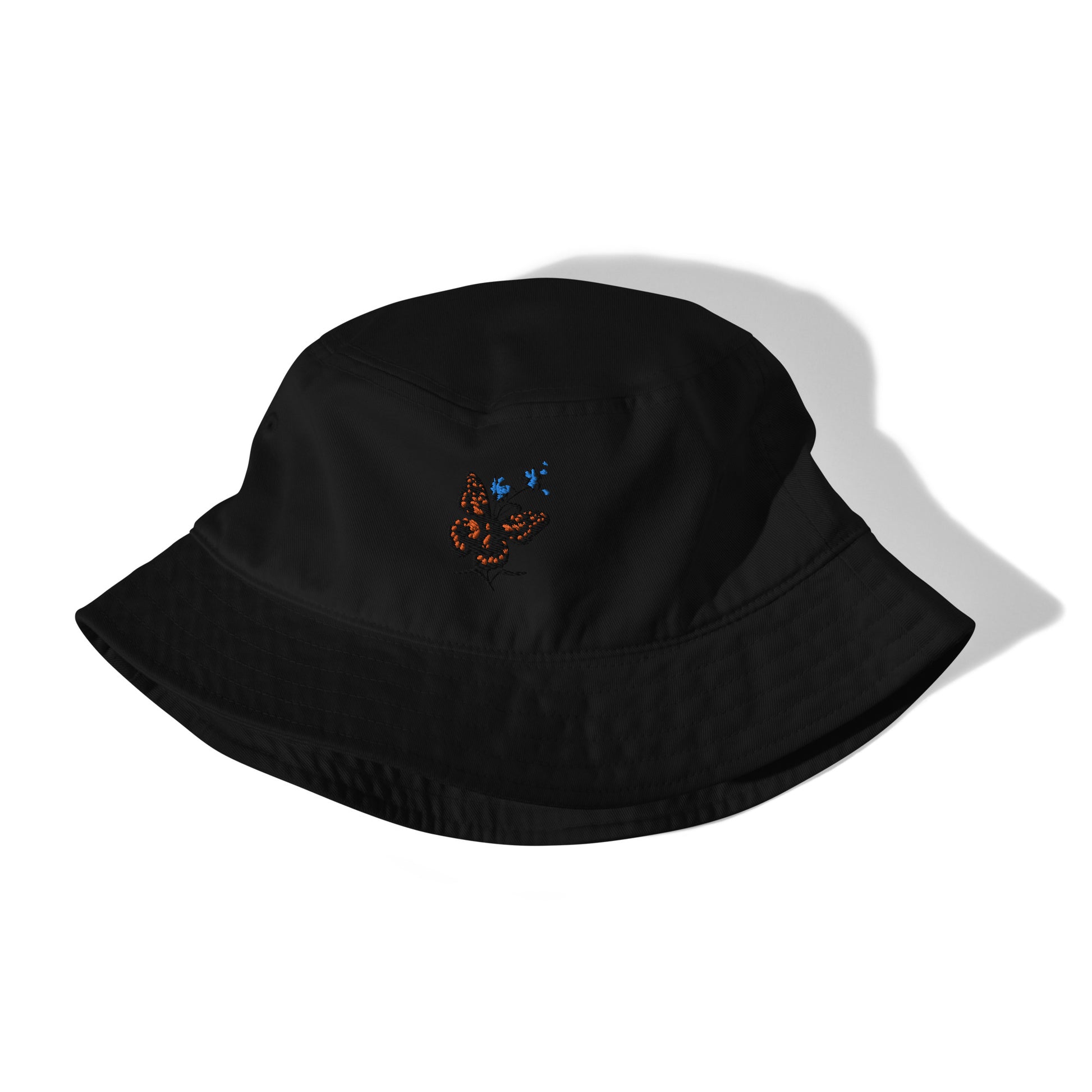 Introducing our Eco-Conscious Butterfly and Flower Bucket Hat, a sustainable accessory that celebrates the beauty of nature. Crafted with care using eco-friendly materials, this bucket hat features an elegant black and orange butterfly surrounded by enchanting black and blue flowers, all meticulously embroidered on the front.
