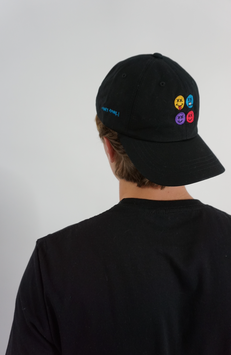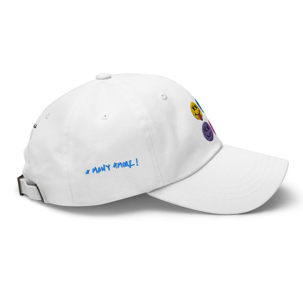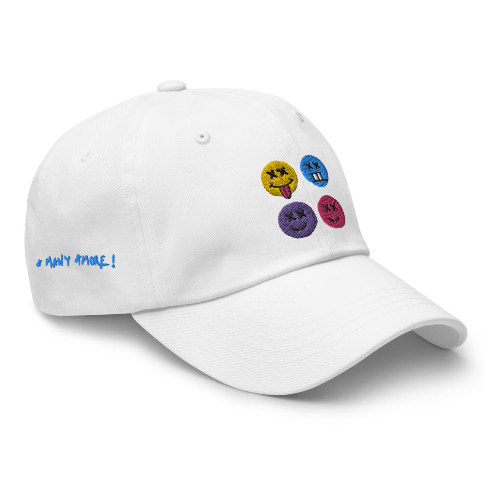 Dad hats aren't just for dads. This one's got a low profile with an adjustable strap and curved visor. Featuring our + MANY AMORE! original emoji faces embroidered on the front. Inspired by the past year's many moods, the faces celebrate FS7's first birthday. A slight change from the original colored print, the first face is yellow, sticking out a pink tongue for a silly mood. Wanting to use roman numerals in the design, the blue face originates from XXIII, a subtle nod to out Founder's birthday being in 1997, The XX turned into the eyes and the III became the mouth. This face, next to the first one, stays consistent from the original print color. The two smiling faces below, are reimagined in purple and neon pink. The right side of the hat reads "+ MANY AMORE!" in our signature hand-painted font style, embroidered in a vibrant blue. On the back, the Formula S7 logo is embroidered in black. Practical and stylish, choose between 5 different color choices to perfectly match your outfits and personality!