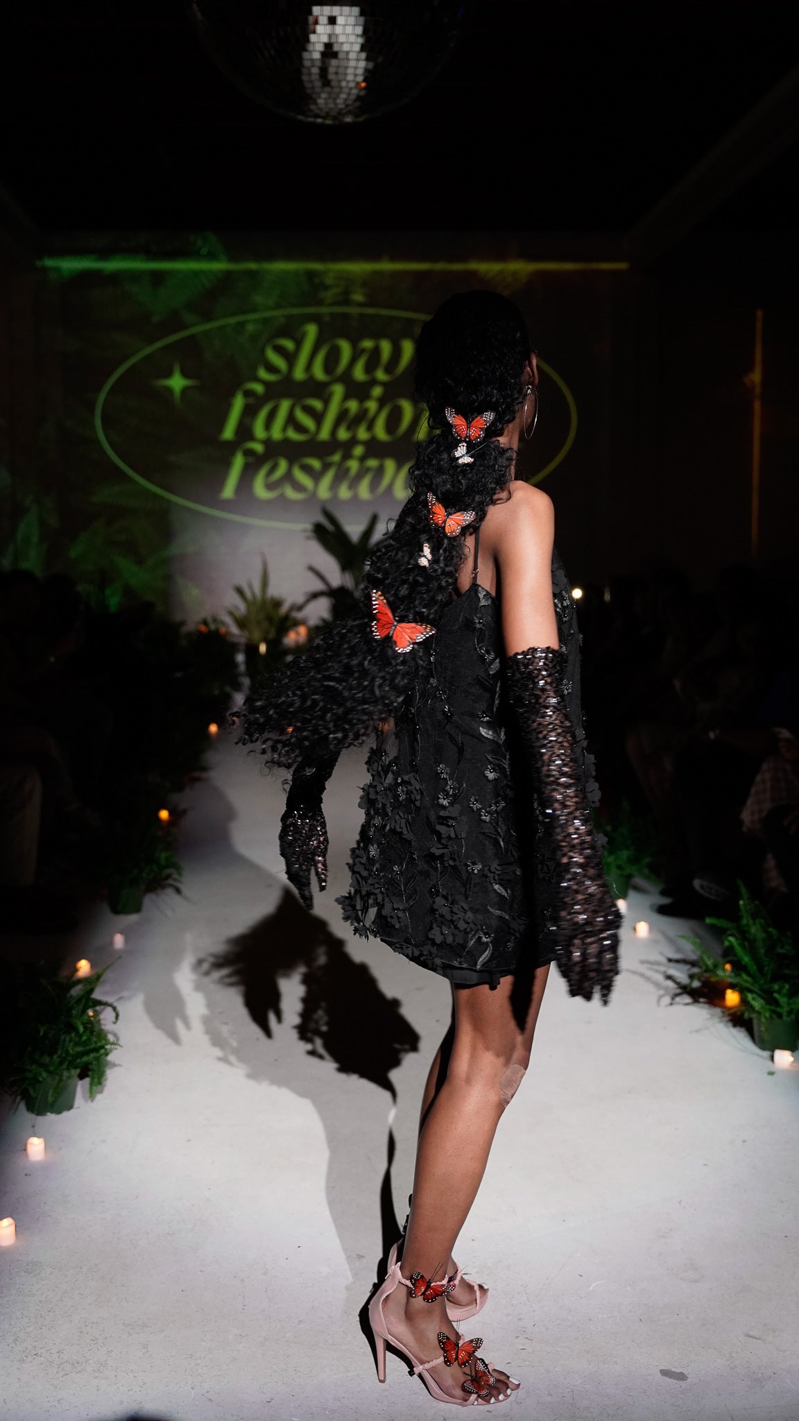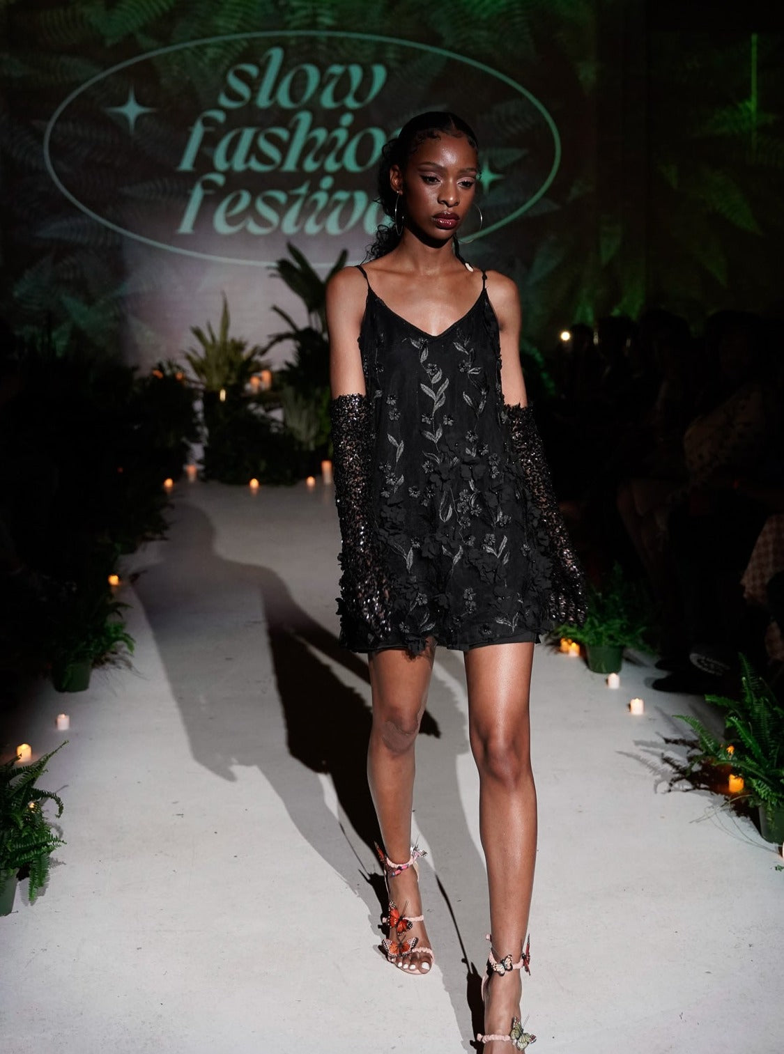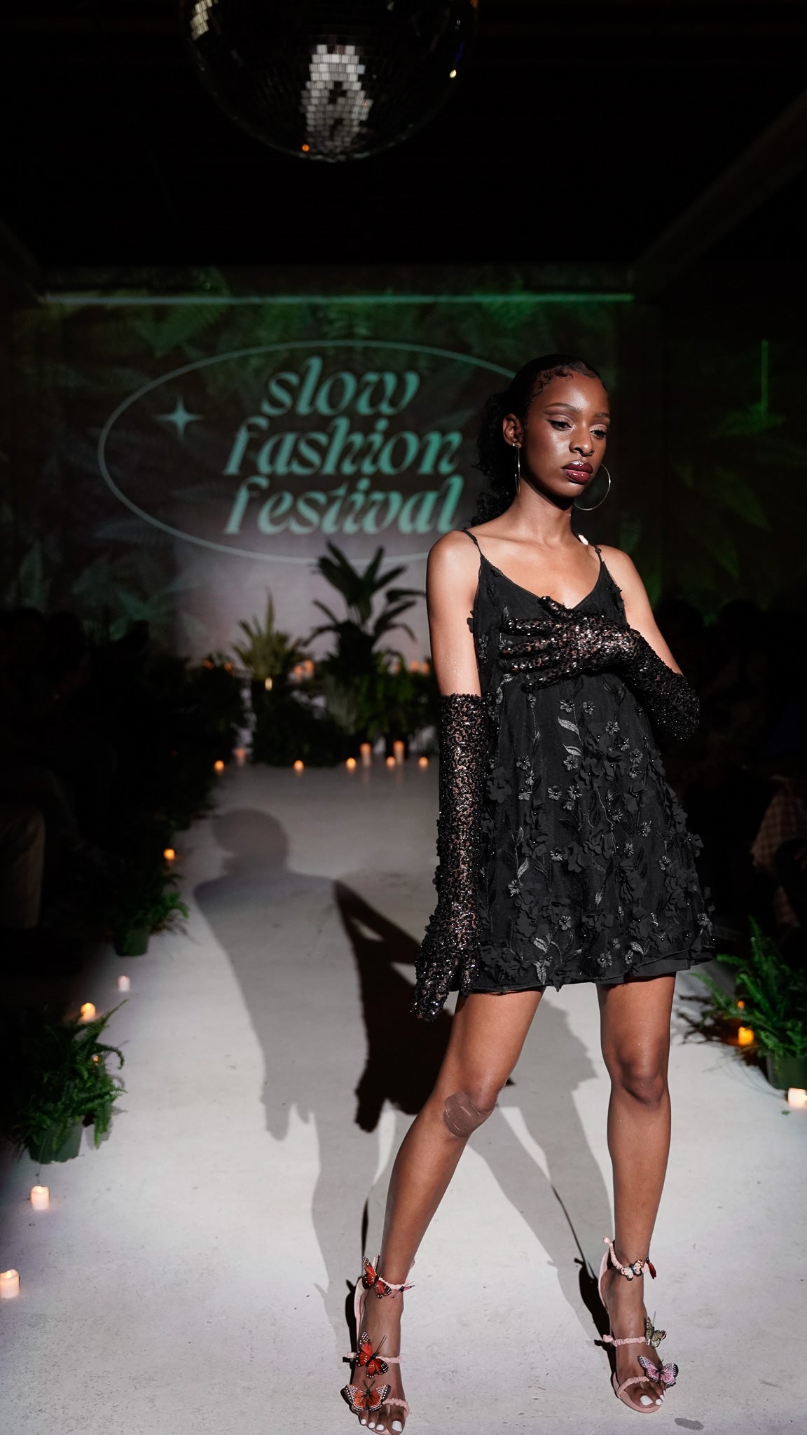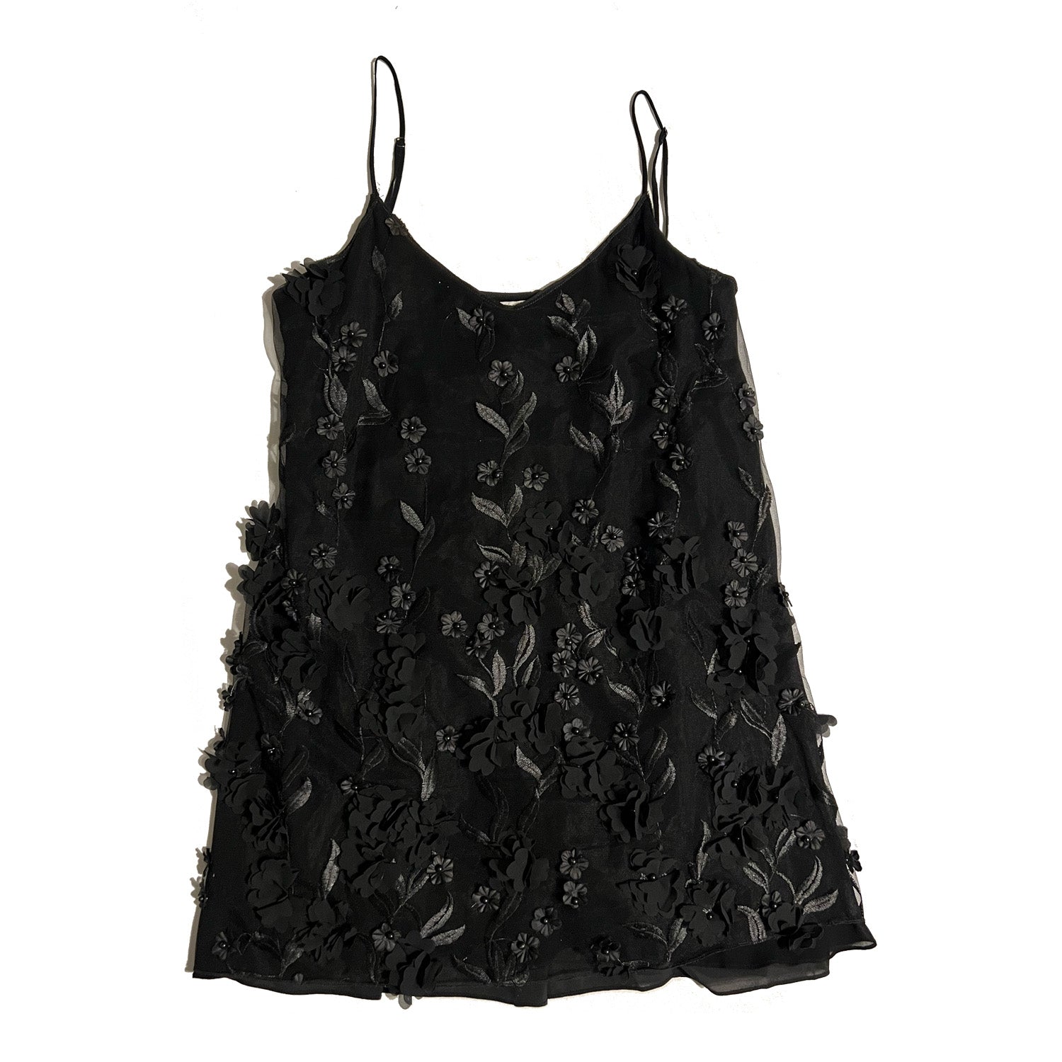 A perfect blend of elegance, sustainability, and timeless style. This stunning piece is not just a dress; it's a statement of conscious fashion. Crafted with care, this black mini dress is up-cycled, embodying our commitment to sustainability. By repurposing materials, we've created a garment that not only enhances your style but also reduces environmental impact. Adorned with delicate black floral appliqués, this mini dress exudes a subtle charm. The floral embellishments add a touch of femininity and grace, making it an ideal choice for various occasions, from a night out on the town to a special event.