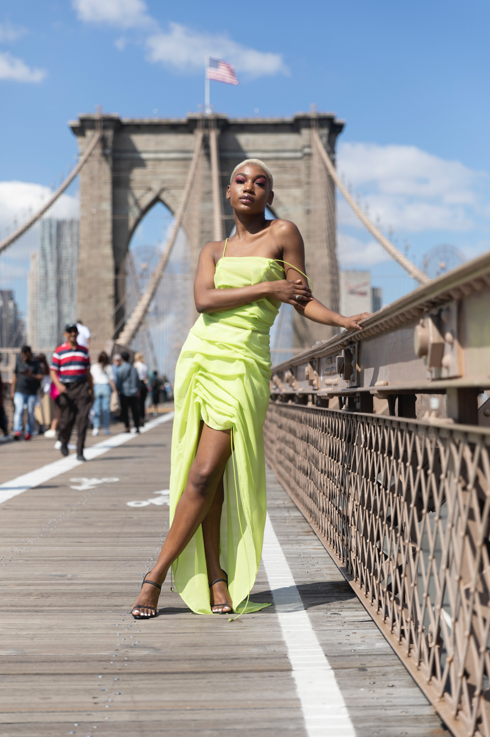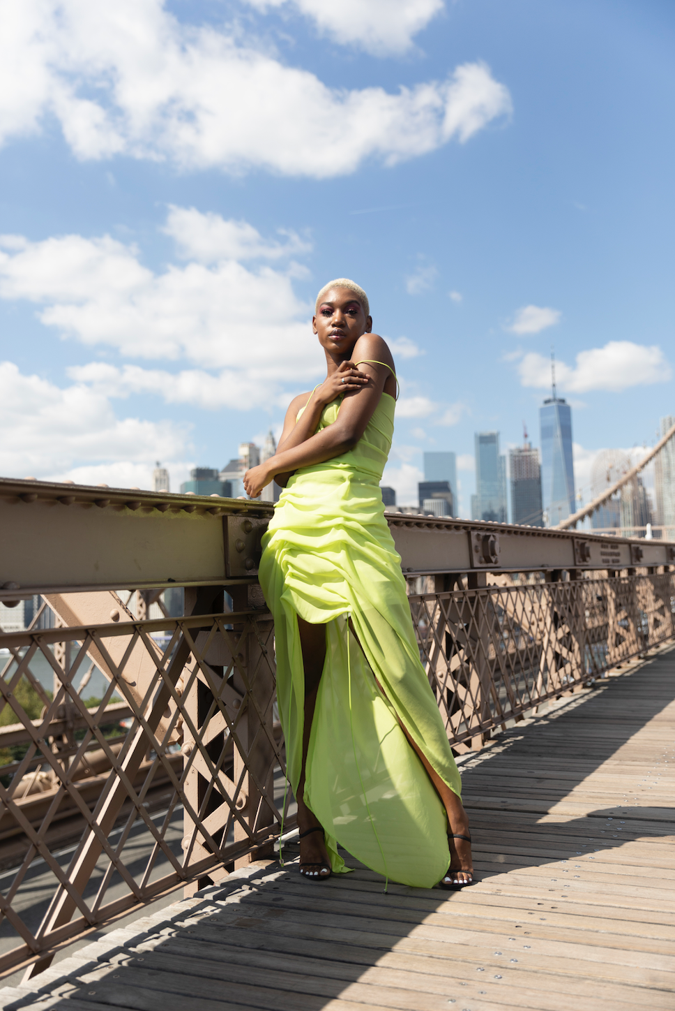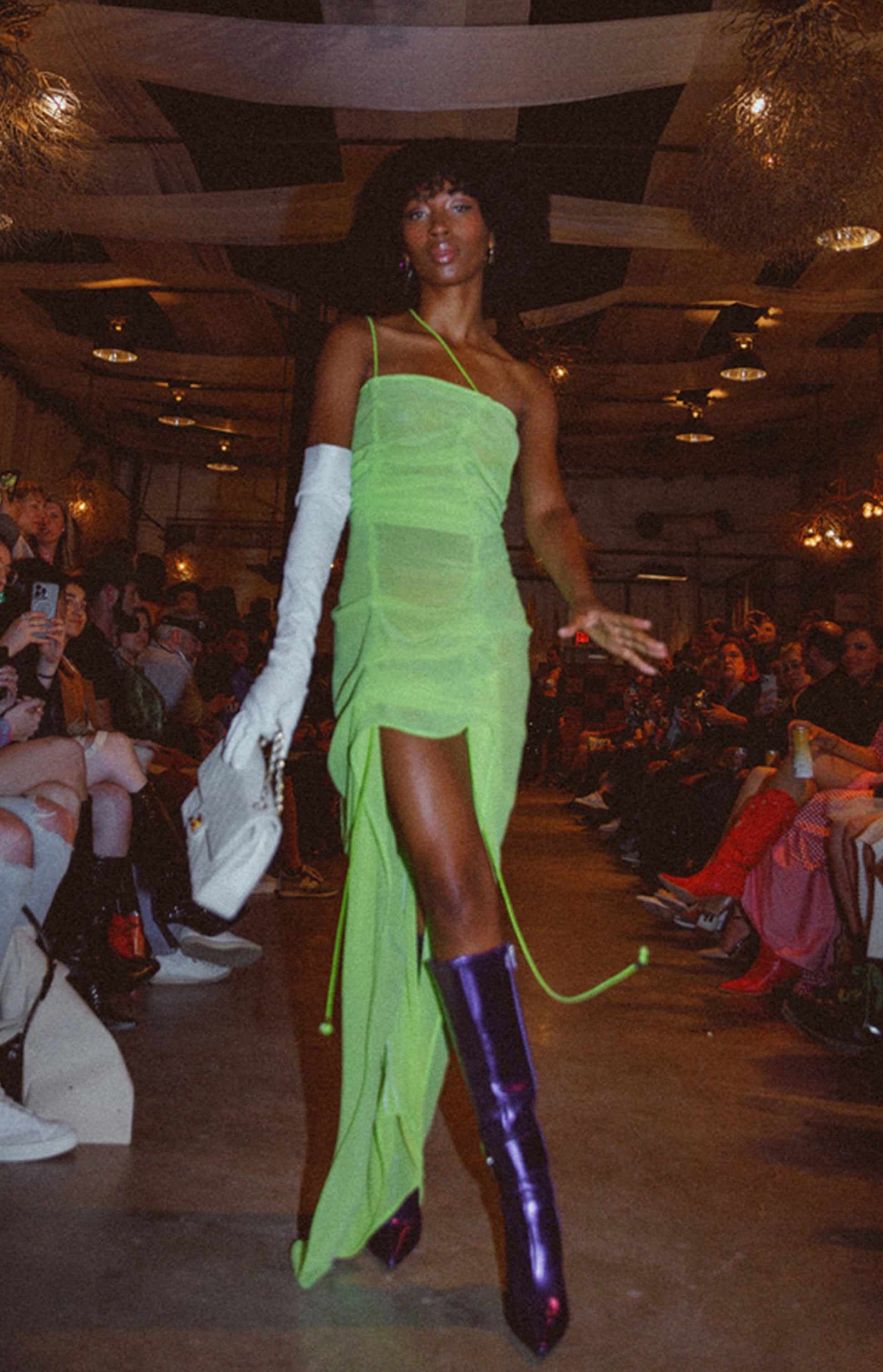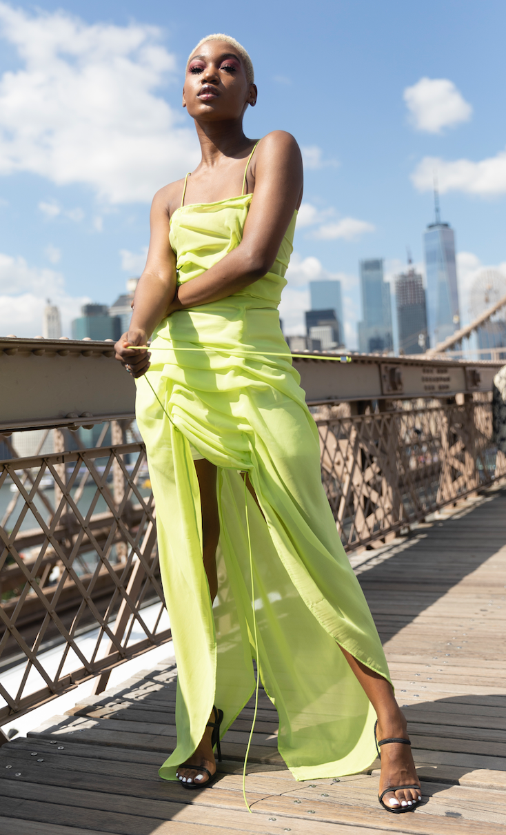 An organically hand draped dress, in a sheer light green silk fabric, allows for beautiful ruching down the princess seams that don't hold a heavy weight. The original technique used with each stitch done by hand boasts beautiful gatherings that can be easily transformed to the length and amount of ruching you want on the front. The bungee cord spaghetti straps run all the way down the princess seams and hang to the floor for a subtle sporty element. The back, center zipper allows you to easily slip the dress on and off. With stitched ruching at the zipper seams it forms a beautiful shape to hug the curves of your body. Wear this luxurious, flowy gown for a bold and daring, yet pretty look. You can dress this up for a wedding, parties, date-night and more, or dress it down for a street-style statement. Pairs well with a black body suit or undergarments of your choice.