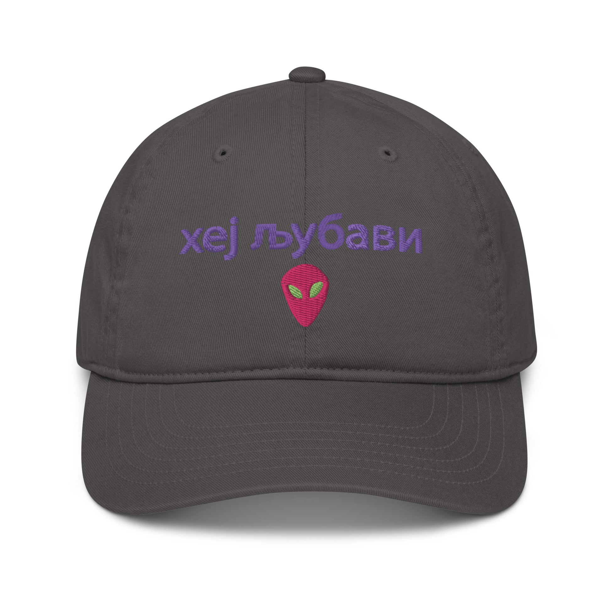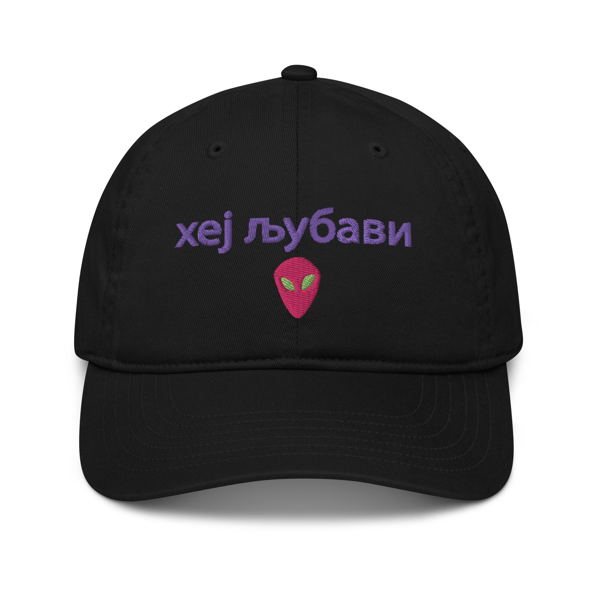 The centerpiece of this remarkable hat is the embroidered pink alien face with enchanting green eyes. This whimsical and captivating design element adds a touch of otherworldly charm to your ensemble, inviting curiosity and sparking conversations wherever you go. Above the alien face, the phrase "Hey Love" is elegantly embroidered in Serbian Cyrillic script. The bold and eye-catching purple color of the embroidery further enhances the visual appeal, while the message transcends language barriers, spreading love and positivity to all who encounter it.