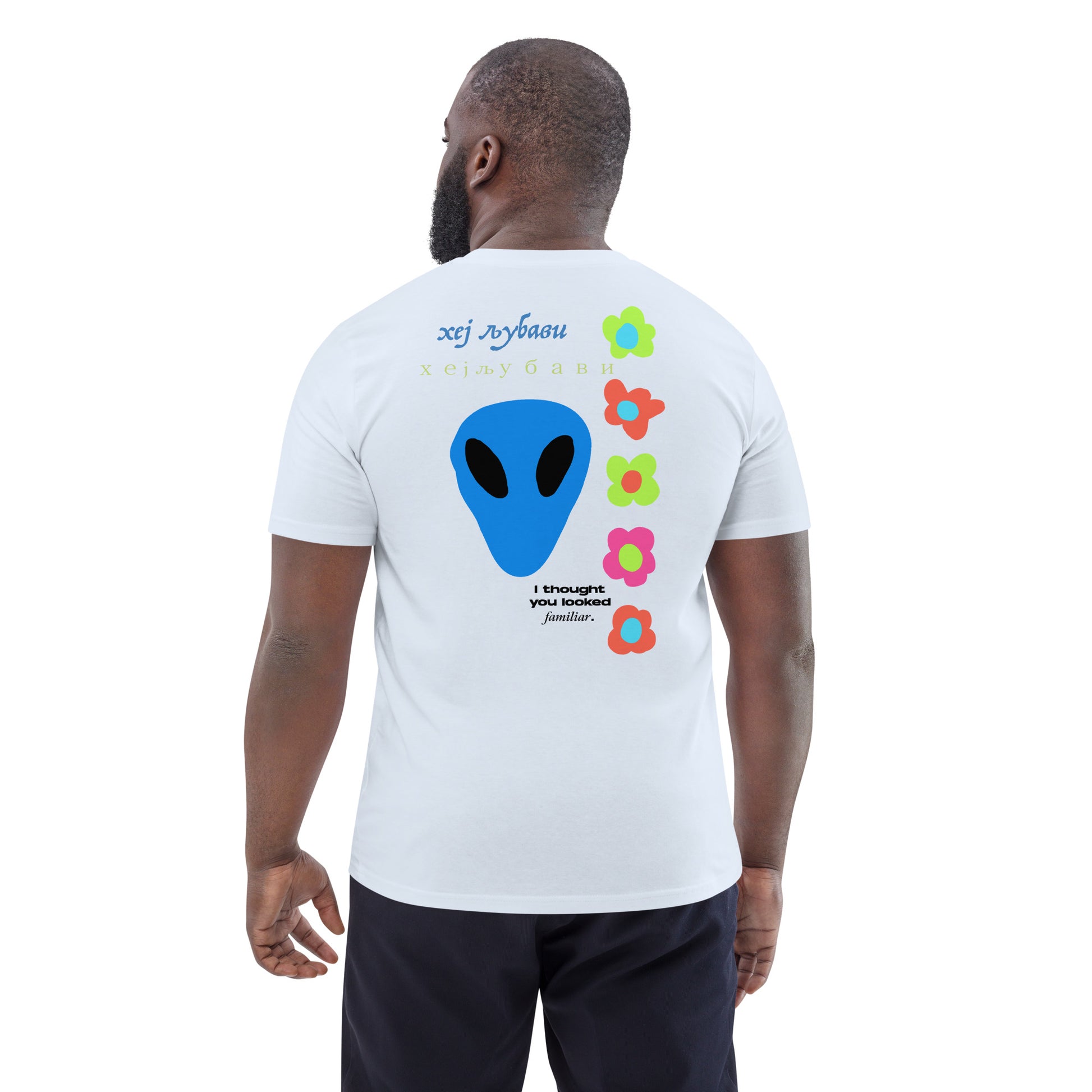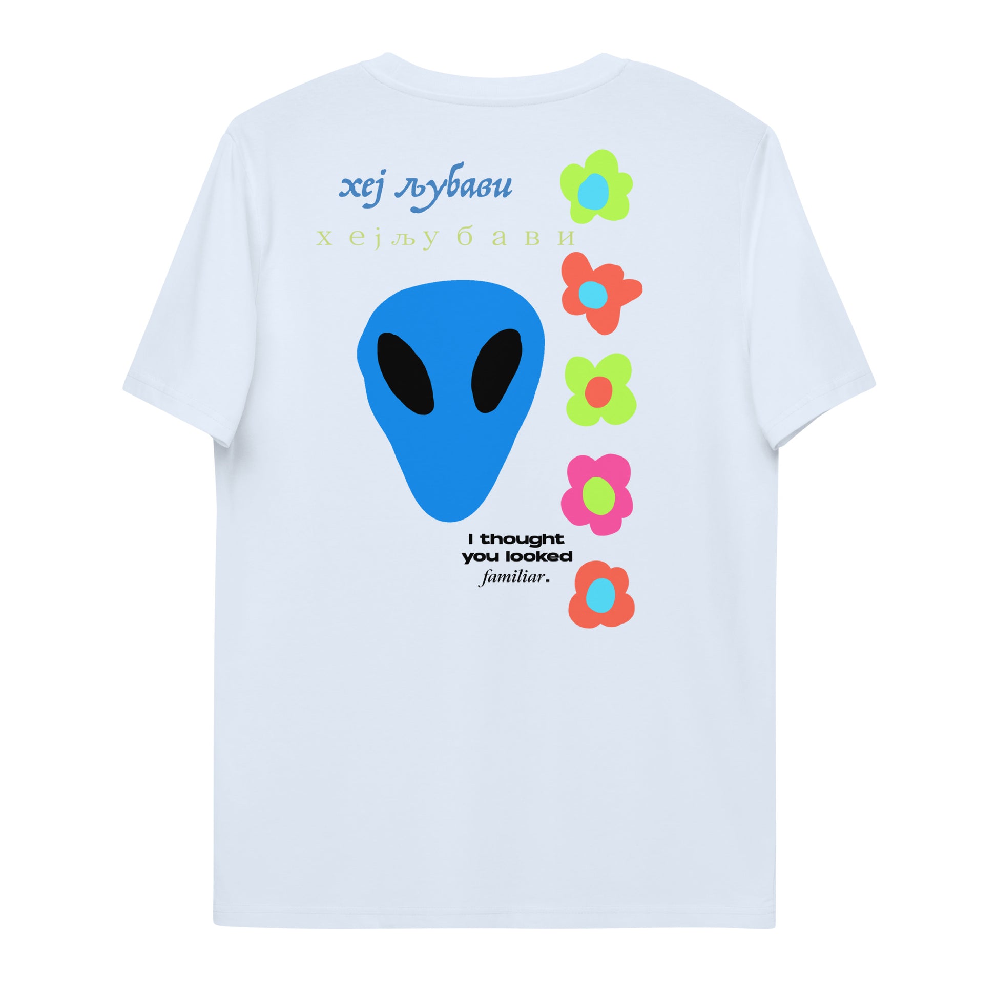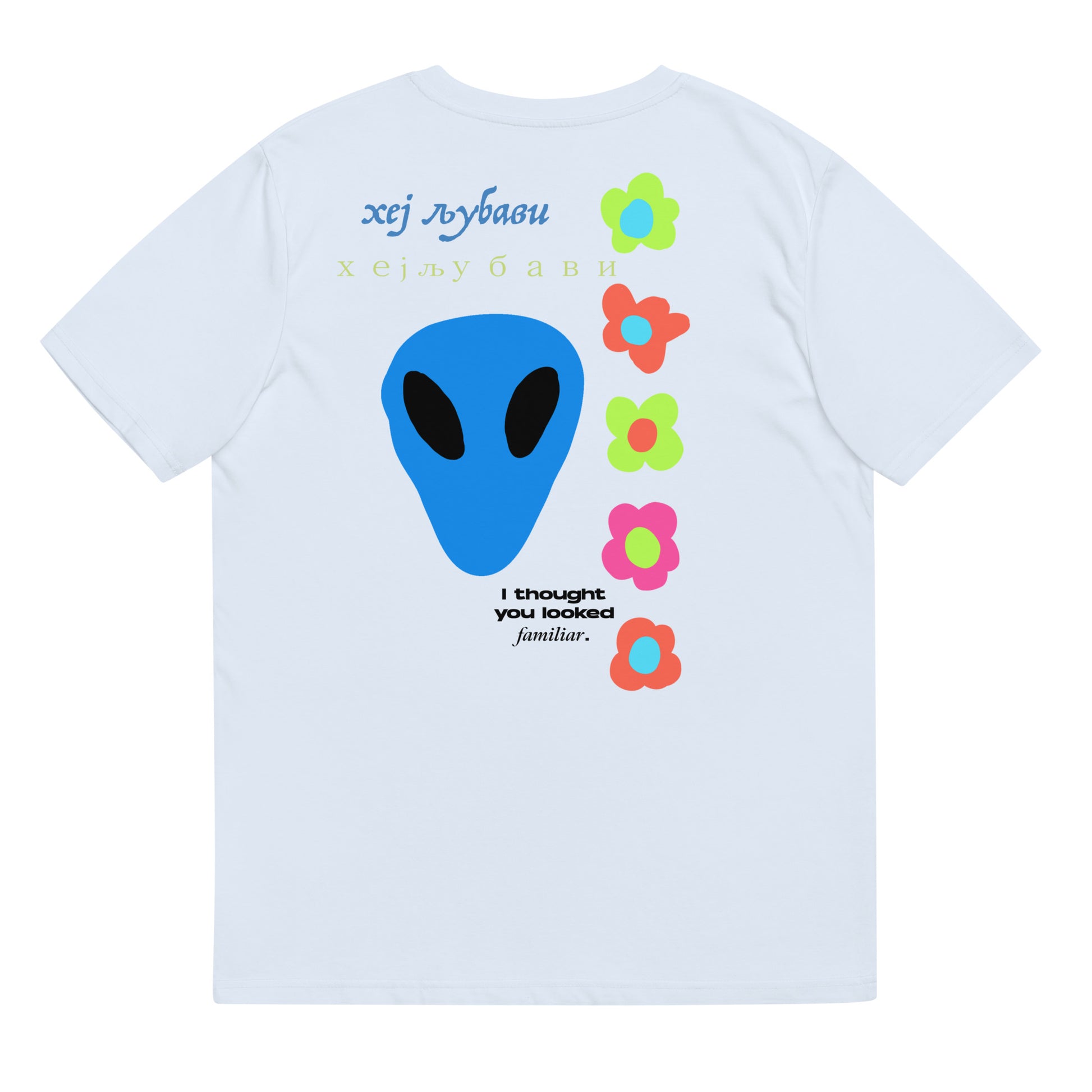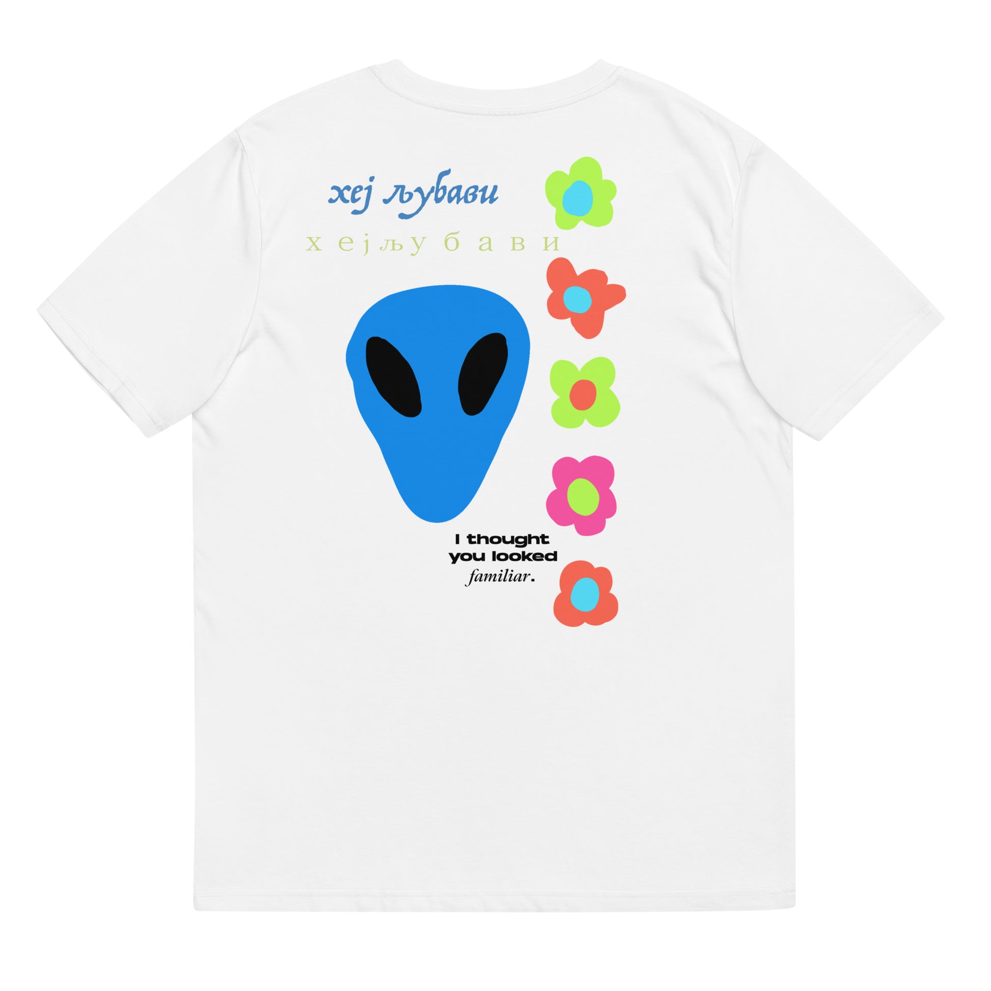 On the back of this extraordinary tee is a bold and captivating print. Vibrant florals, symbolizing growth and vitality, come to life in a burst of colors, creating an eye-catching visual feast. Nestled amidst the florals, a blue alien face adds a touch of whimsy and intrigue, inviting curiosity and sparking conversations about the wonders of the universe. Incorporating cultural elements, the phrase "Hey Love" is prominently displayed in Serbian Cyrillic script at the top of the tee. This timeless message of love and connection transcends linguistic barriers, serving as a powerful reminder to spread positivity and compassion. At the bottom of the tee, the phrase "I thought you looked familiar" adds a playful touch of nostalgia and intrigue. This clever expression invites others to engage and connect, fostering conversations and forging new connections.
