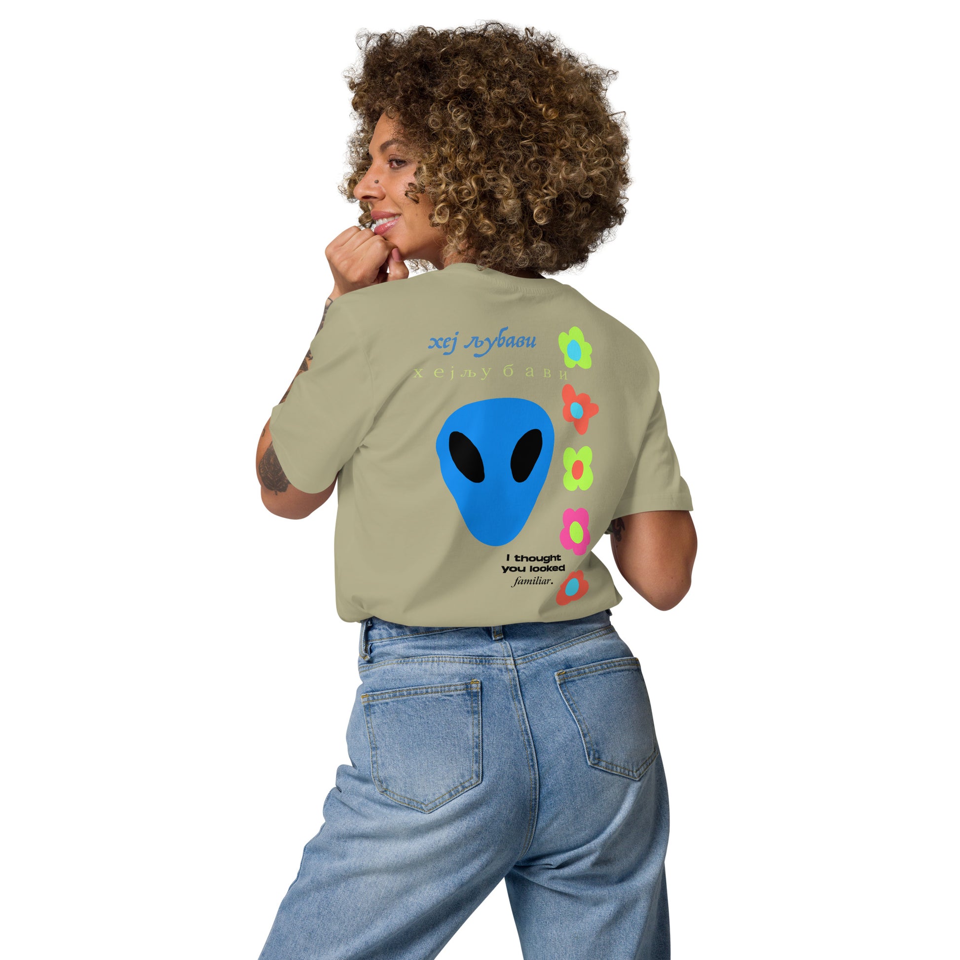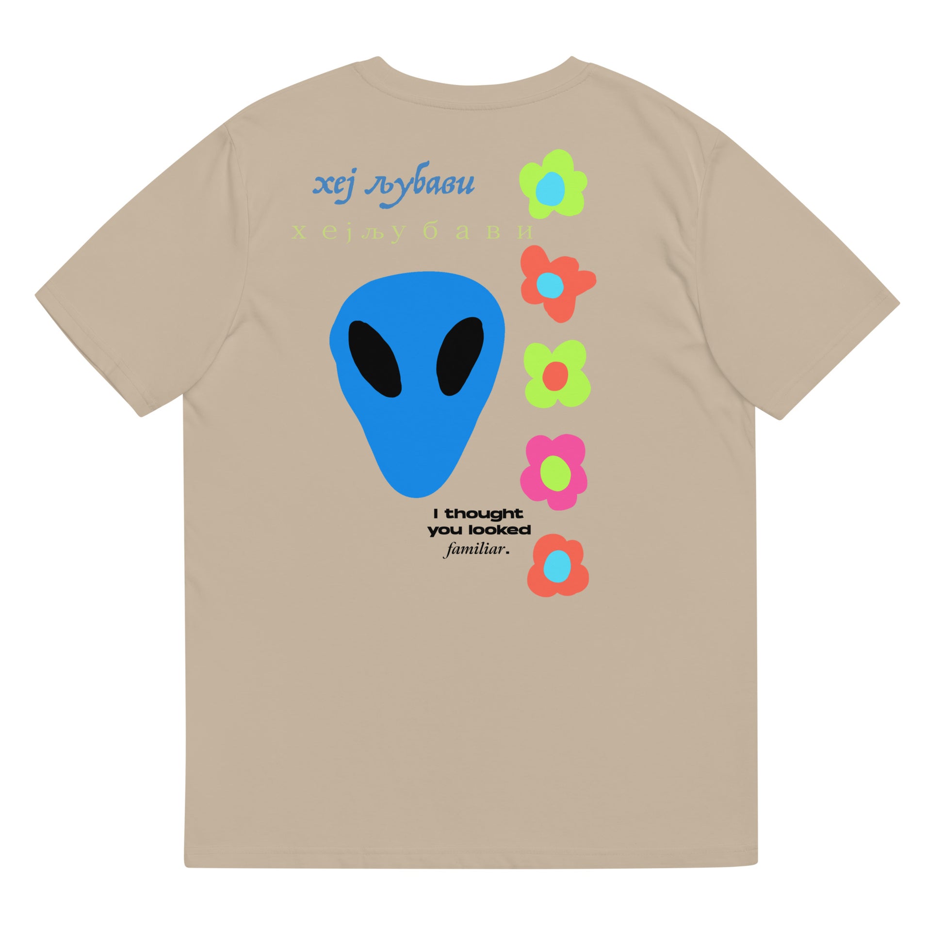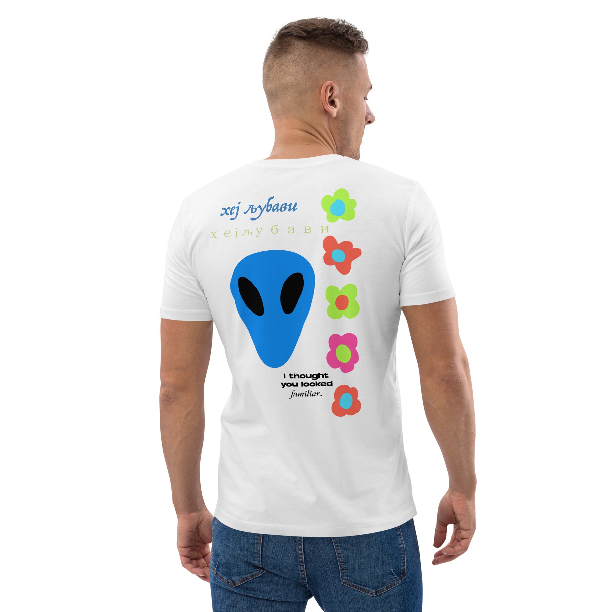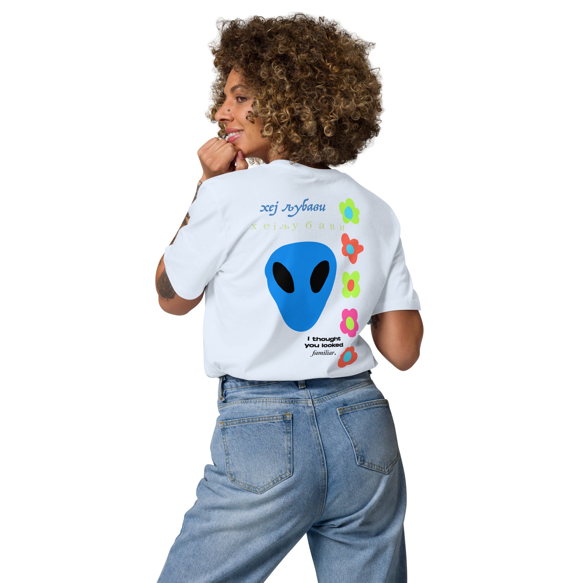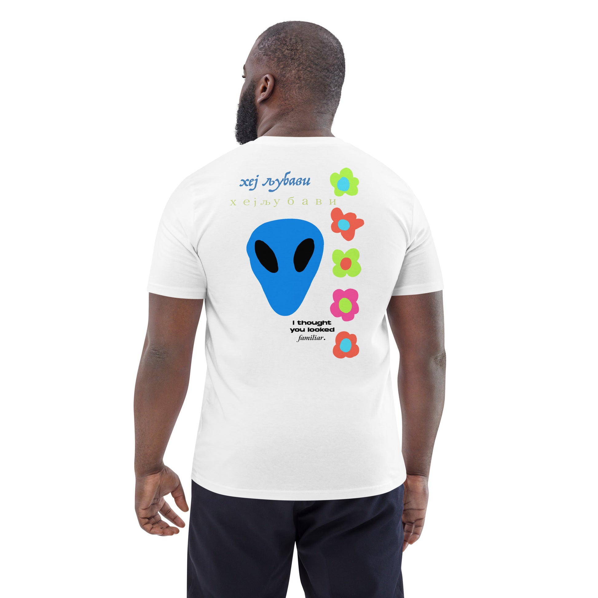 On the back of this extraordinary tee is a bold and captivating print. Vibrant florals, symbolizing growth and vitality, come to life in a burst of colors, creating an eye-catching visual feast. Nestled amidst the florals, a blue alien face adds a touch of whimsy and intrigue, inviting curiosity and sparking conversations about the wonders of the universe. Incorporating cultural elements, the phrase "Hey Love" is prominently displayed in Serbian Cyrillic script at the top of the tee. This timeless message of love and connection transcends linguistic barriers, serving as a powerful reminder to spread positivity and compassion. At the bottom of the tee, the phrase "I thought you looked familiar" adds a playful touch of nostalgia and intrigue. This clever expression invites others to engage and connect, fostering conversations and forging new connections.