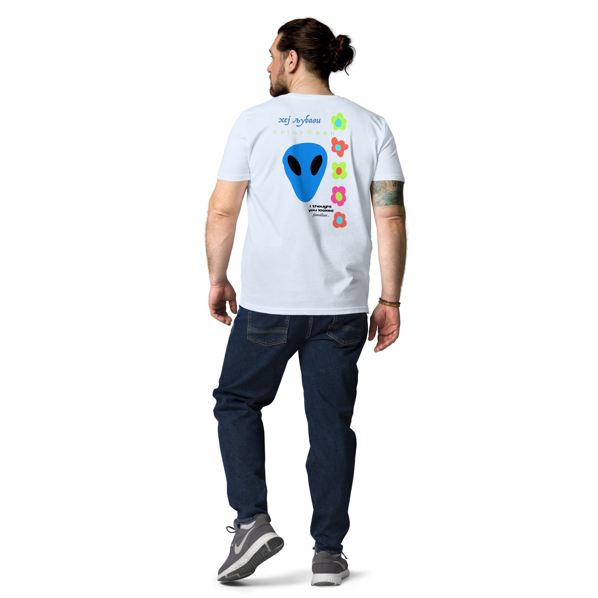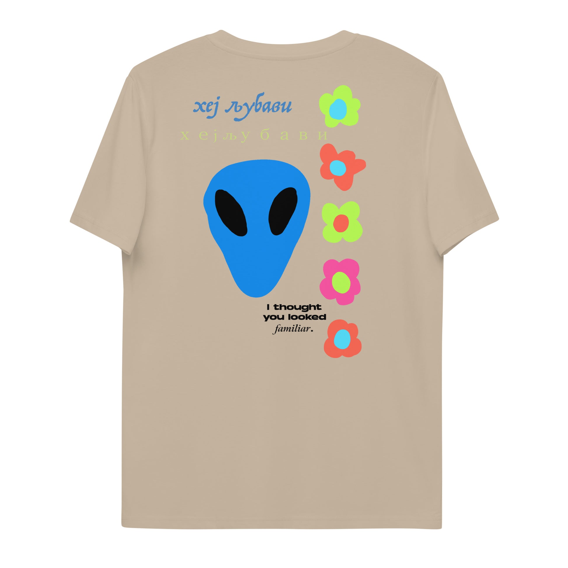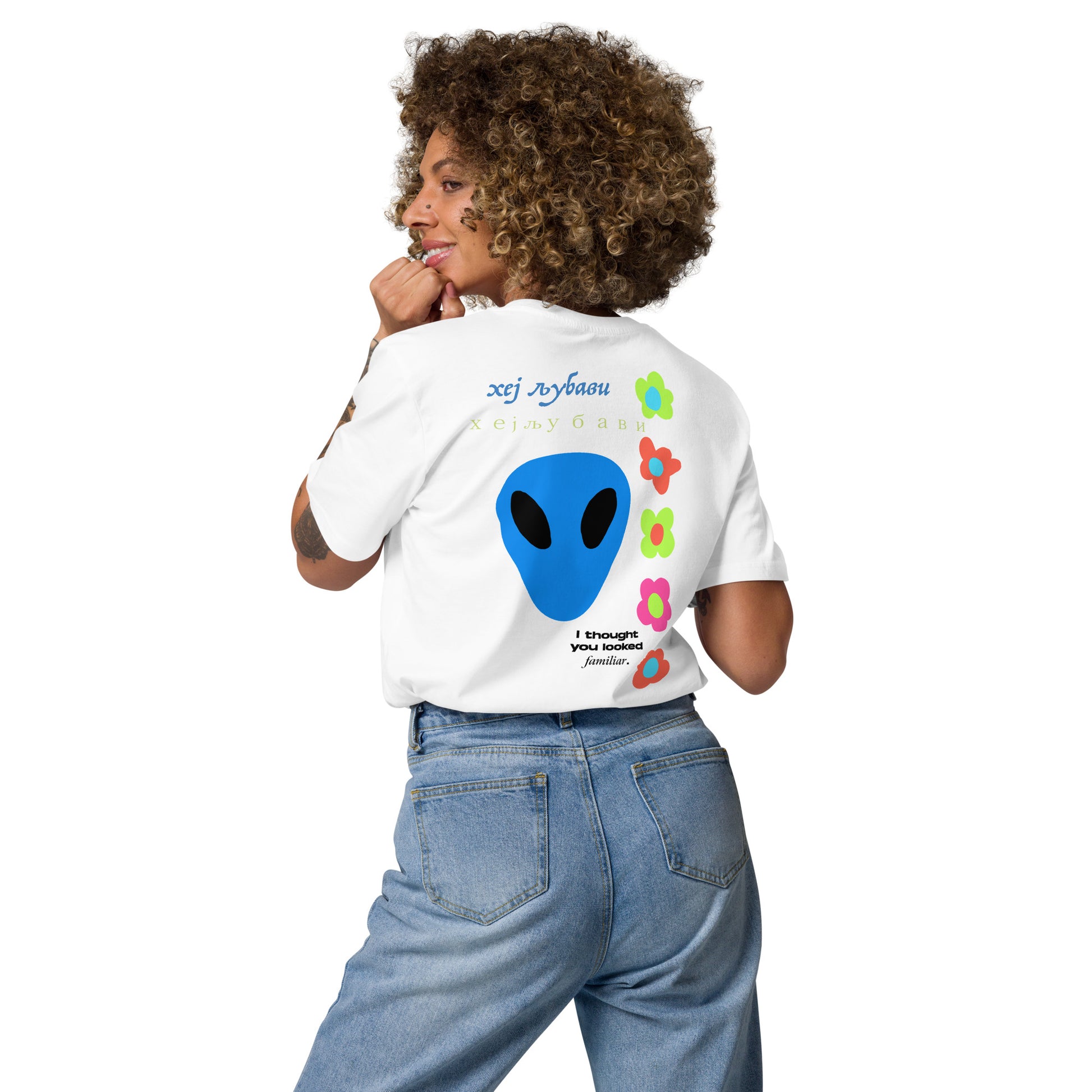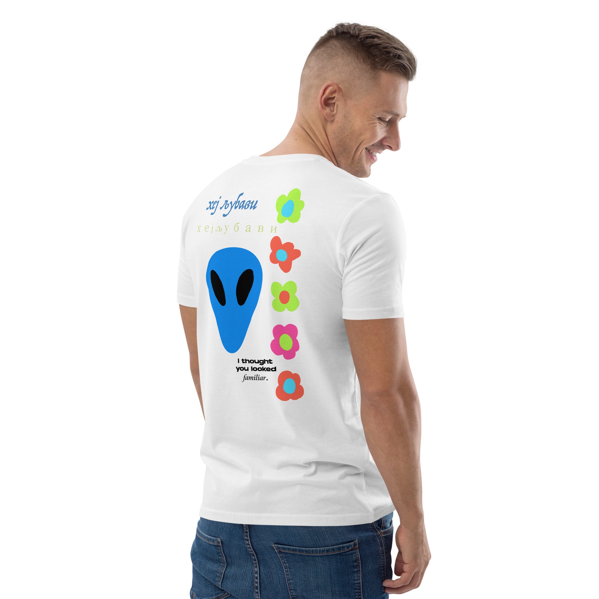 On the back of this extraordinary tee is a bold and captivating print. Vibrant florals, symbolizing growth and vitality, come to life in a burst of colors, creating an eye-catching visual feast. Nestled amidst the florals, a blue alien face adds a touch of whimsy and intrigue, inviting curiosity and sparking conversations about the wonders of the universe. Incorporating cultural elements, the phrase "Hey Love" is prominently displayed in Serbian Cyrillic script at the top of the tee. This timeless message of love and connection transcends linguistic barriers, serving as a powerful reminder to spread positivity and compassion. At the bottom of the tee, the phrase "I thought you looked familiar" adds a playful touch of nostalgia and intrigue. This clever expression invites others to engage and connect, fostering conversations and forging new connections.