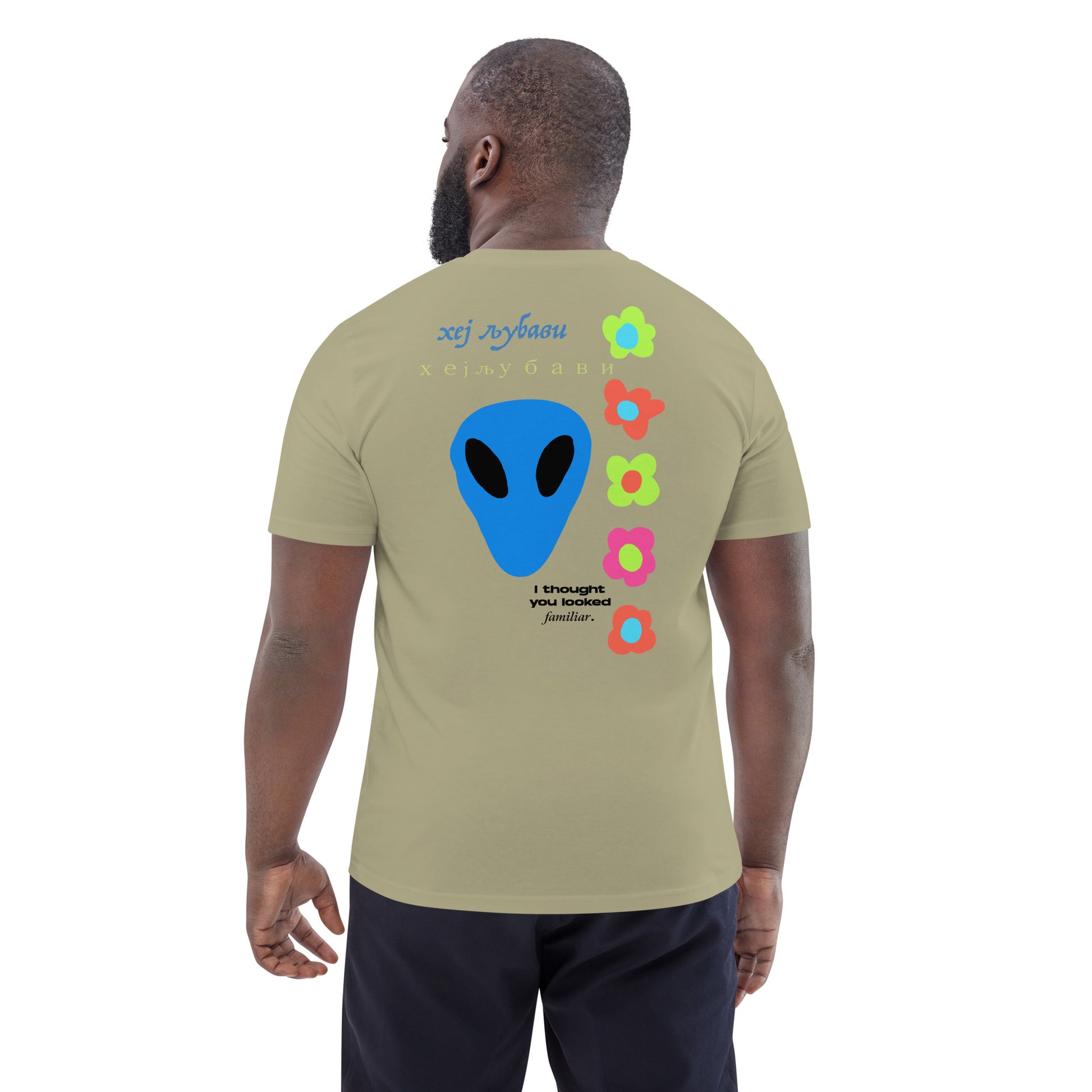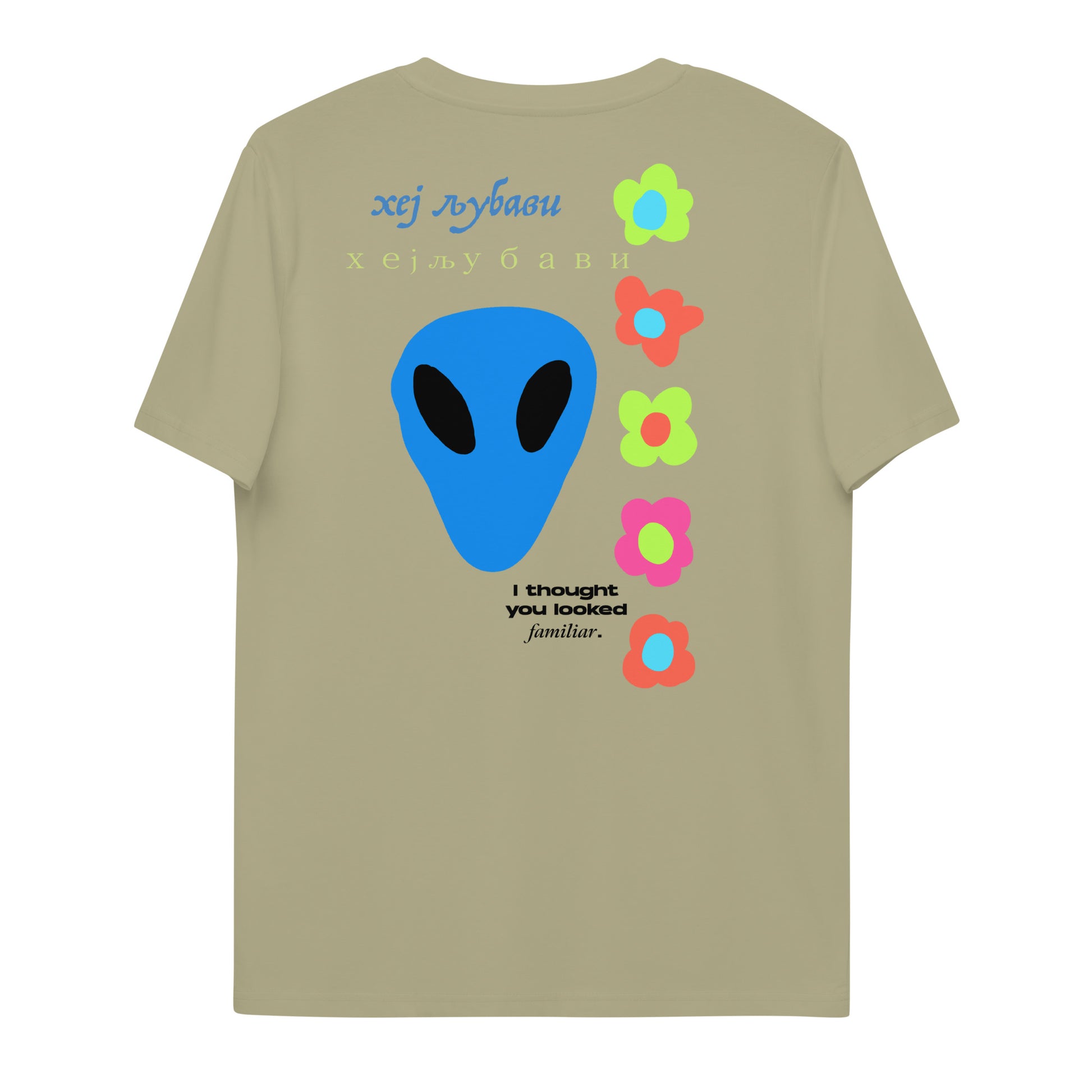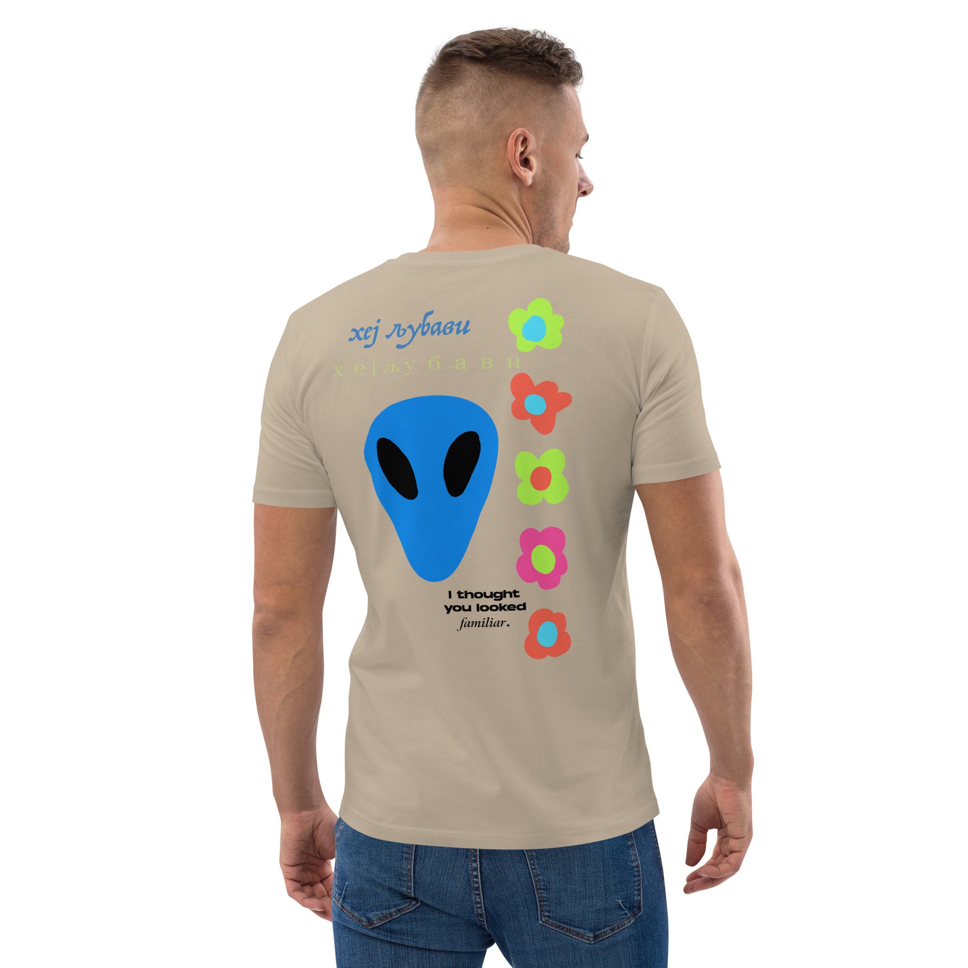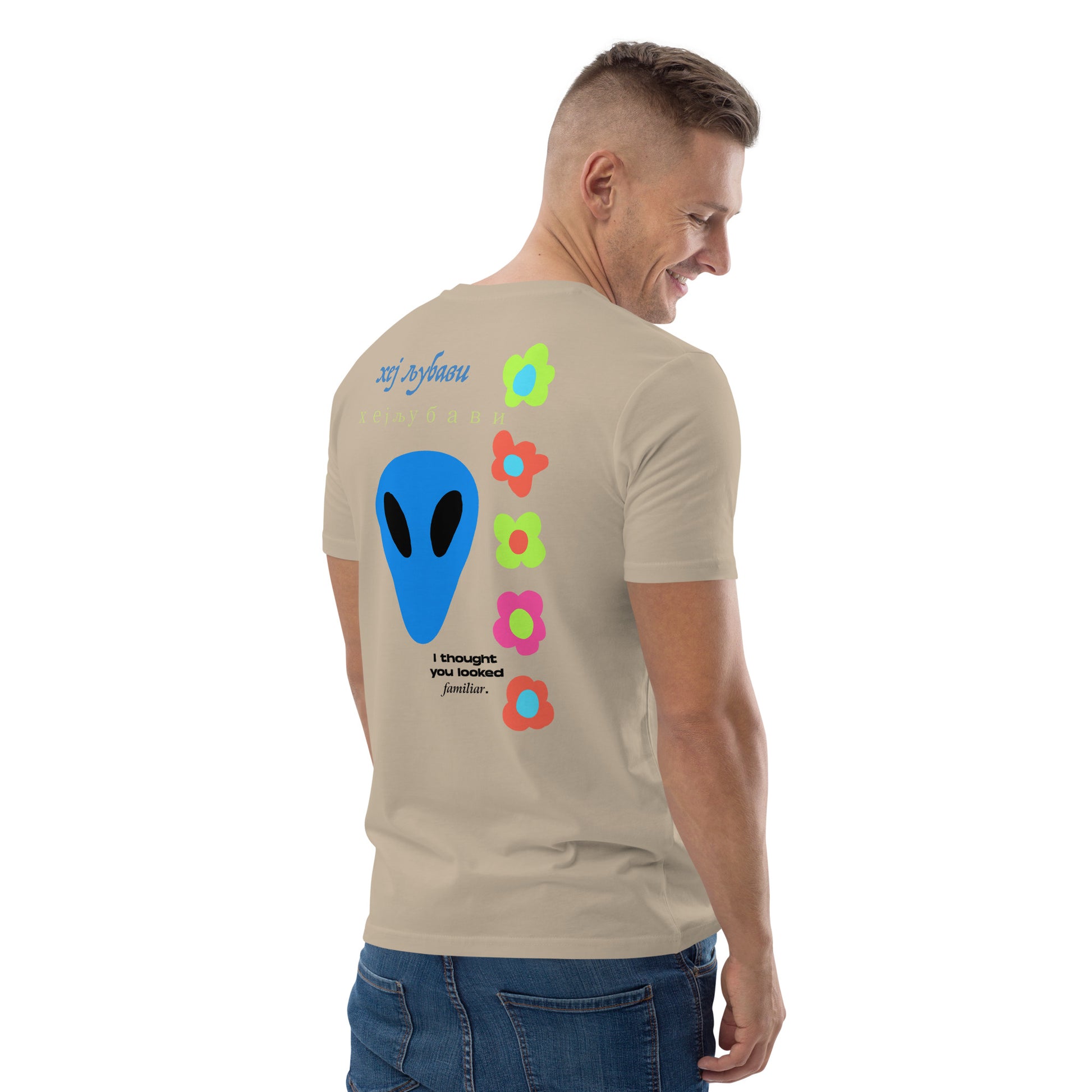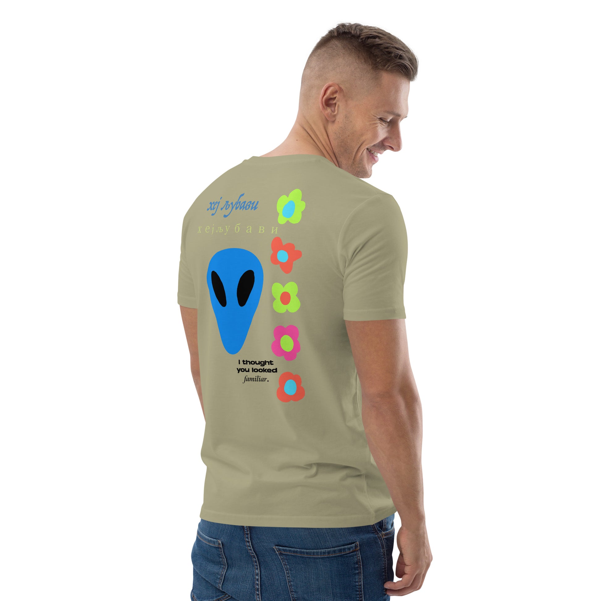 On the back of this extraordinary tee is a bold and captivating print. Vibrant florals, symbolizing growth and vitality, come to life in a burst of colors, creating an eye-catching visual feast. Nestled amidst the florals, a blue alien face adds a touch of whimsy and intrigue, inviting curiosity and sparking conversations about the wonders of the universe. Incorporating cultural elements, the phrase "Hey Love" is prominently displayed in Serbian Cyrillic script at the top of the tee. This timeless message of love and connection transcends linguistic barriers, serving as a powerful reminder to spread positivity and compassion. At the bottom of the tee, the phrase "I thought you looked familiar" adds a playful touch of nostalgia and intrigue. This clever expression invites others to engage and connect, fostering conversations and forging new connections.