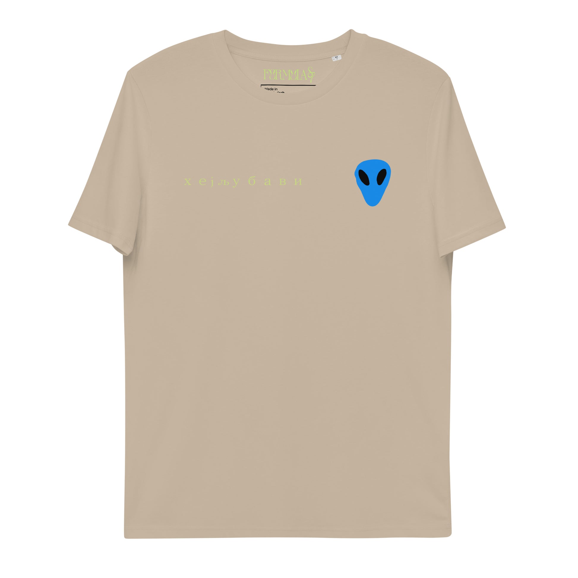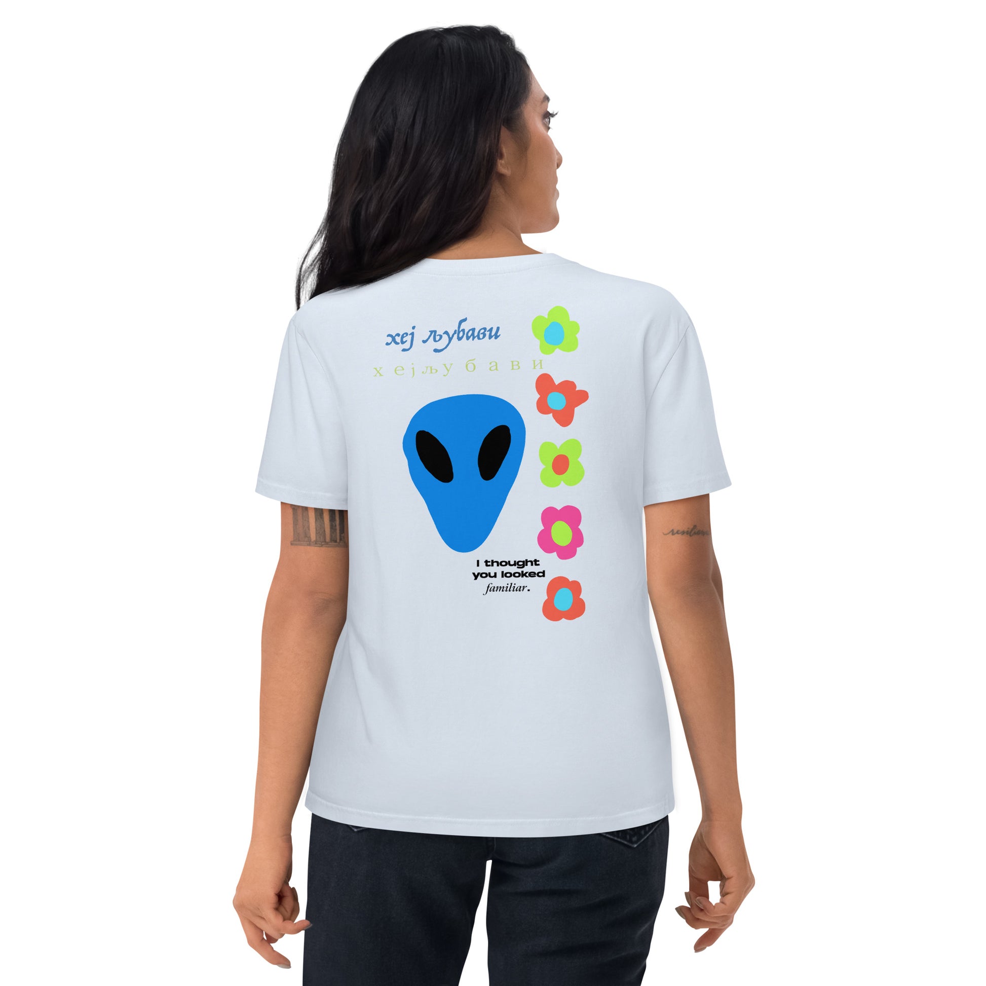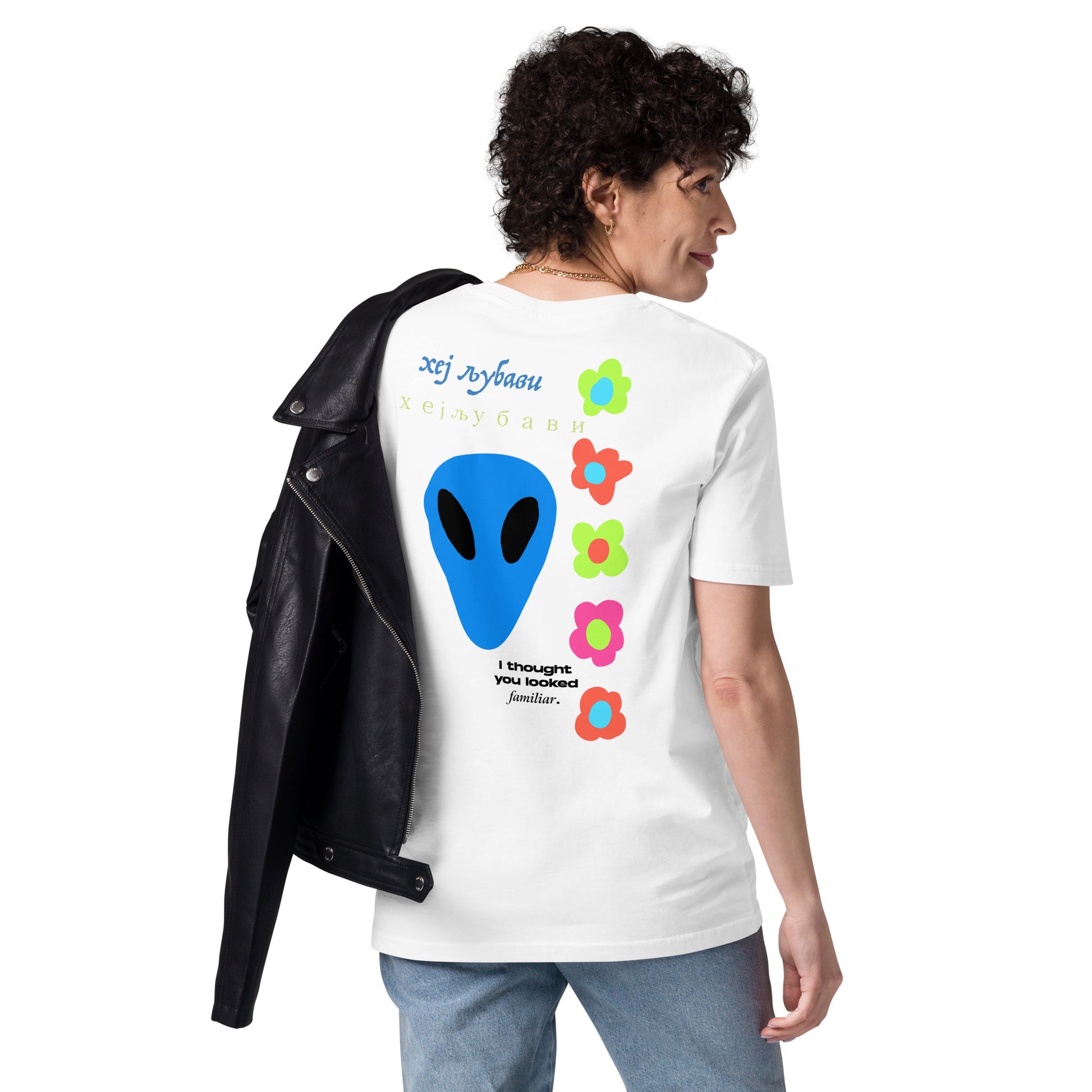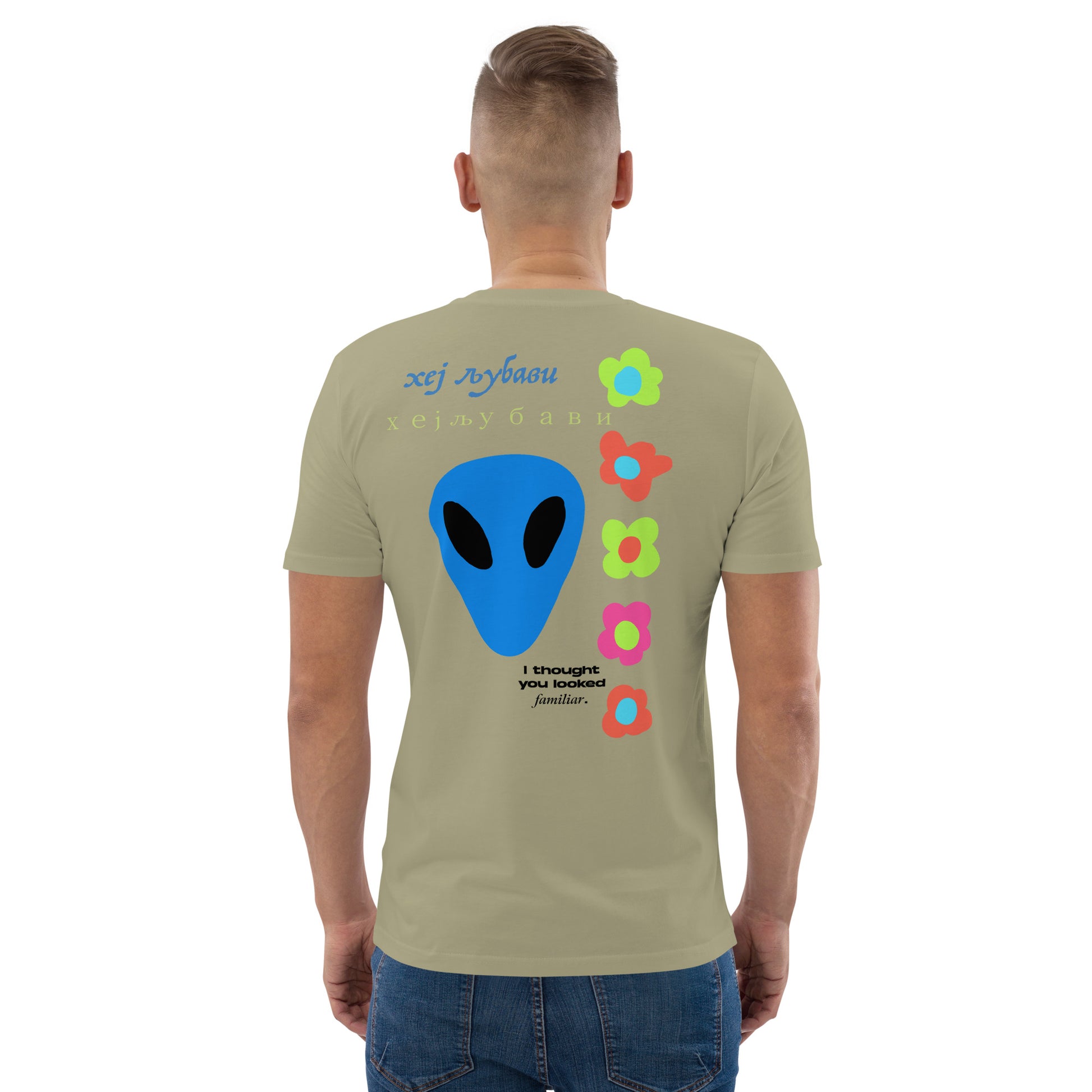 On the back of this extraordinary tee is a bold and captivating print. Vibrant florals, symbolizing growth and vitality, come to life in a burst of colors, creating an eye-catching visual feast. Nestled amidst the florals, a blue alien face adds a touch of whimsy and intrigue, inviting curiosity and sparking conversations about the wonders of the universe. Incorporating cultural elements, the phrase "Hey Love" is prominently displayed in Serbian Cyrillic script at the top of the tee. This timeless message of love and connection transcends linguistic barriers, serving as a powerful reminder to spread positivity and compassion. At the bottom of the tee, the phrase "I thought you looked familiar" adds a playful touch of nostalgia and intrigue. This clever expression invites others to engage and connect, fostering conversations and forging new connections.
