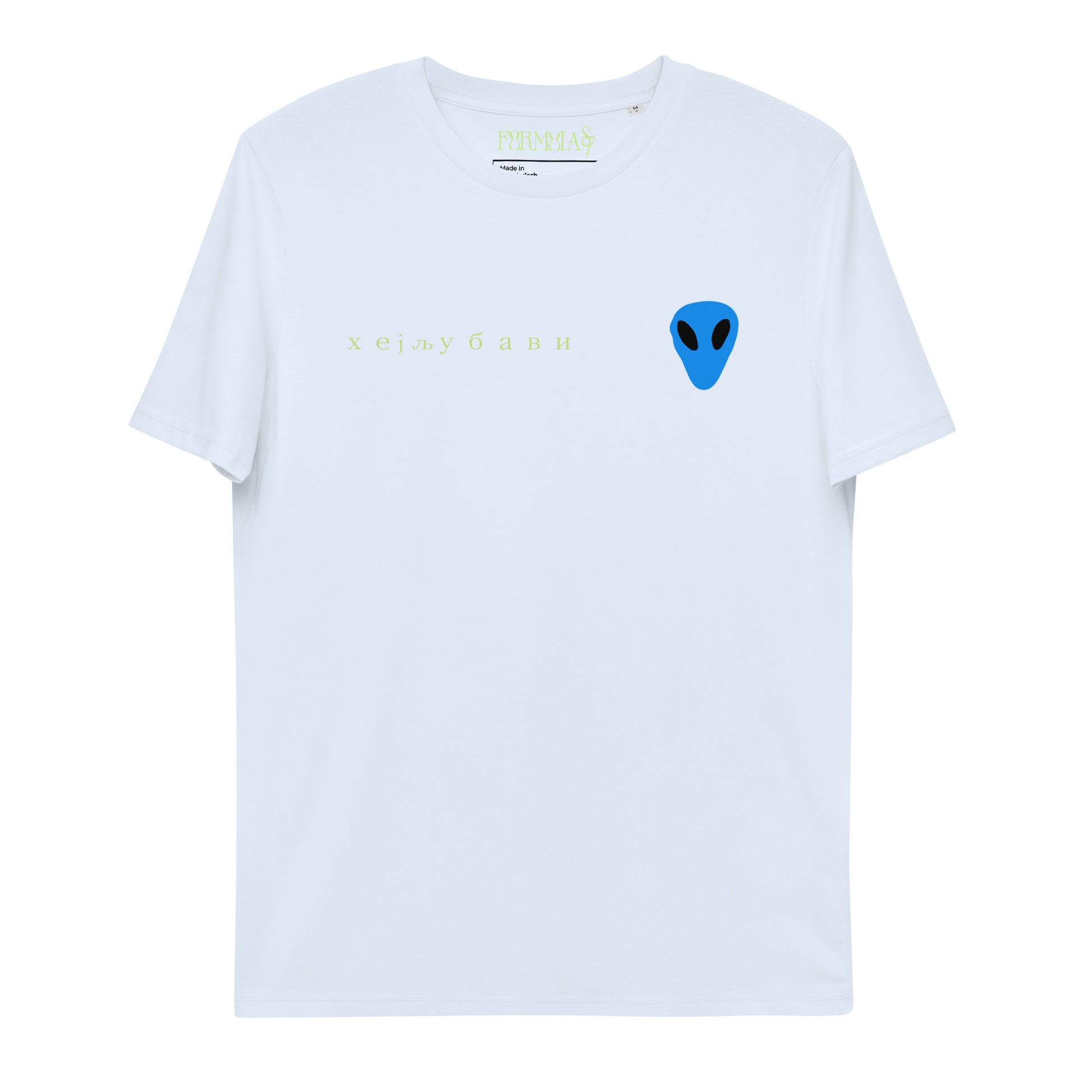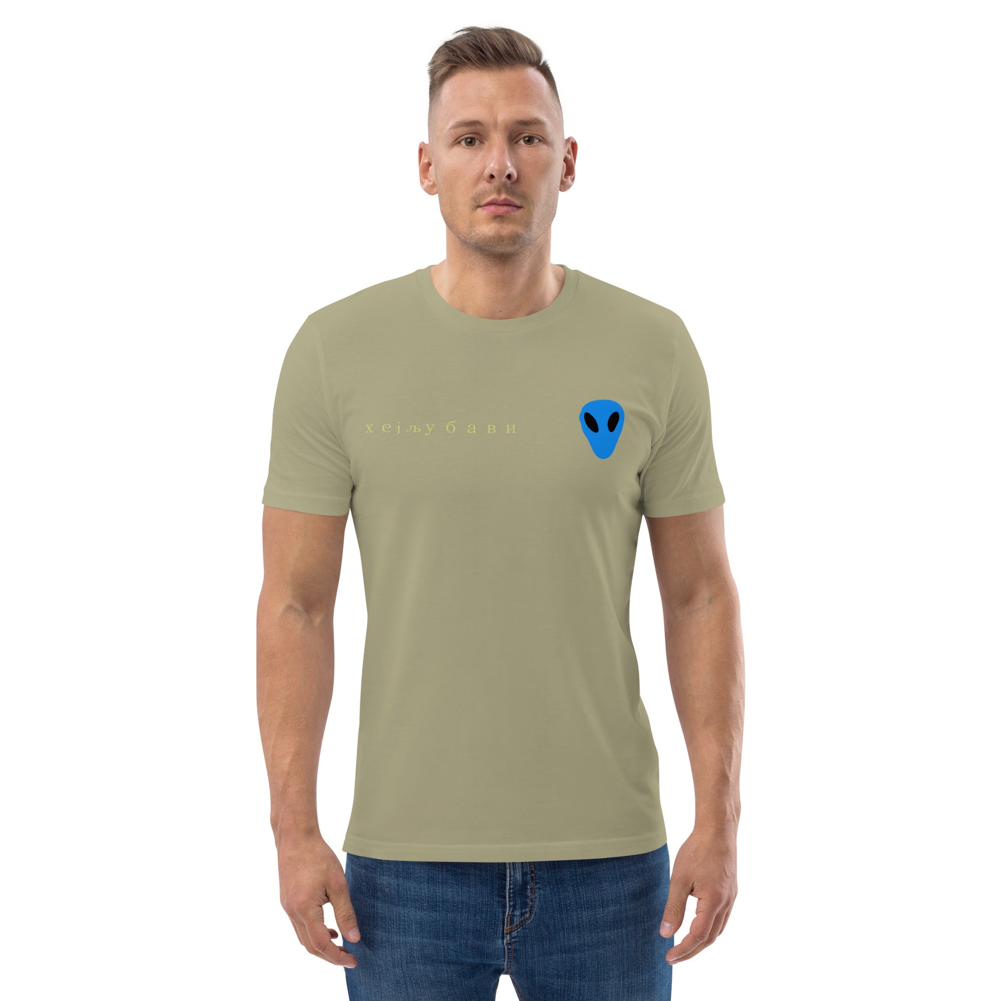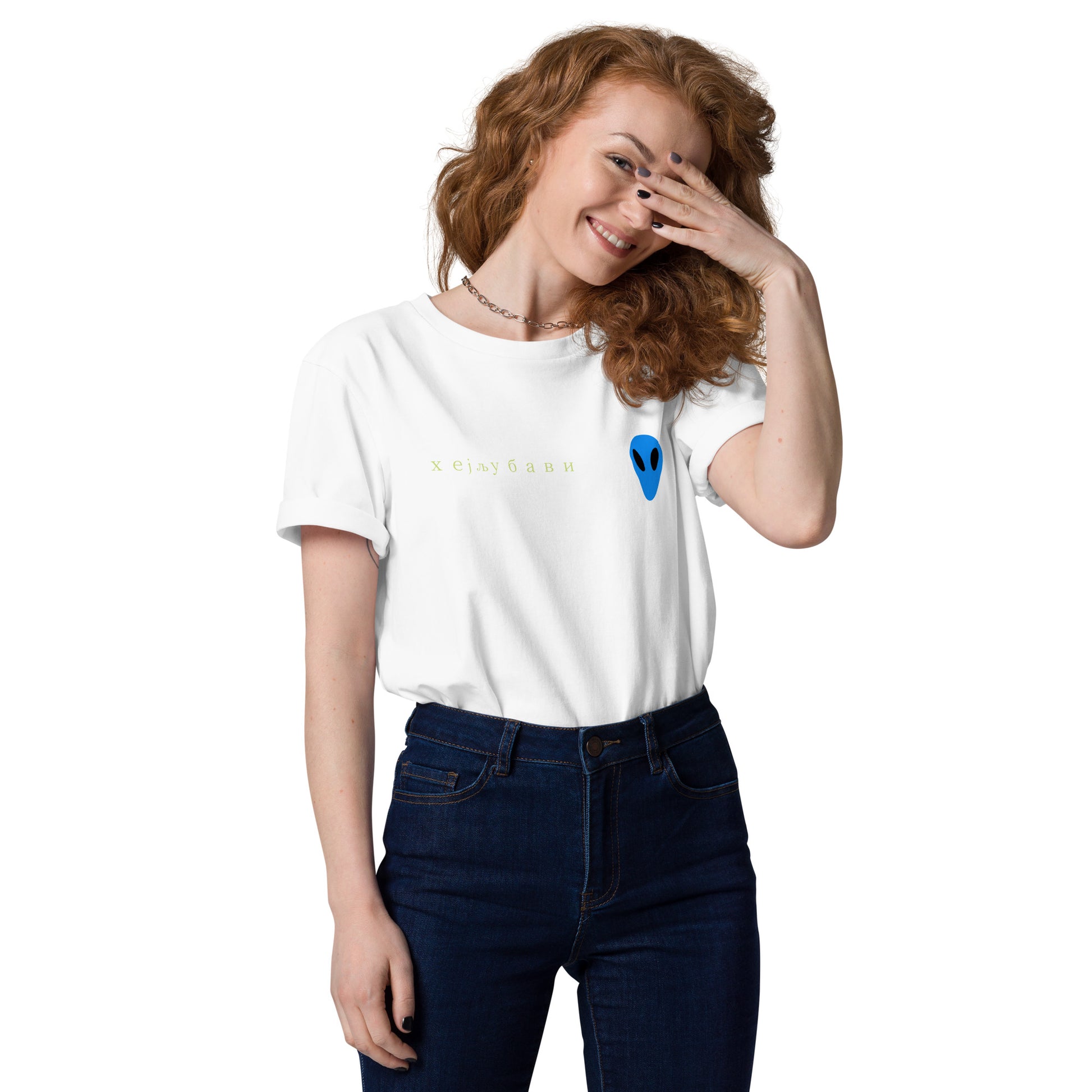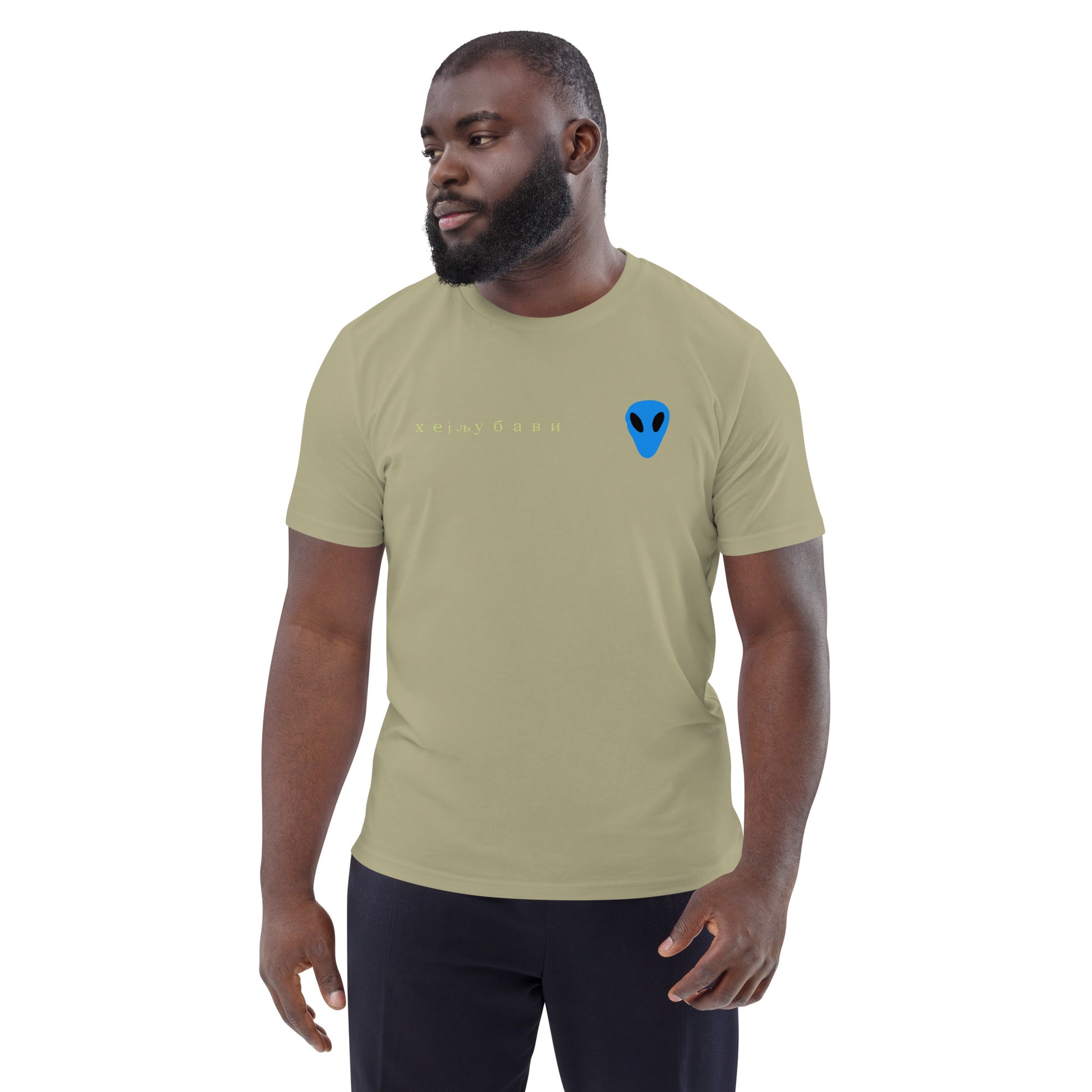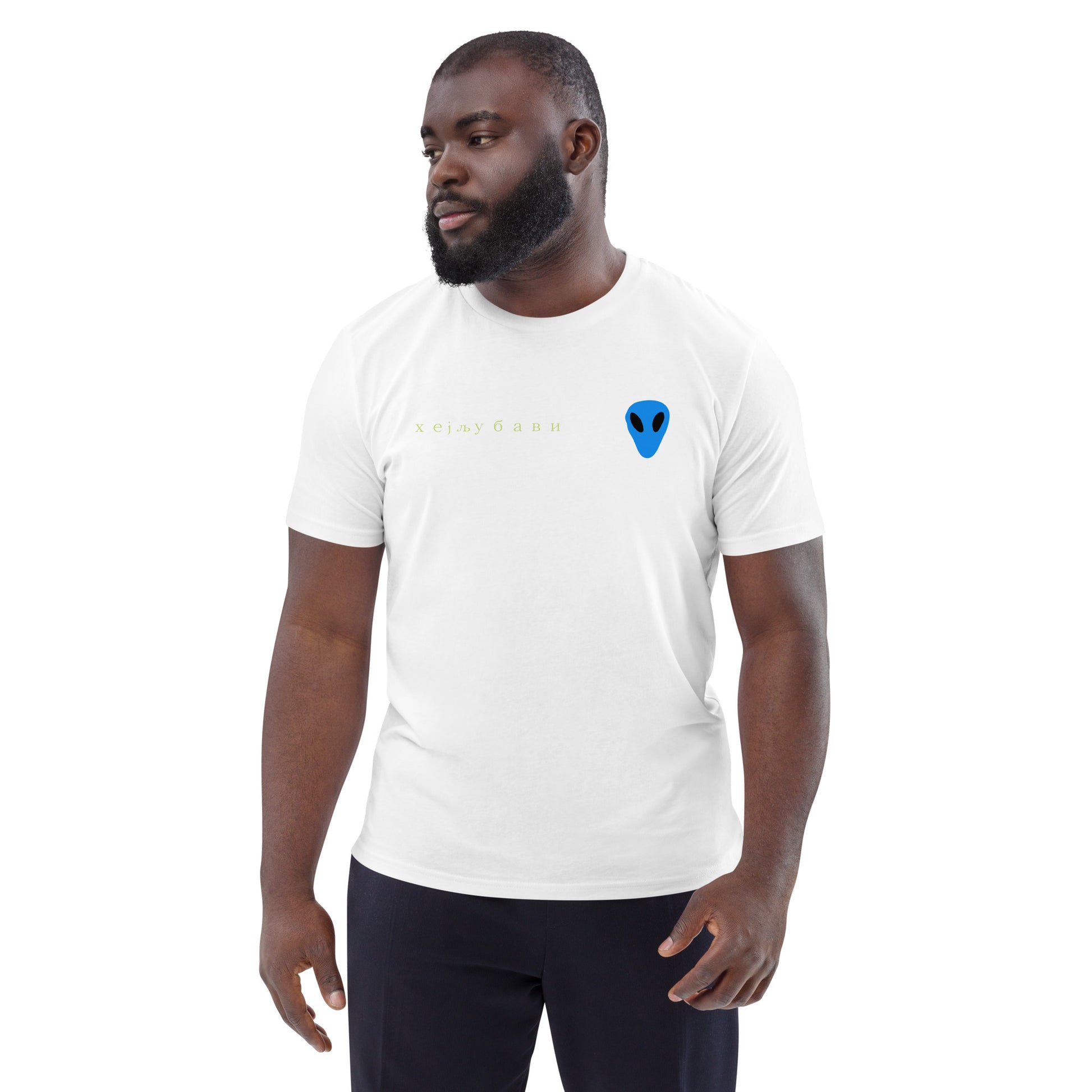 The front of the tee features the blue alien face graphic print and "Hey Love" in Serbian Cyrillic across the front right side.