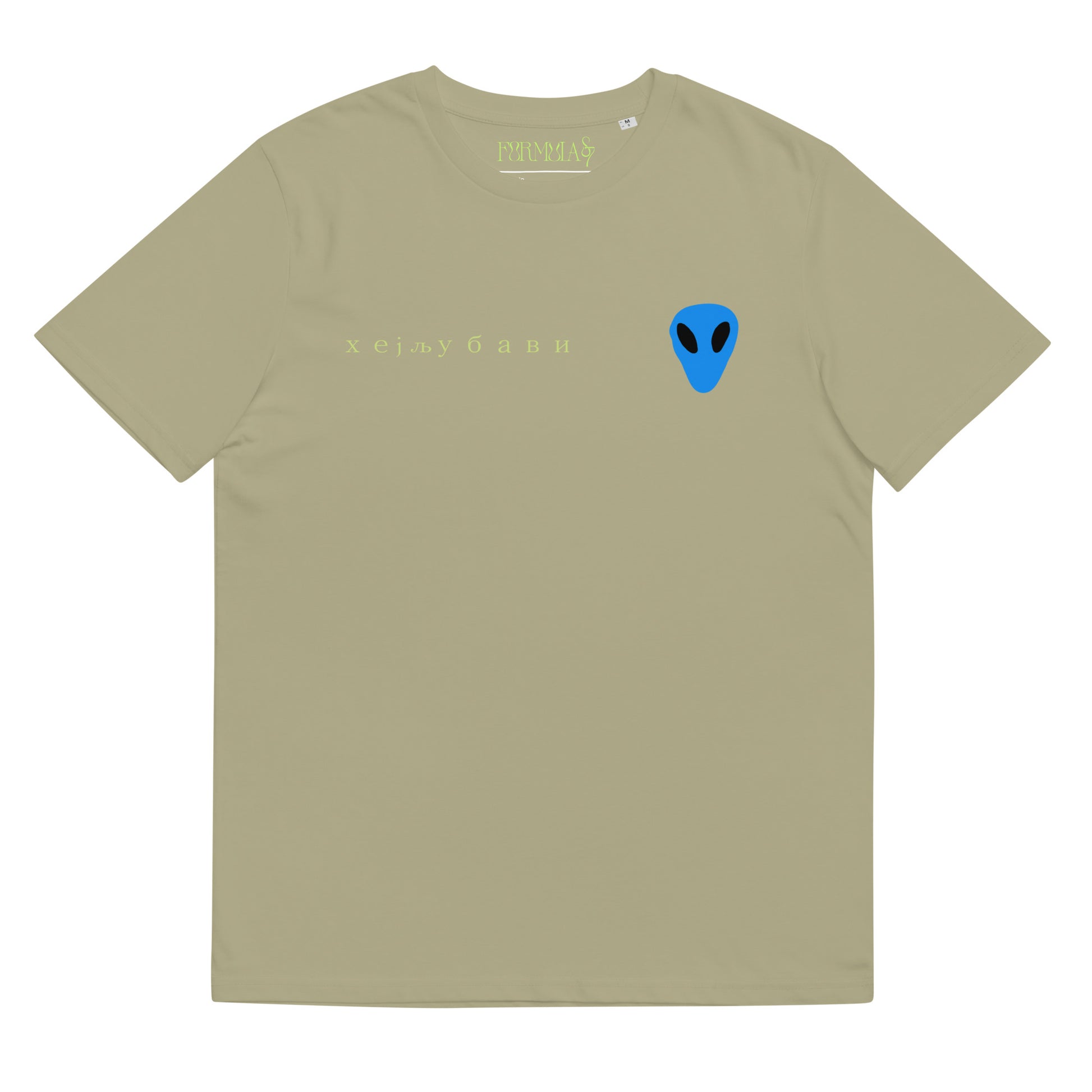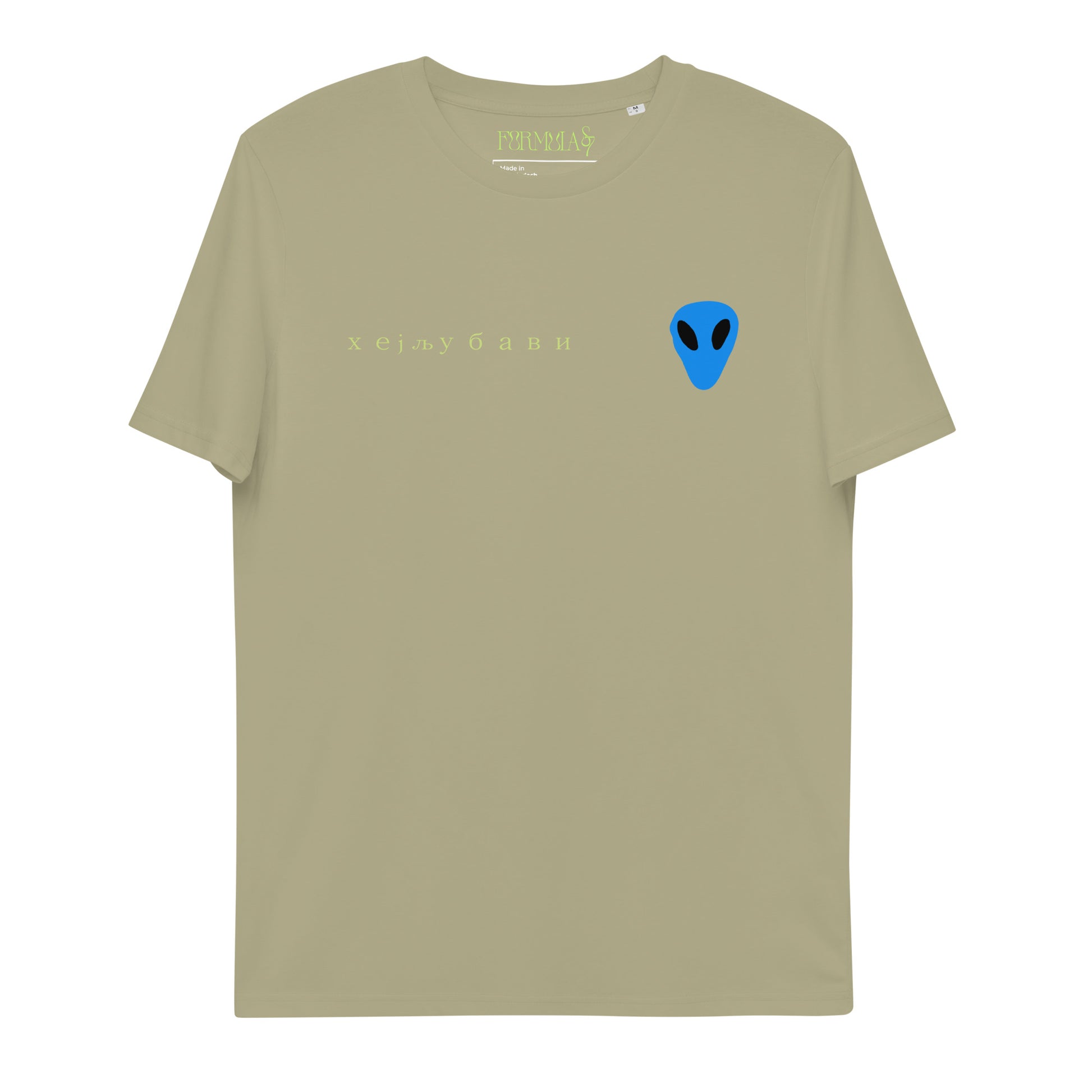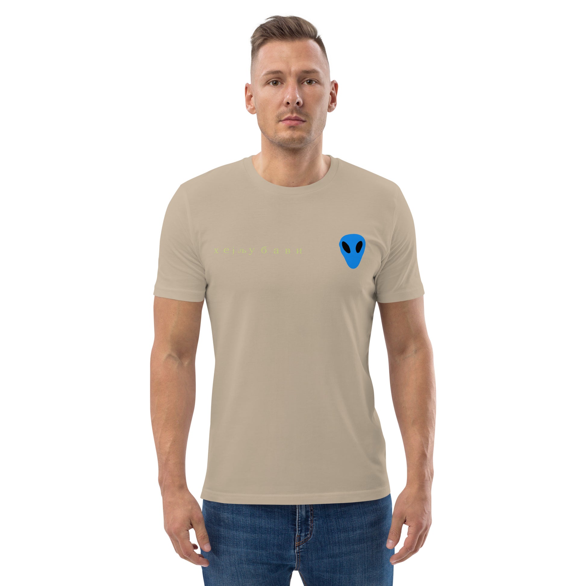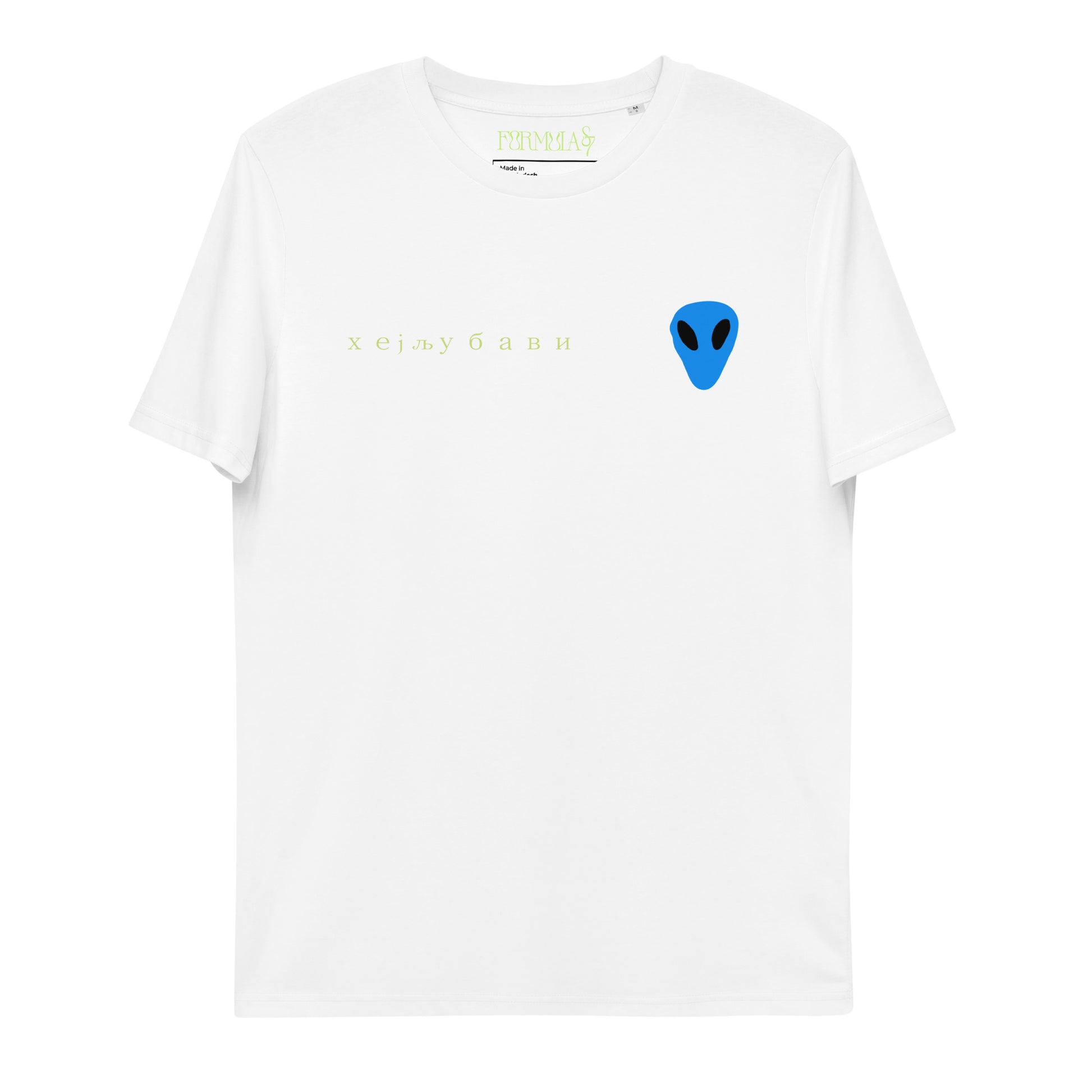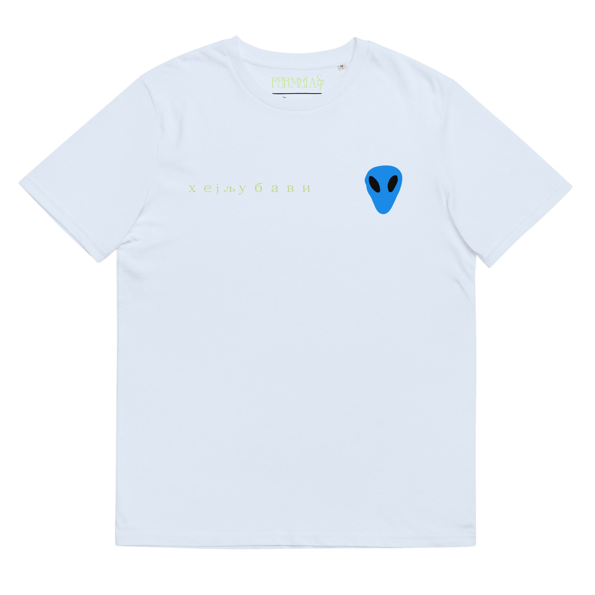 The front of the tee features the blue alien face graphic print and "Hey Love" in Serbian Cyrillic across the front right side.