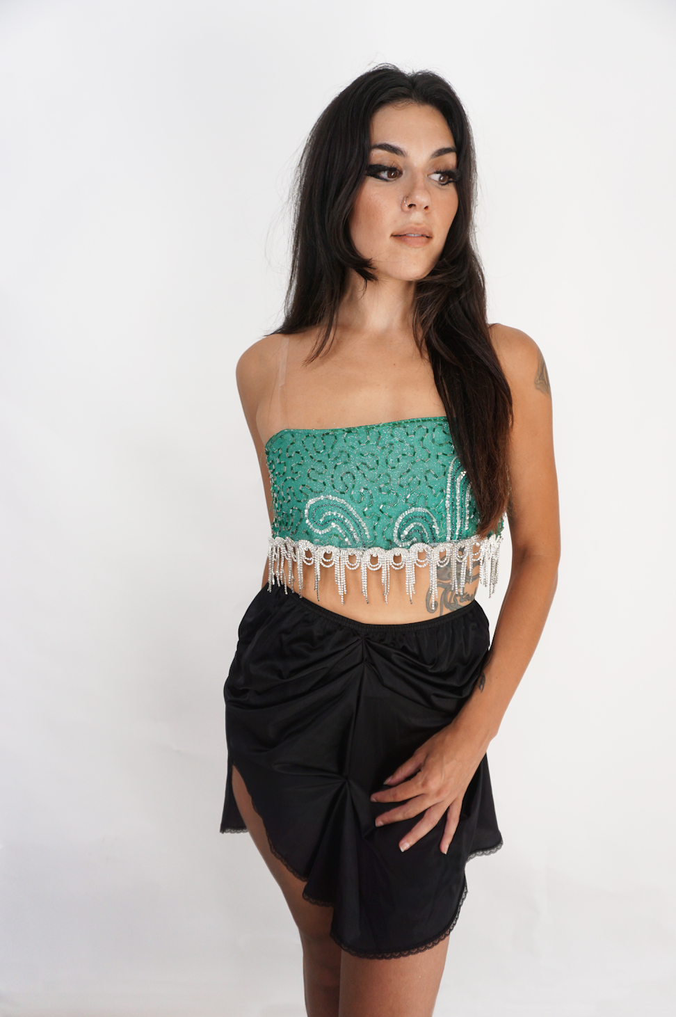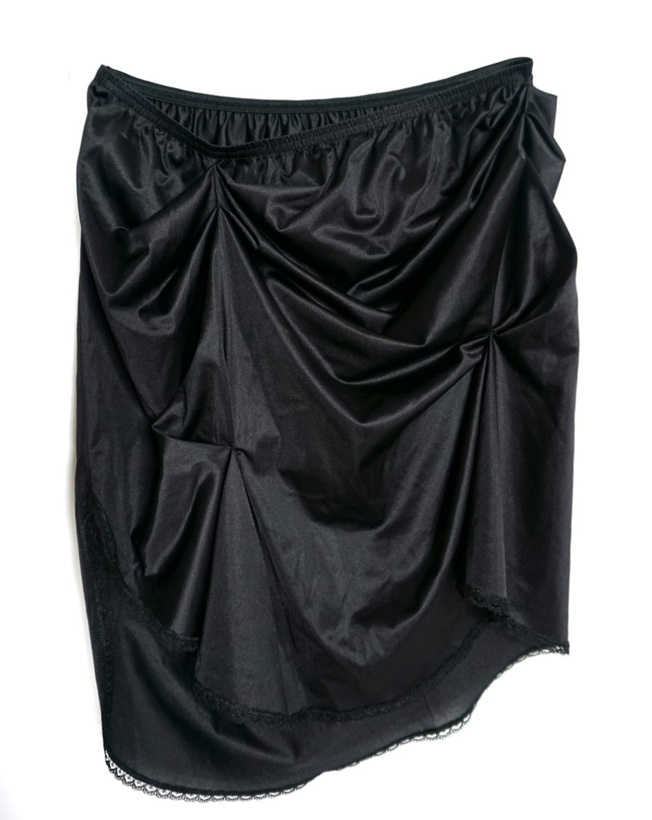 Meet your new favorite black mini skirt. It has draping and ruching inspired by the decorative icing on a cake for a unique, sarong like design. A little lace trim around the hem and a high slit on the side adds a sexy element. The elastic waist band easily stretches for convenient and comfortable wear. Dress it up or down for a one-of-a-kind statement piece that won't overpower the rest of your outfit.