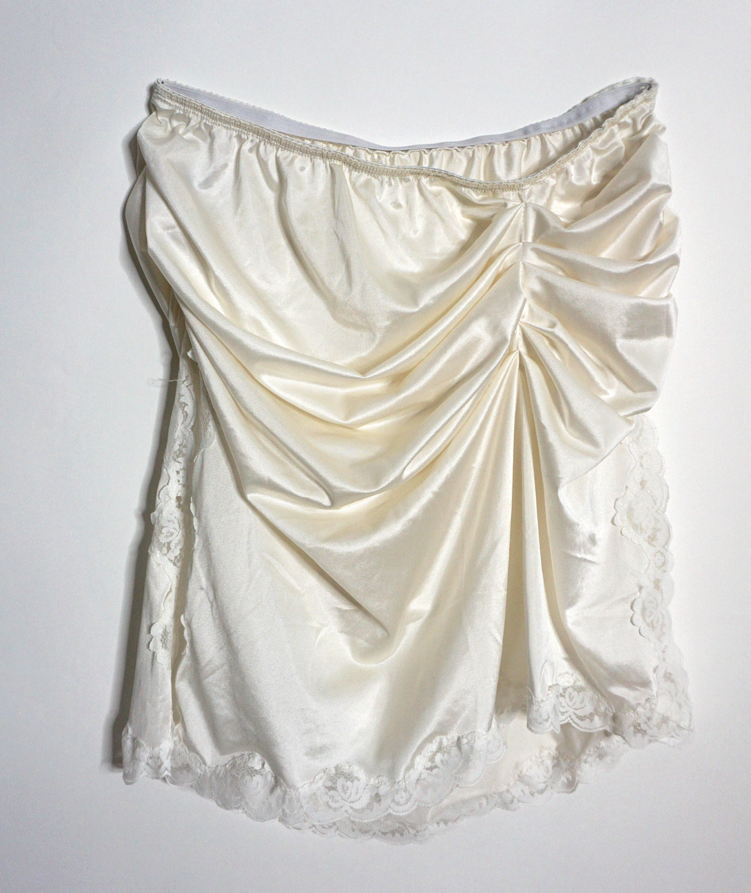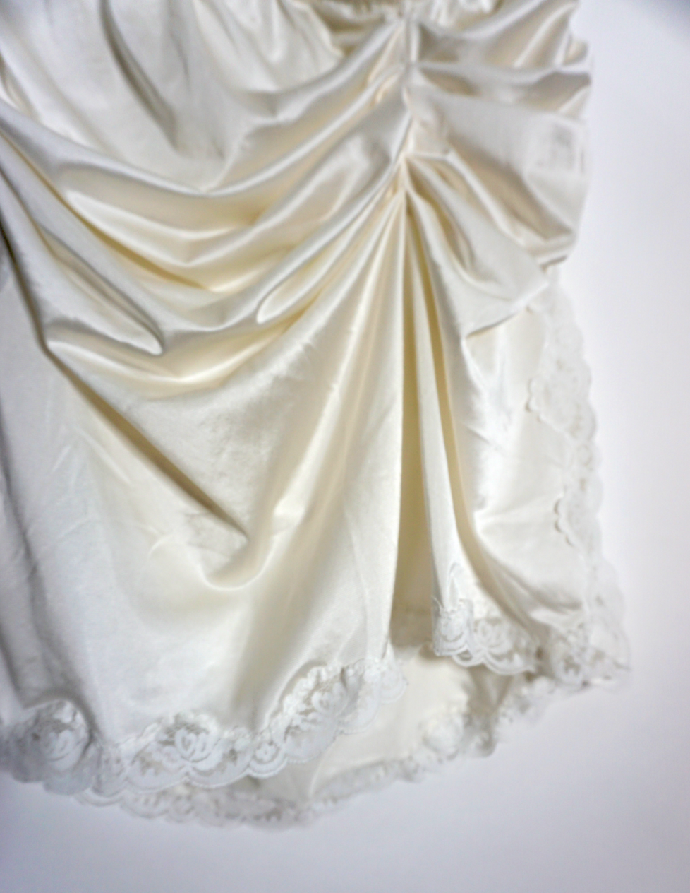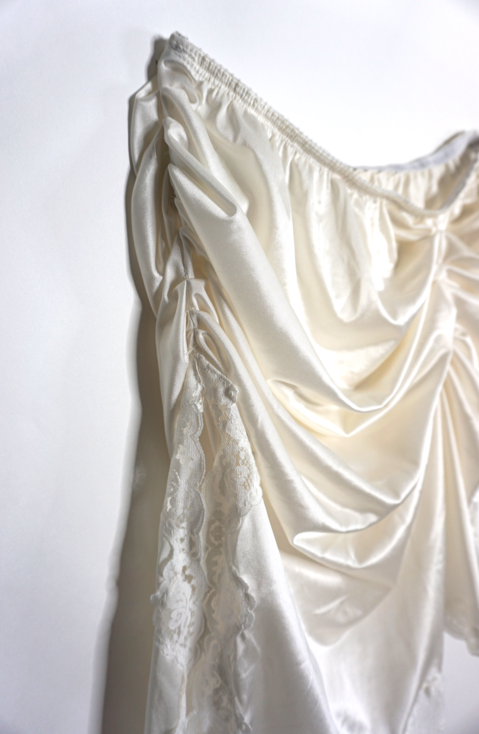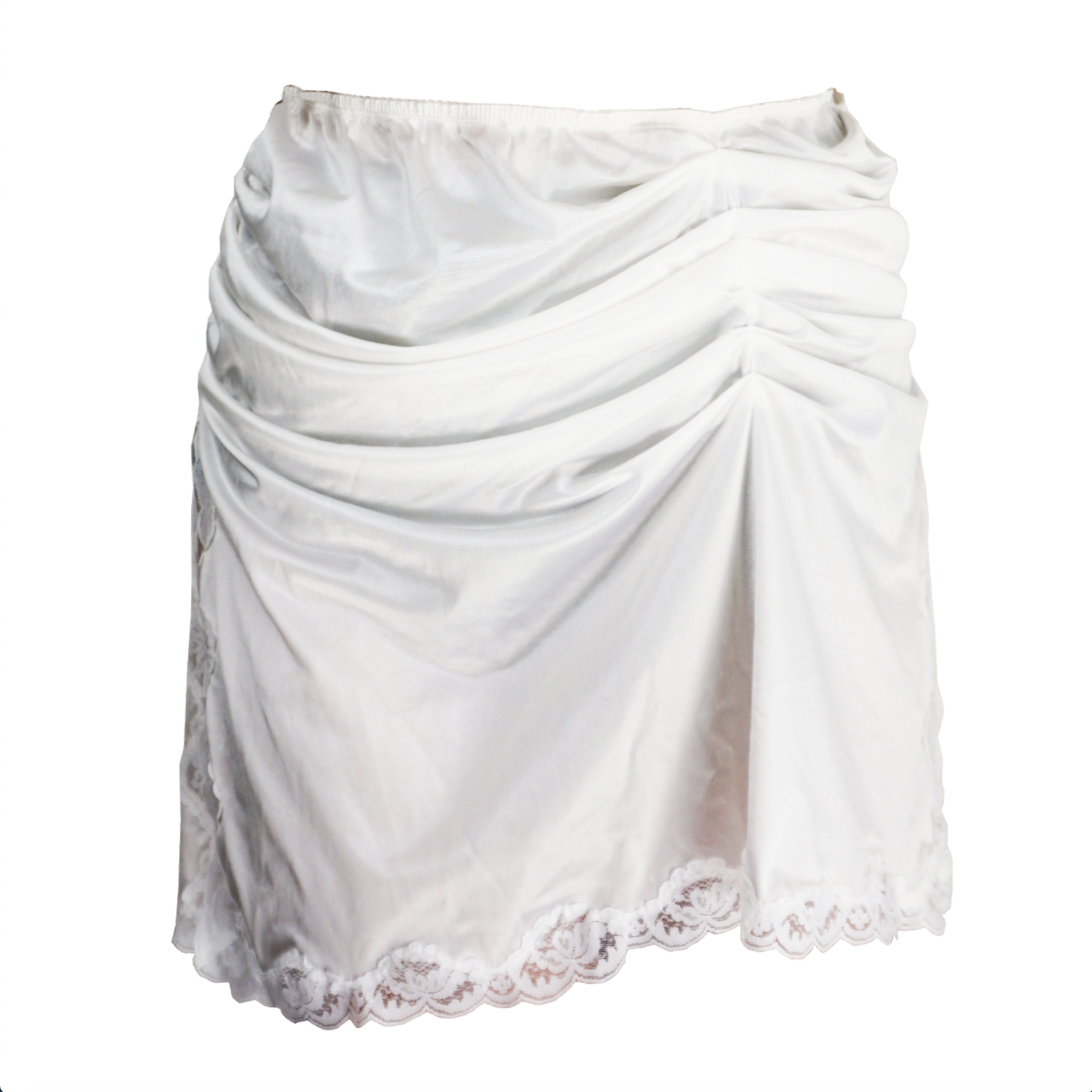 Meet your new favorite white mini skirt. It has draping and ruching inspired by the decorative icing on a cake for a unique, sarong like design. A lace trim around the hem and a high slit on both sides of the skirt adds a sexy element. The elastic waist band easily stretches for convenient and comfortable wear. Dress it up or down for a one-of-a-kind statement piece that won't overpower the rest of your outfit.