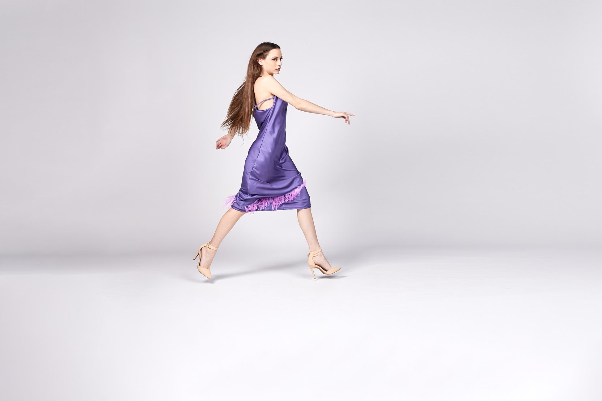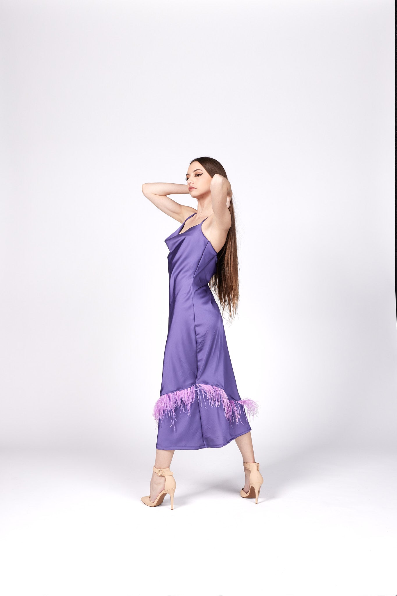 You just found the perfect Slip Dress to take you from day to night. The vibrant purple silky fabric is comfy and easy, yet will take you from hour to hour and transition your wardrobe between seasons. The magenta pink feather trim adds an extra pop of fun for any occasion. The design is defined by it's cowl neck, spaghetti straps and asymmetrical design elements. Wear it to any party, birthday celebration, walk around the city, to a picnic, and more!