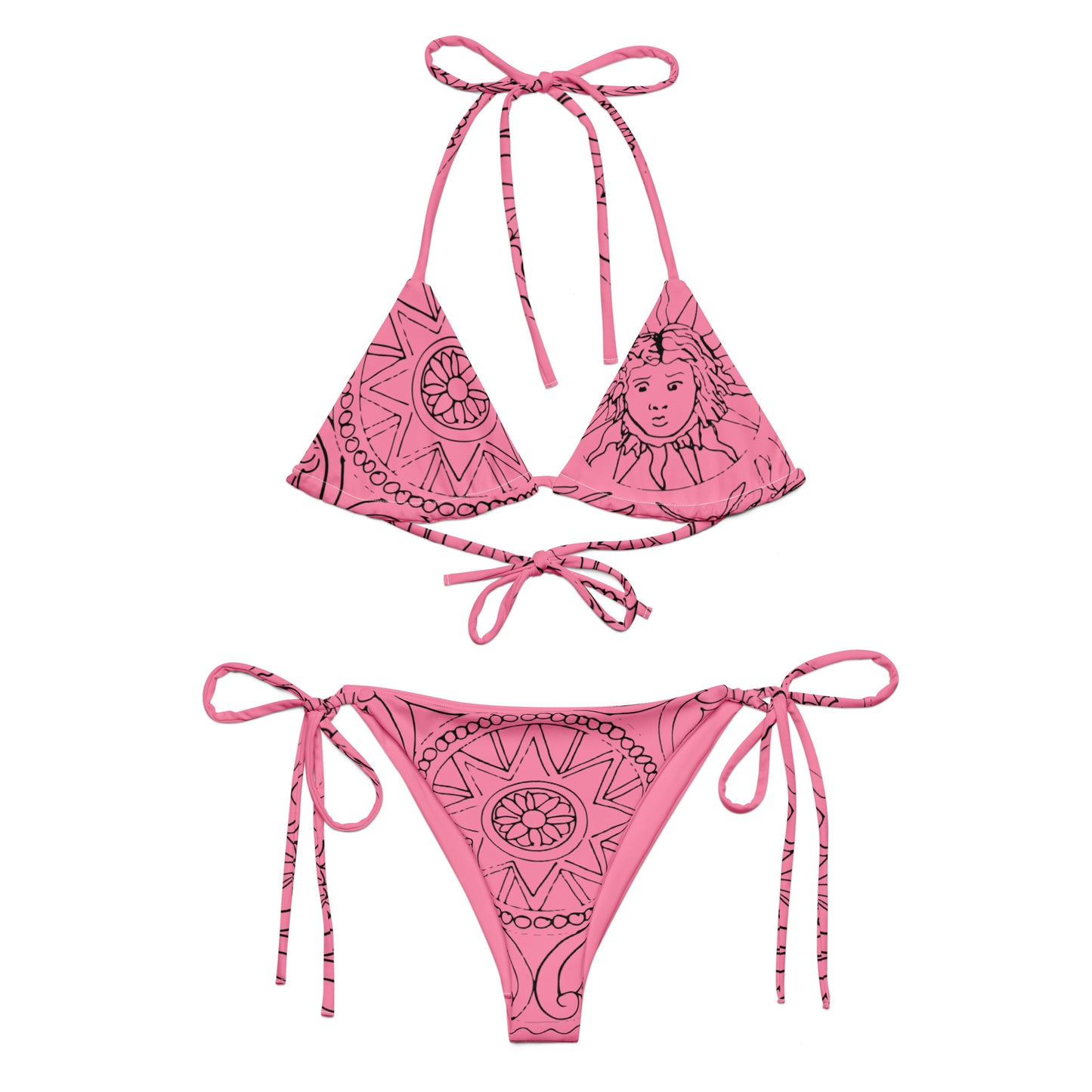 Introducing our remarkable String Bikini, designed with sustainability in mind and featuring the captivating Medusa Sea Medallion print on a feminine pink base. Crafted from recycled polyester, this eco-conscious bikini reduces waste while maintaining style and quality. The intricate Medusa design, inspired by the ocean, symbolizes strength, power, and independence, empowering you to embrace your confidence. Make a conscious, stylish choice with swimwear that not only enhances your look but also helps protect the planet.