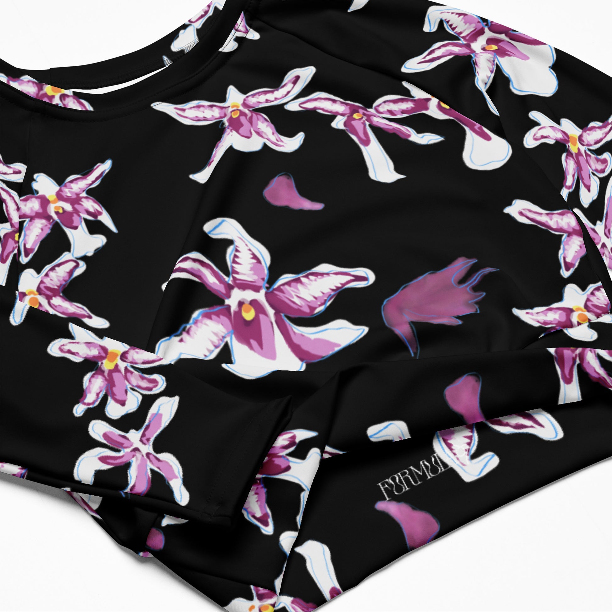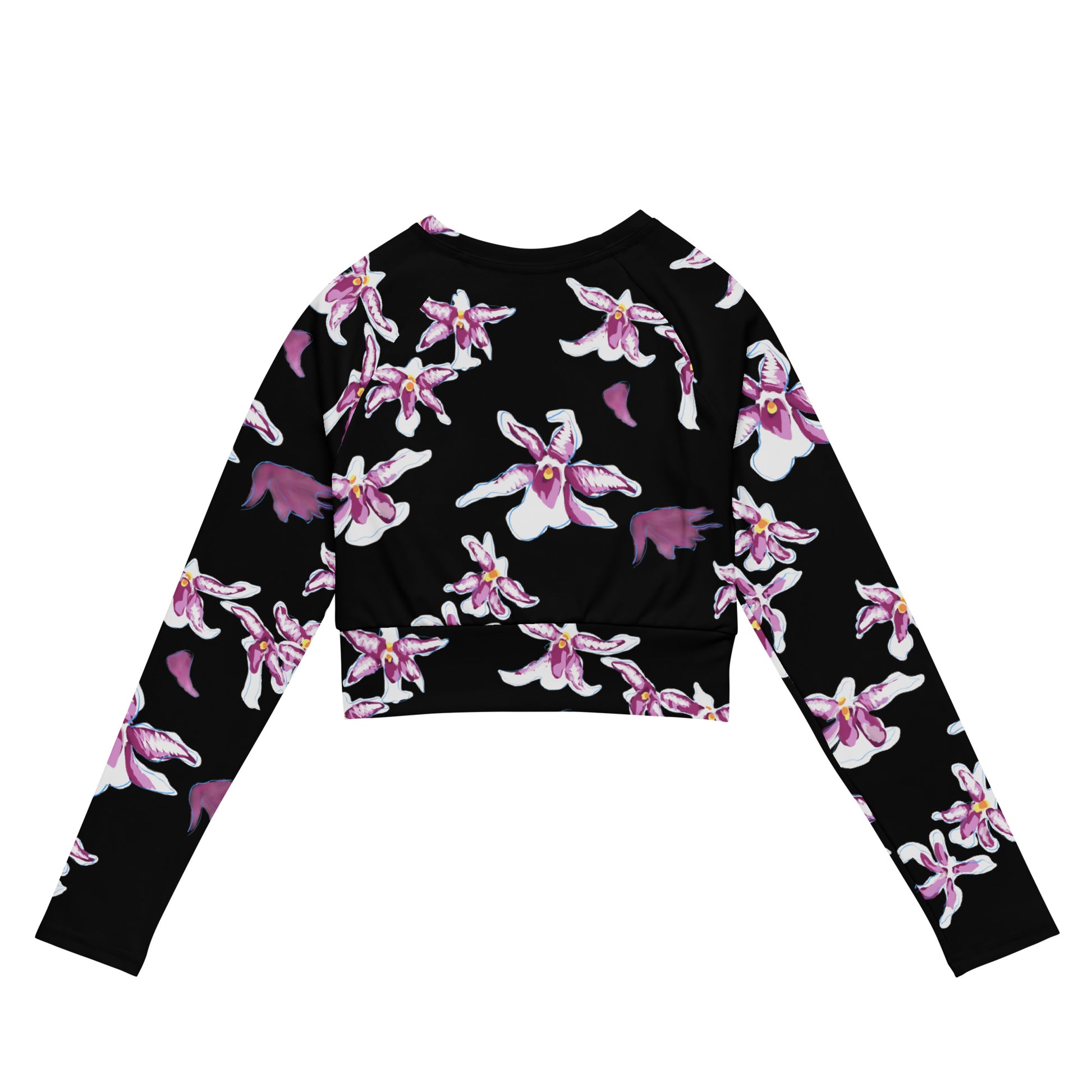 Elevate your athleisure game with the Midnight Bloom Long-Sleeve Crop Top, where romance meets performance. Made from recycled polyester and elastane, this eco-conscious piece is perfect for swim, sport, or everyday wear. The bold black base is adorned with soft purple and white orchids, evoking moonlit petals dancing in the night—an ode to nature’s quiet drama. With a wide, double-layered waistband and tear-away care label, it’s designed for comfort, movement, and effortless elegance wherever you go. Match it with the Midnight Bloom Bikini and/or flare leggings!