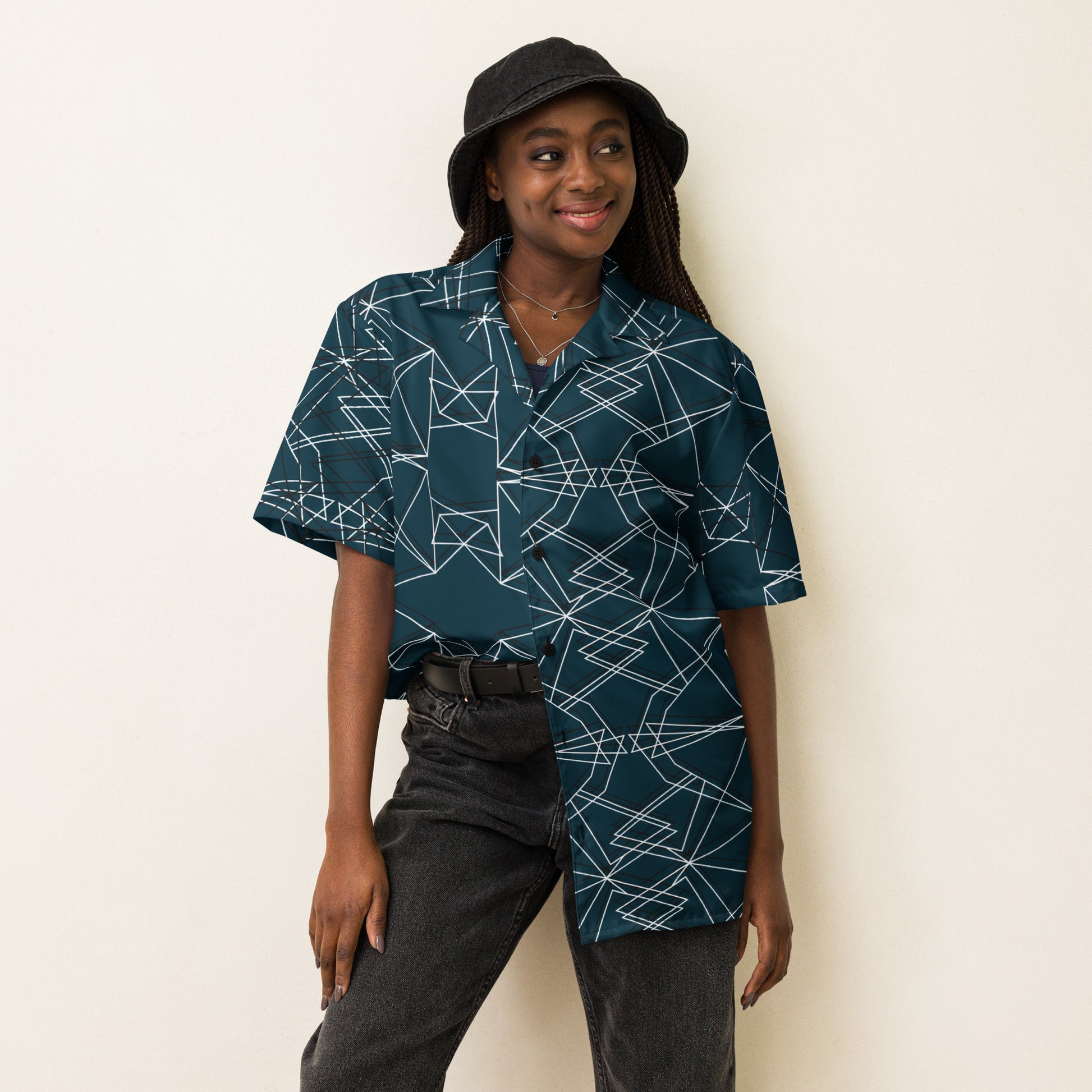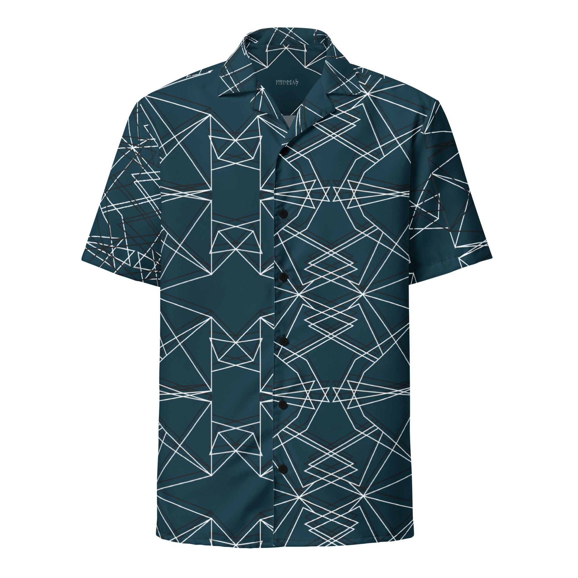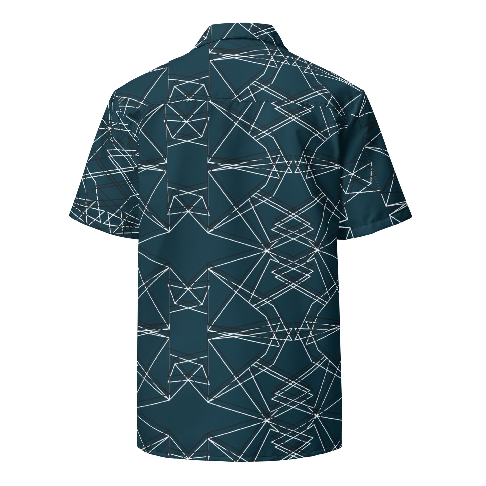 Meet your new favorite shirt! It exudes coolness both in terms of style and material. This deep blue shirt features a unique double-line geometric design inspired by an origami bird, with black and white lines creating a striking visual contrast. It's featherlight and moisture-wicking material ensures comfort even on the hottest days.