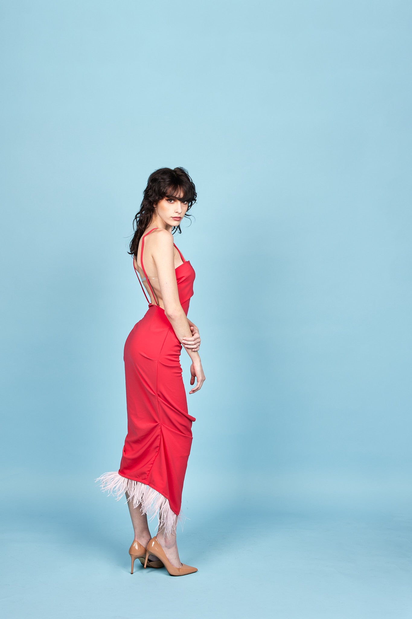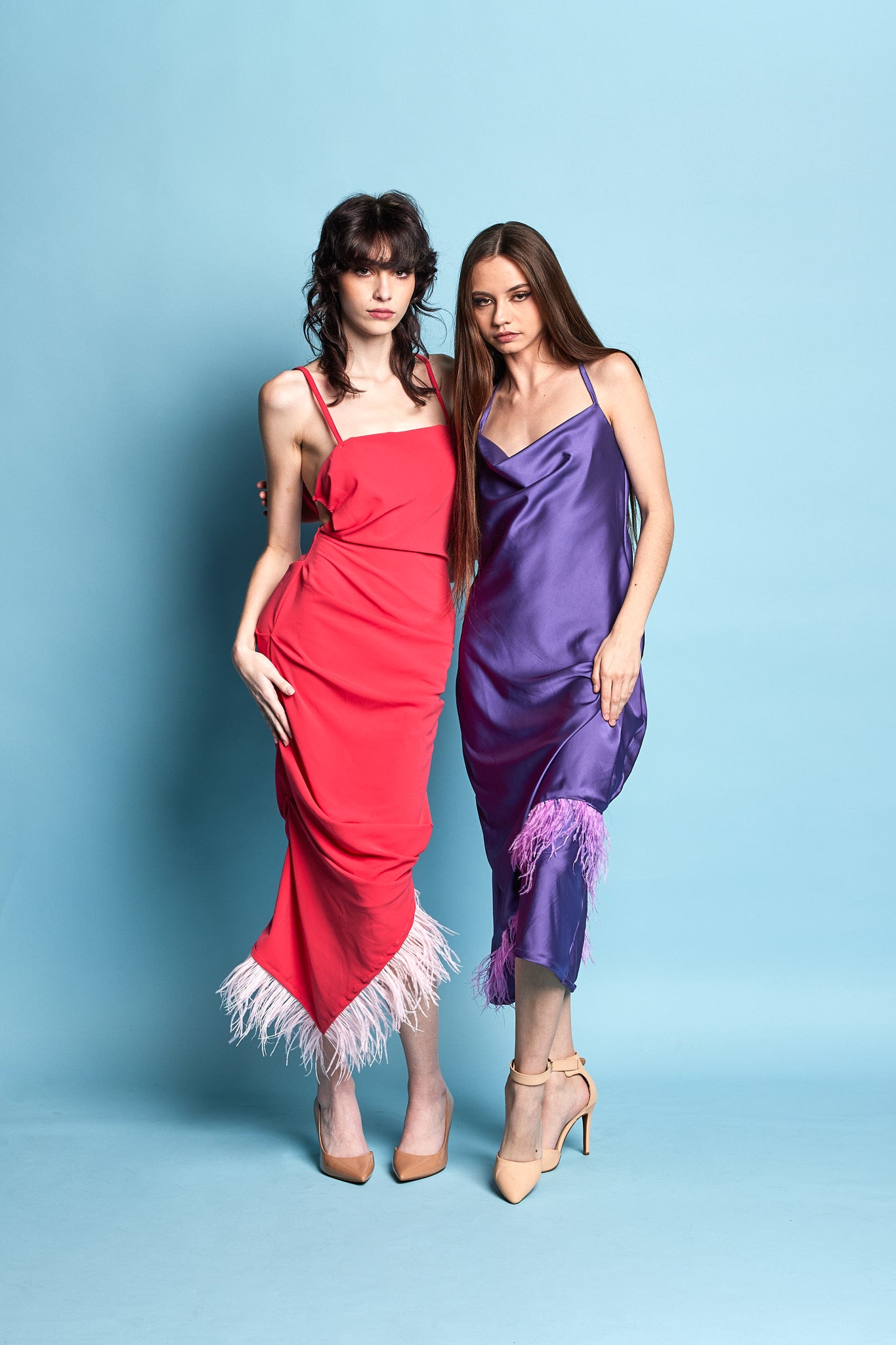 Slip into your Pink Aura Goddess with the uniquely draped cowl neck dress. Bits and pieces of this dress were strategically placed together, as they were once scrap pieces of fabrics, creating a truly one of a kind design. The multi Draped layers, Spaghetti straps, and form hugging silhouette all take inspiration from the ancient Greek and Romans dress. A light pink feather trim at the hem adds a pop of fun and contrast to the bright vibrant pink flowy fabric.