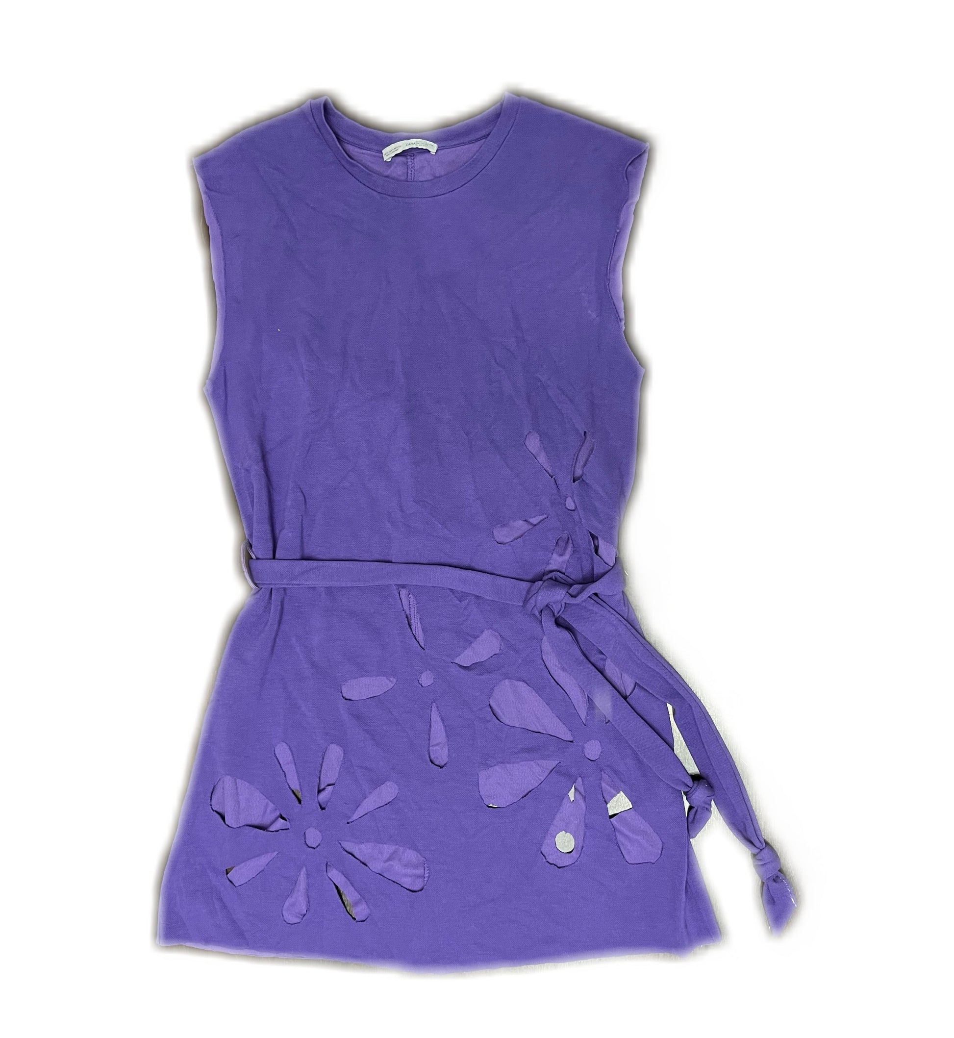 This Purple Floral Cutout Sleeveless Mini Dress features an up-cycled design and a classic silhouette. Its lightweight fabric is detailed with floral cutouts, and features a tie waist belt to define the waist. Perfect for any special occasion.