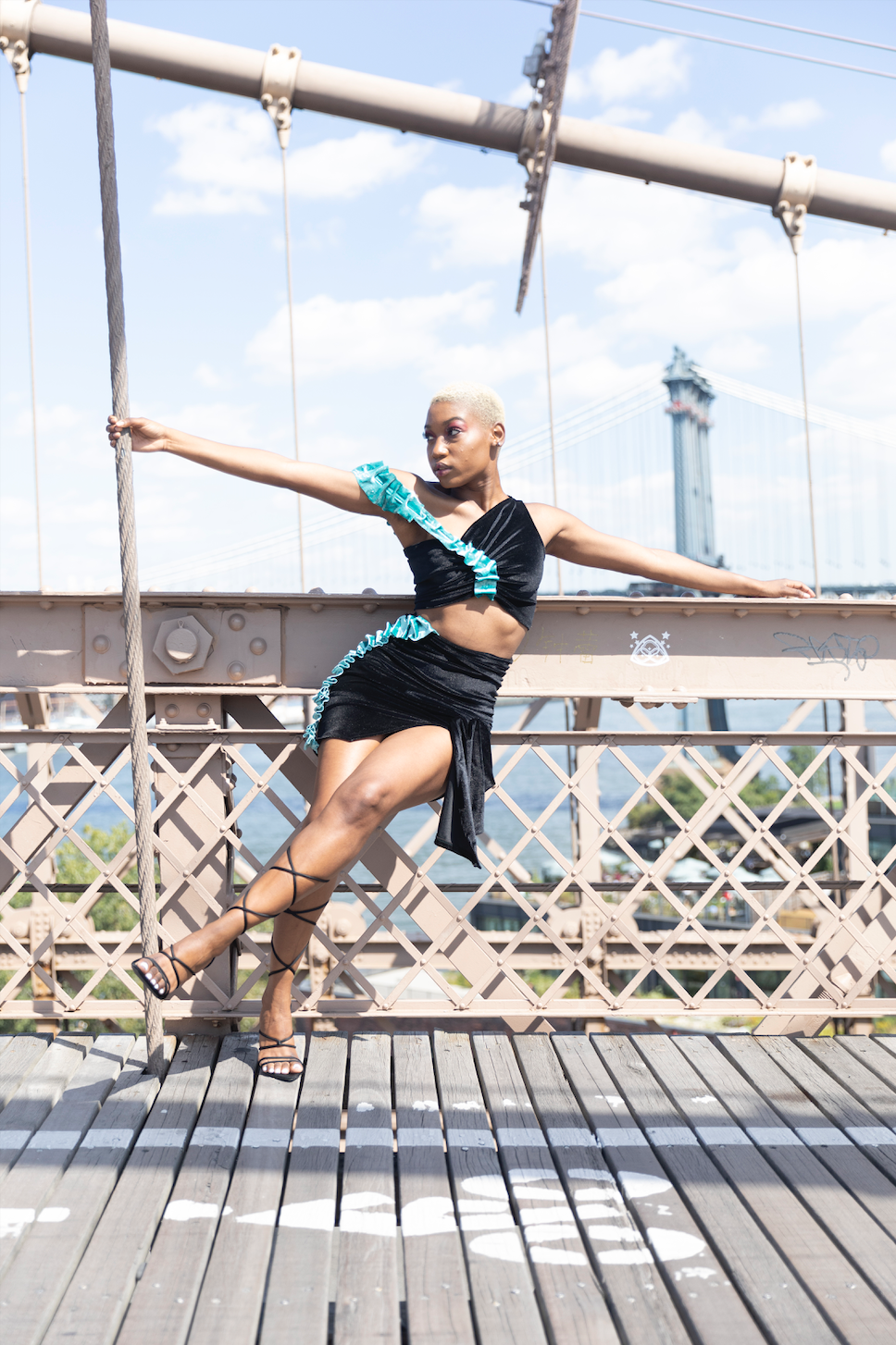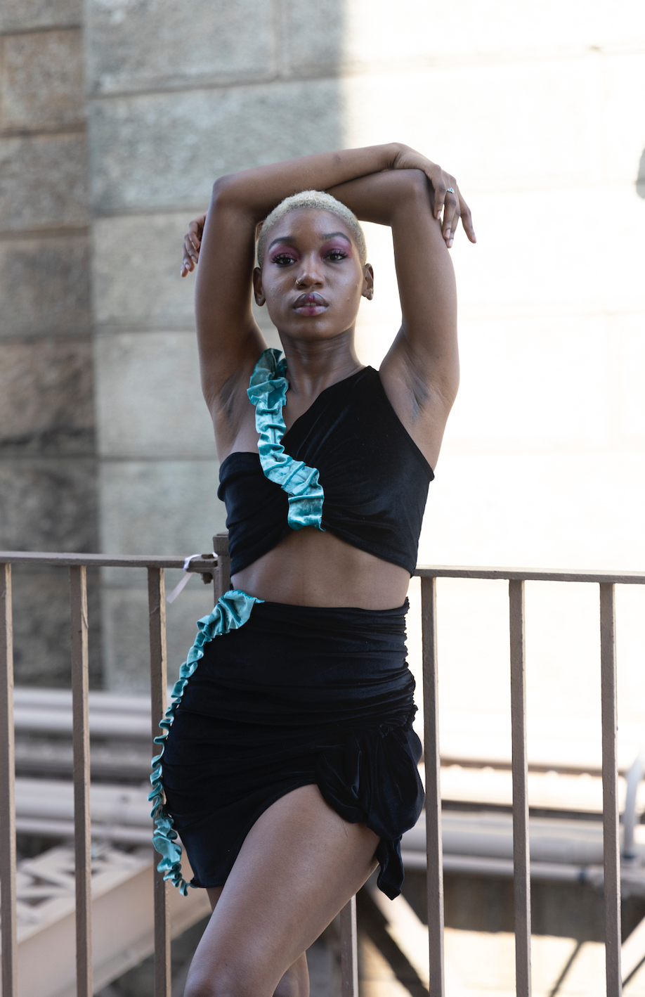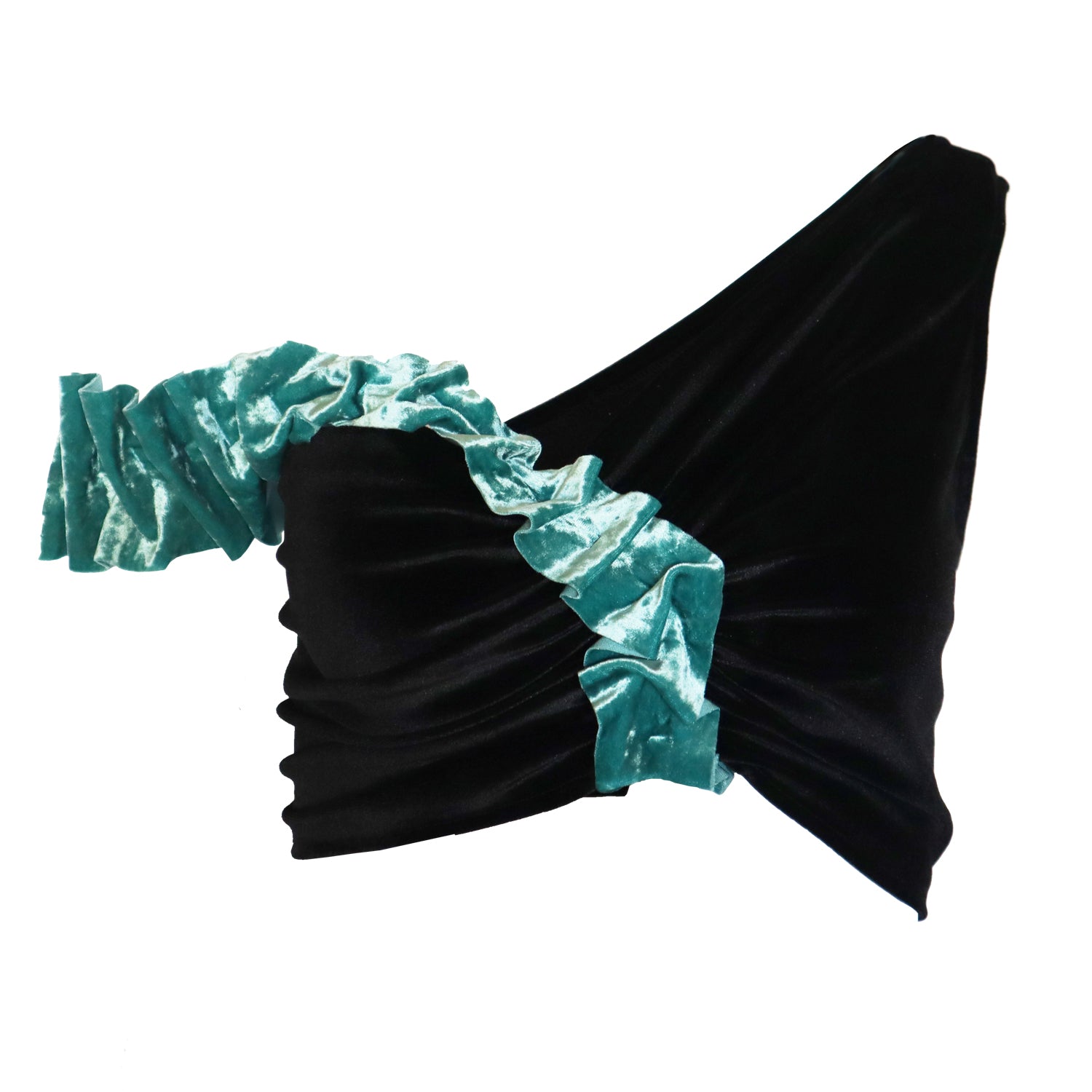 The Quoise Black Velvet top features a blue crushed velvet shoulder strap accent with square ruffles that starts at the center front of the top and ends at the princess line on the back. This turquoise blue strap contrasted against the black velvet cropped top makes the color pop, showcasing the beautiful liquid silk-like effect of the fabric. The top features an internal bungee to create a ruched effect at the center front. The black velvet base of the top is a sleeveless design that goes from a bra top style to a crop top style for a one-shoulder look. The blue ruffled shoulder strap can be worn as an off-the-shoulder style and adds an element of fun to this asymmetrical look. The stretch of the fabric makes this an easy pull-over design perfect for going out, a fancy dinner party, or your next glamorous wedding guest look. Pair with the Quoise Black Velvet Skirt for a complete set! Fits sizes 4-6