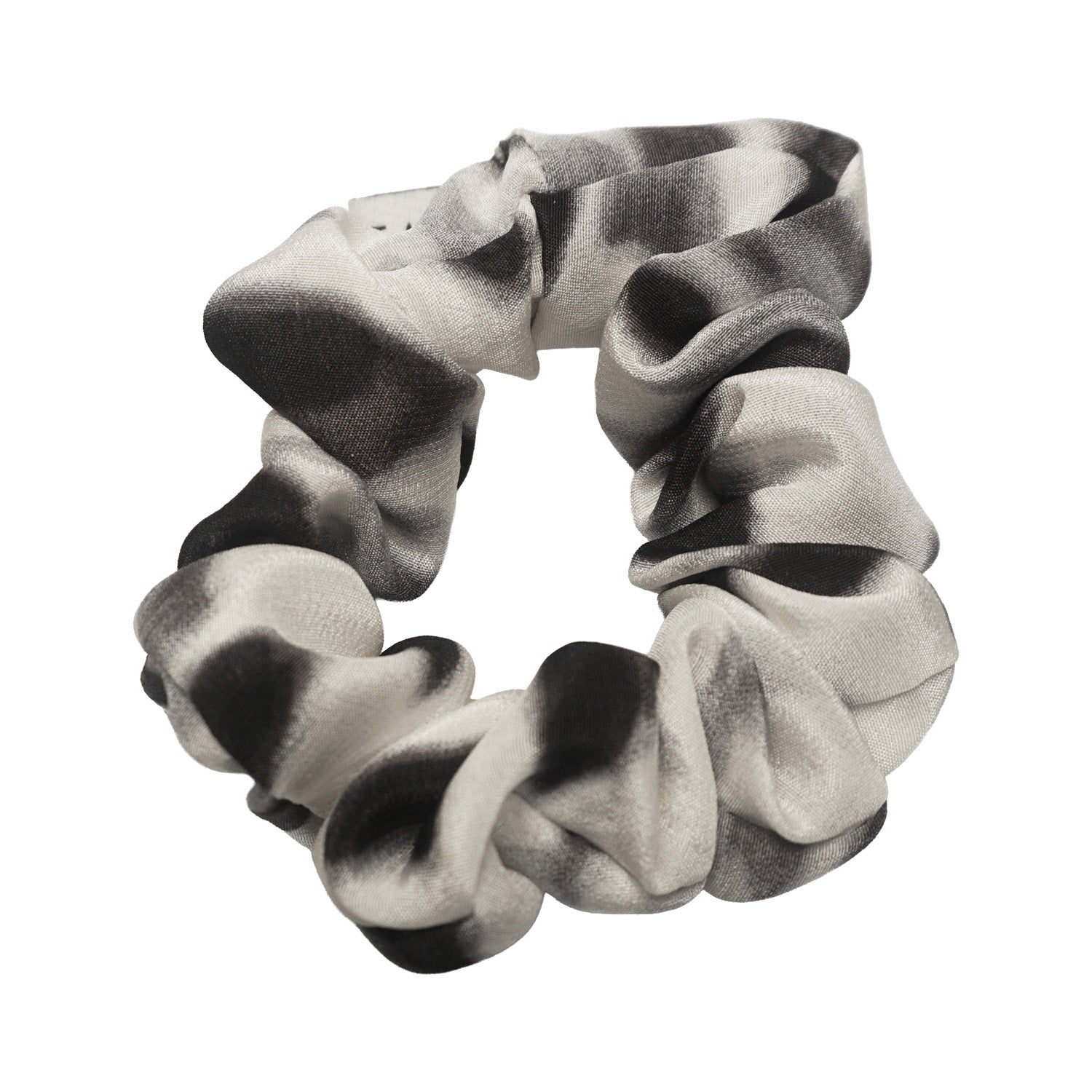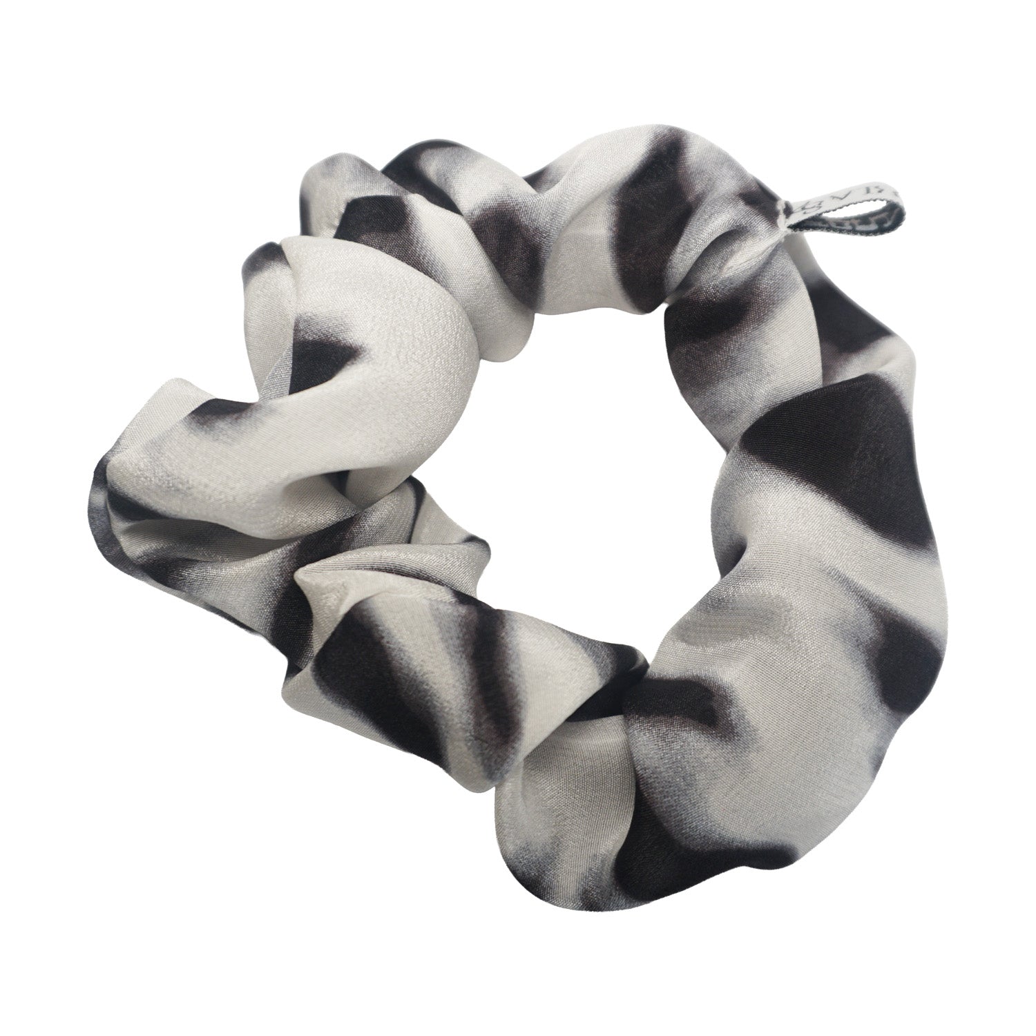 Elevate your everyday hair game with this 100% Silk Crepe de Chine scrunchie, featuring a black-smokey gray-pearly white abstract watercolor animal print. Lightweight, soft, and subtly textured, Crepe de Chine offers a luxurious hold that’s gentle on your hair, reducing breakage, creasing, and friction with every wear.