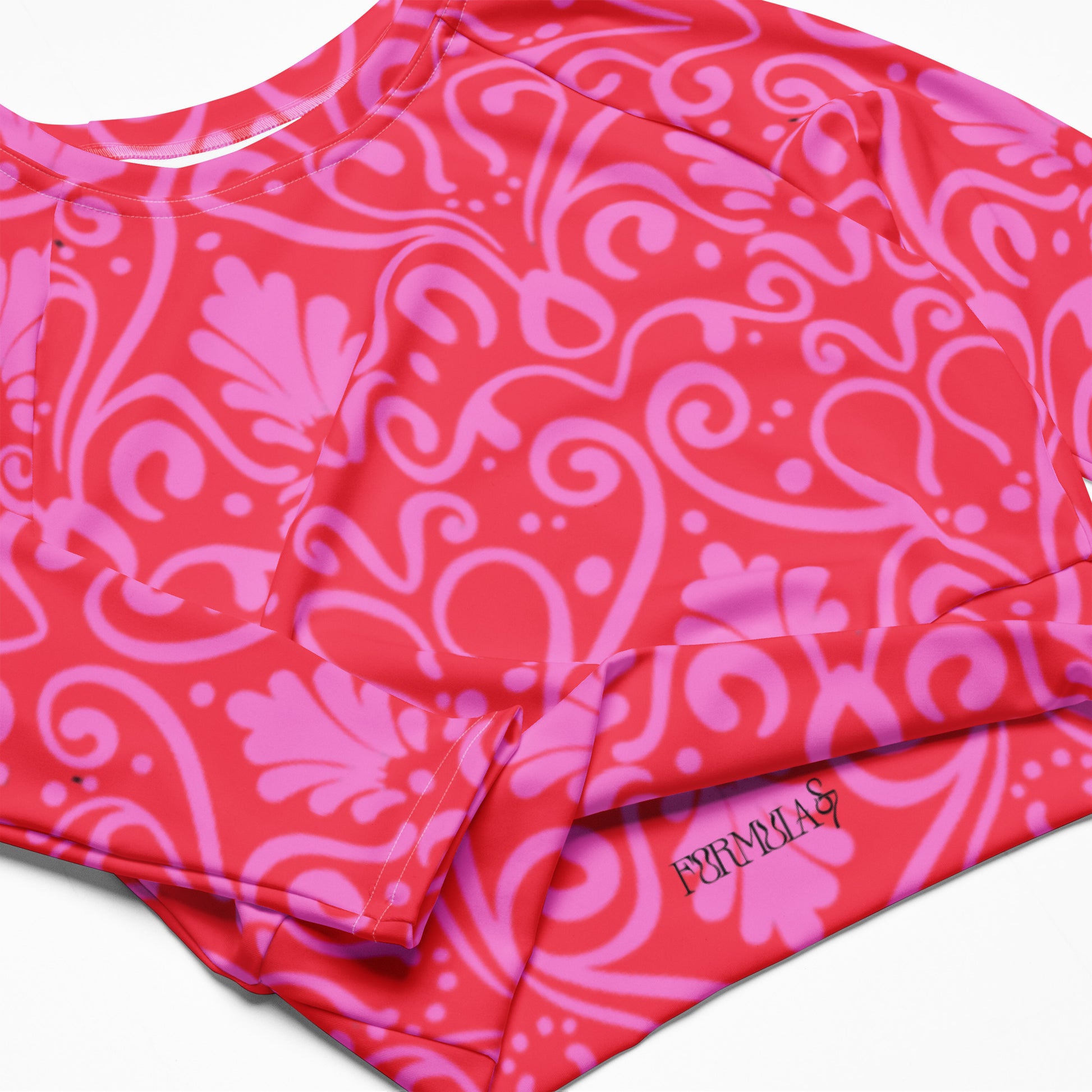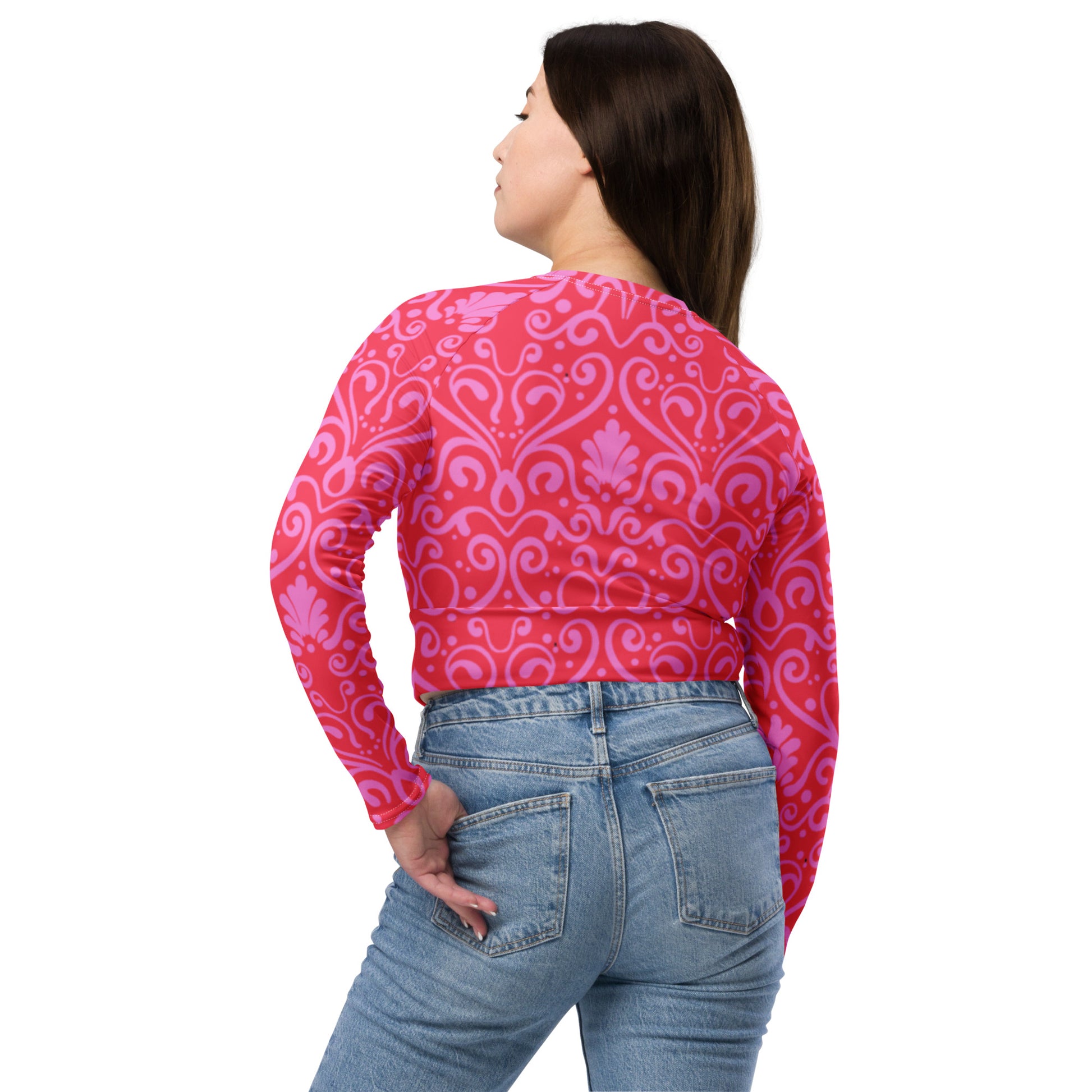 Fall in love with every detail in the Botanica Reverie Long-Sleeve Crop Top in our Sunkissed Whimsy print. This bold-meets-sweet design features a rich red base adorned with a delicate pink damask-inspired pattern—swirly hearts, seashell-like shapes, and playful dots that add a whimsical touch. Made from soft recycled polyester and elastane, this eco-friendly piece hugs in all the right places with a comfy double-layered waistband and UPF 50+ sun protection. Perfect for beach days, workouts, or wherever your bold heart takes you.