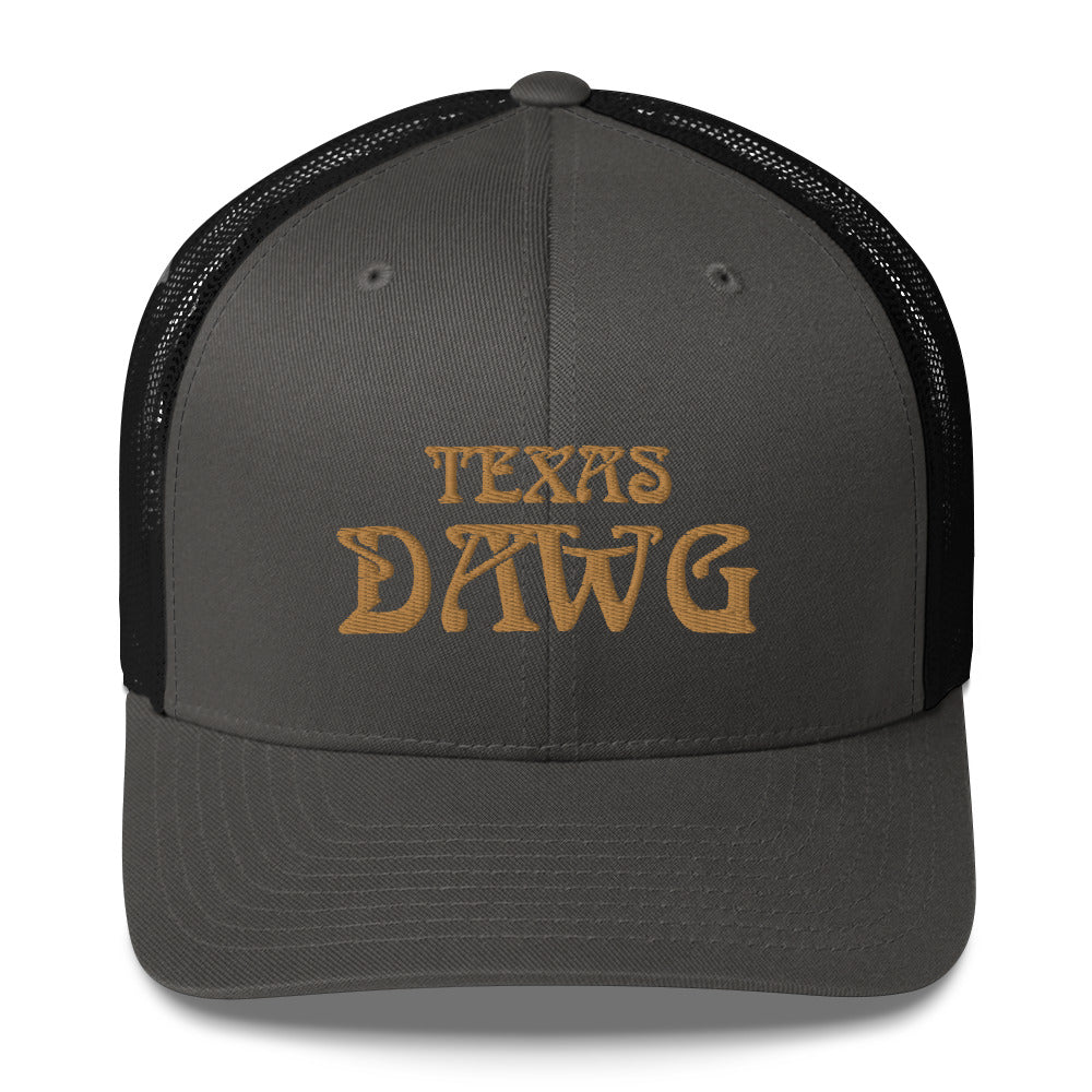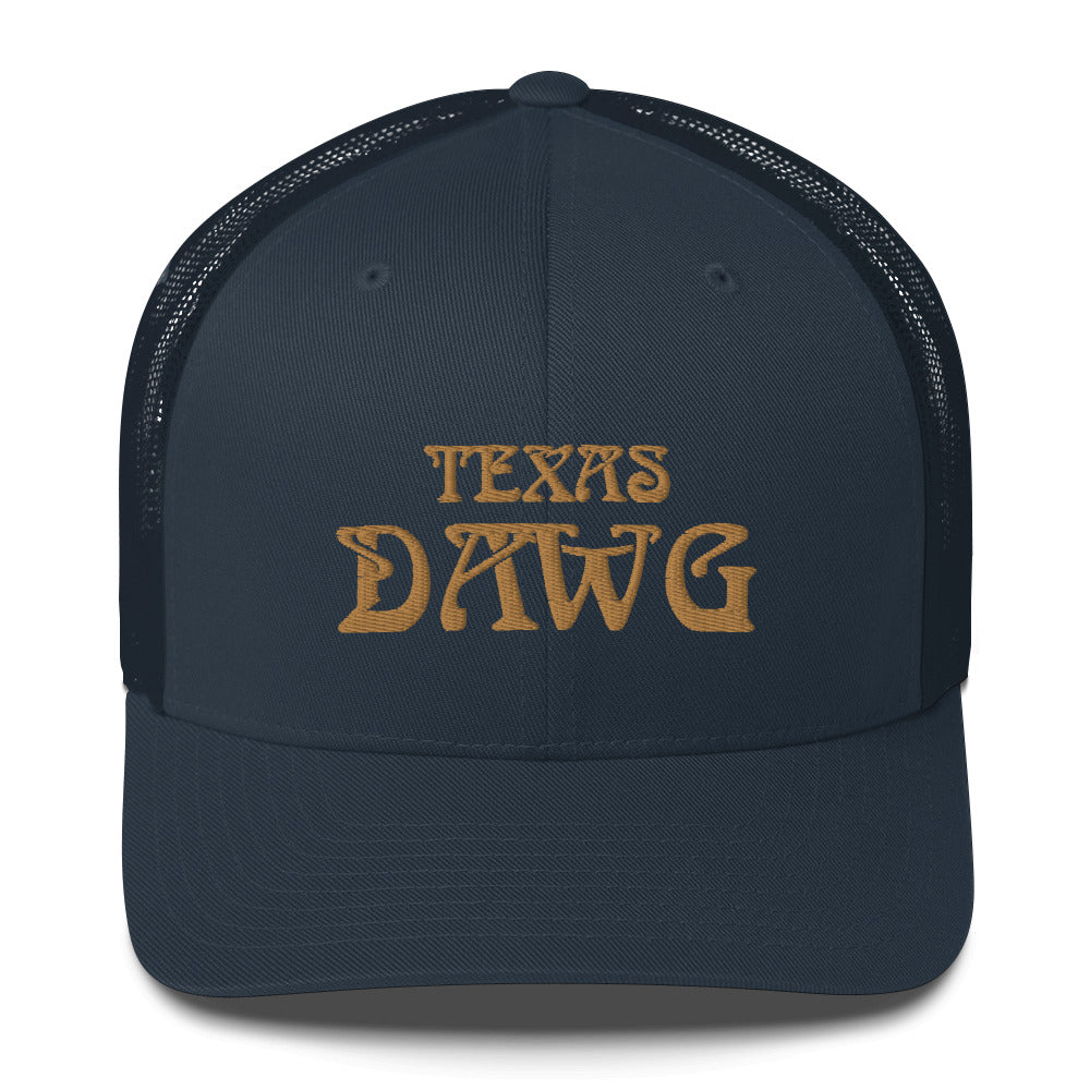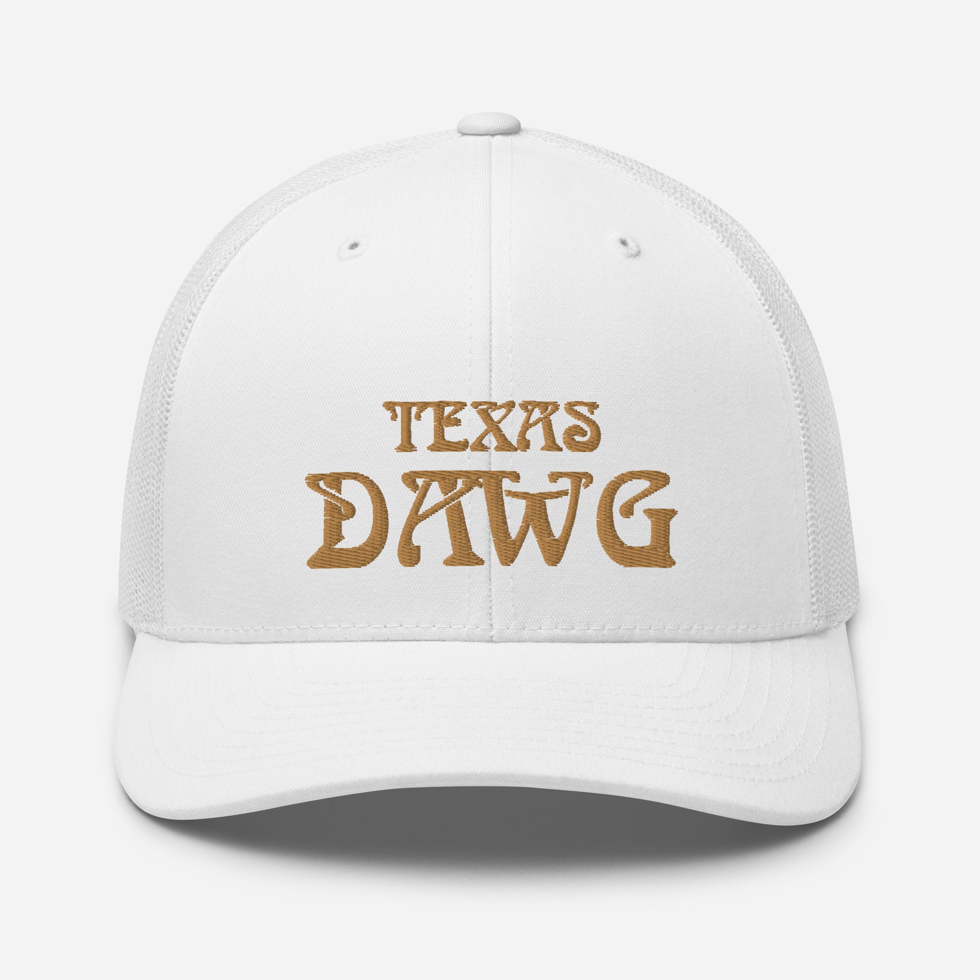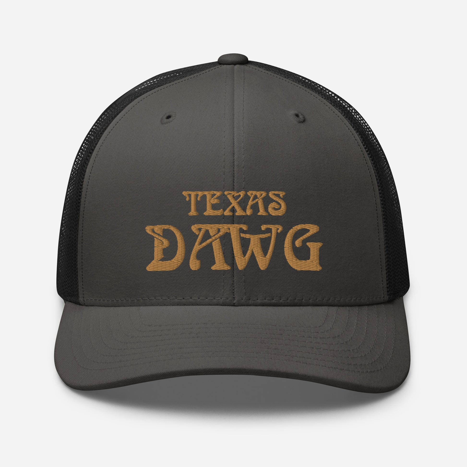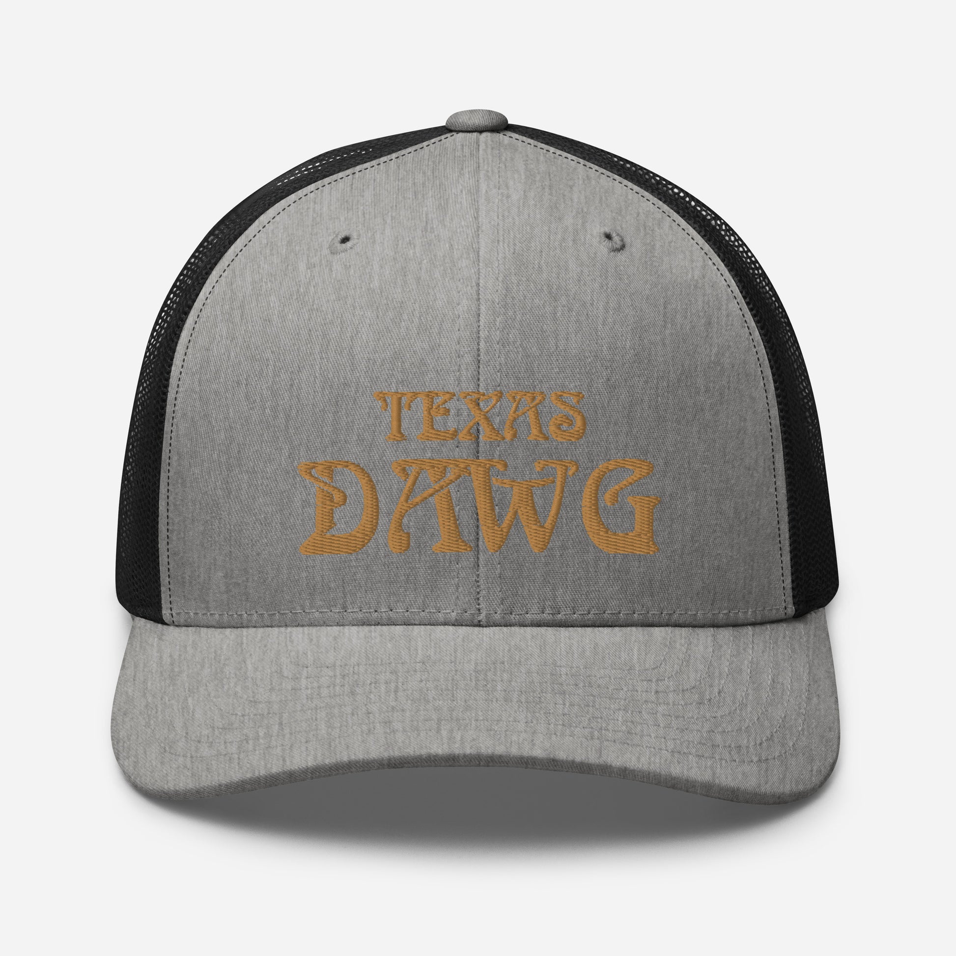 This six-panel trucker cap with a mesh back will be a comfy and classic choice for a perfect day in the sun or a funny trucker hat for crazy hat day. Texas Dawg is embroidered across the front in a fancy font and gold color.