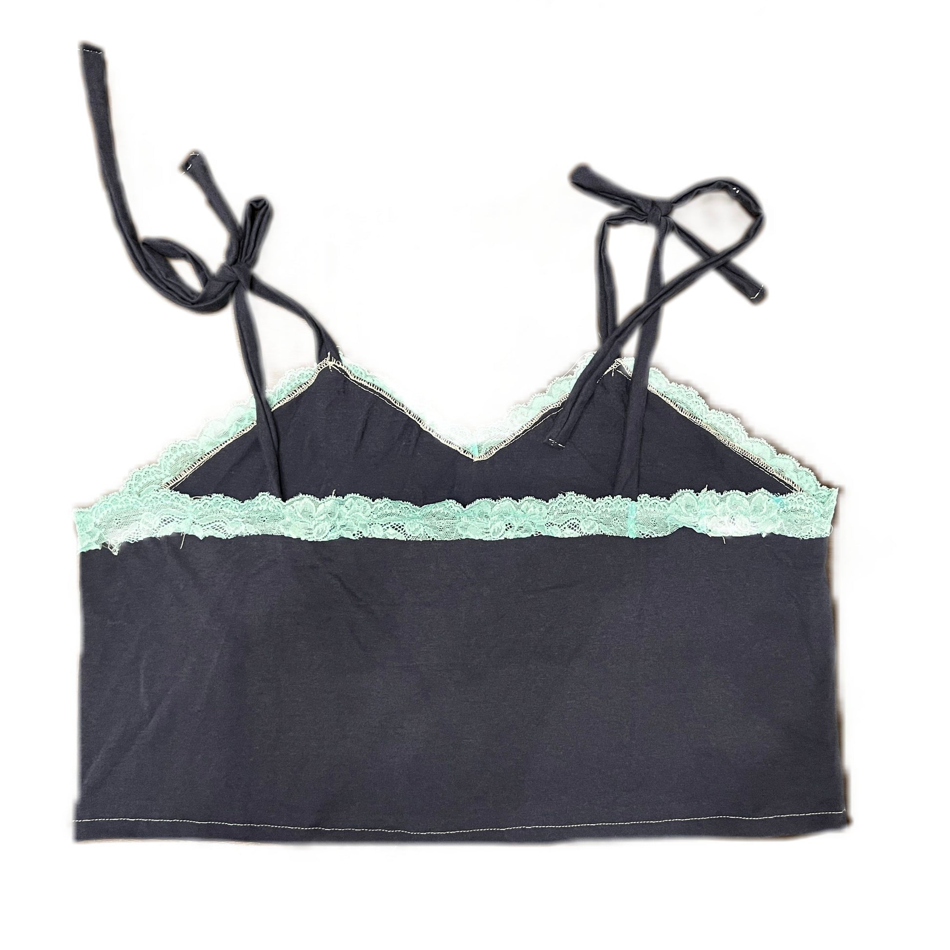 This exclusive Up-cycled Dallas Cowboys Spaghetti Strap Lace Trim Tee is made from a dark blue tee and upcycled material. Featuring a vibrant blue lace trim, this cropped top has spaghetti straps ties for a stylish, comfortable look.