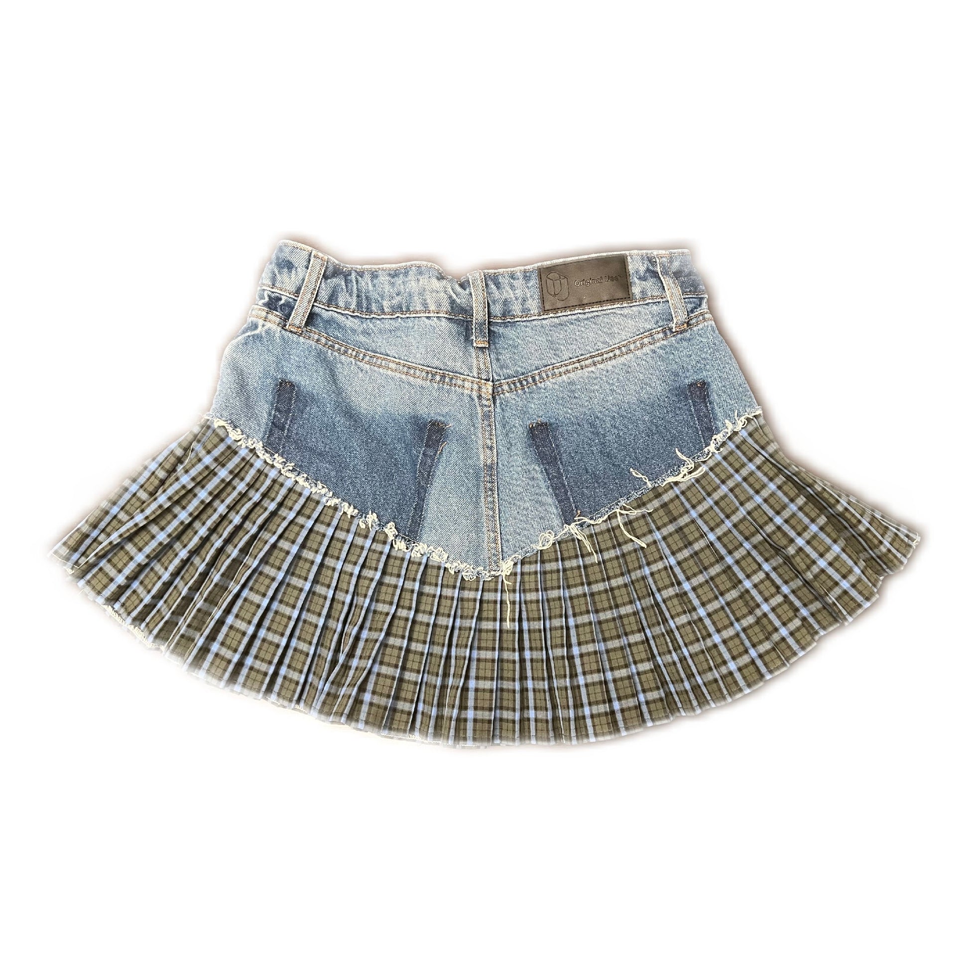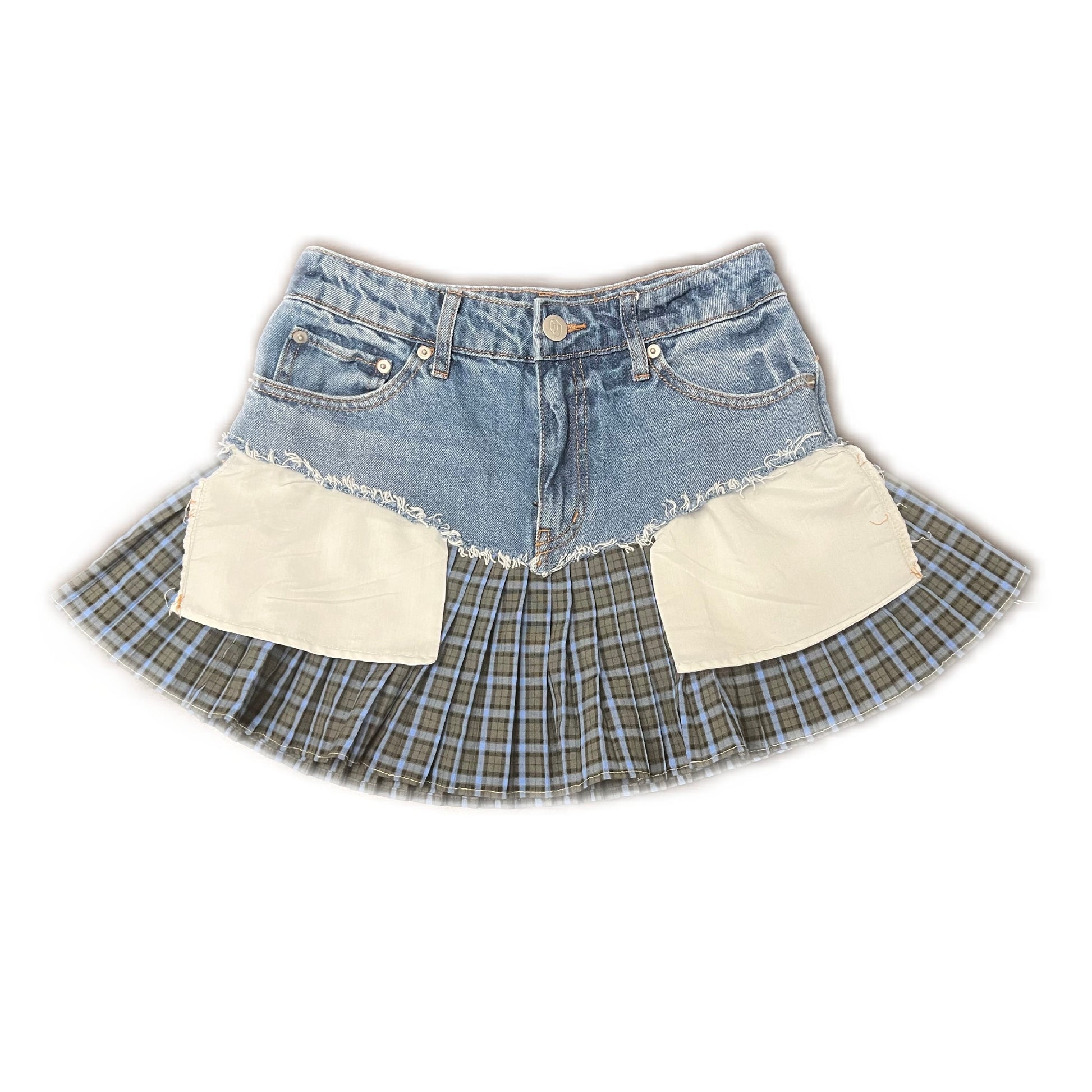 Up-cycled Denim Jean and Plaid Pleated Skirt