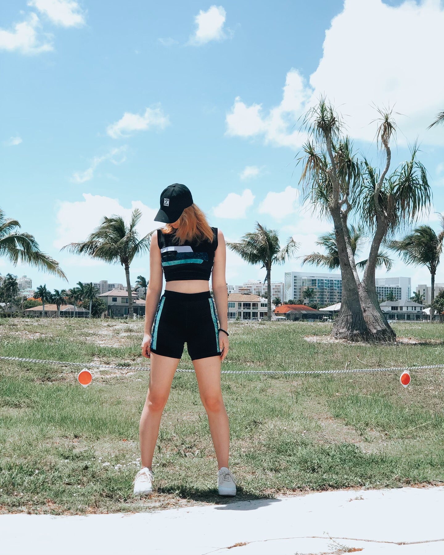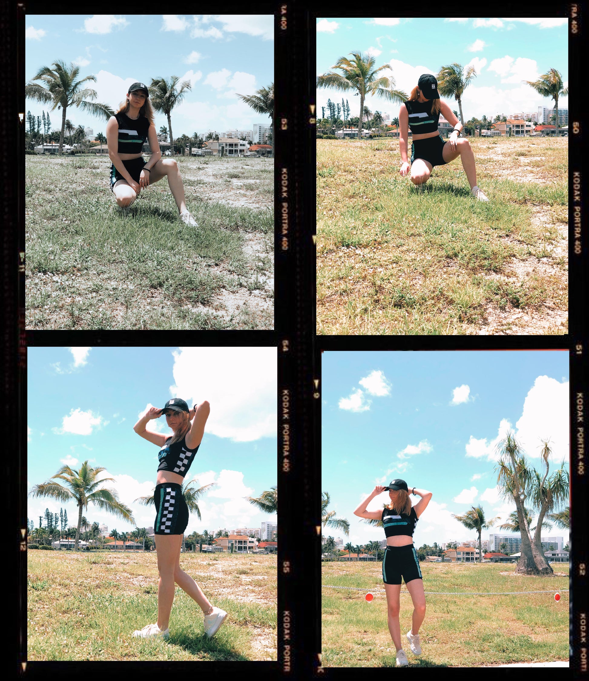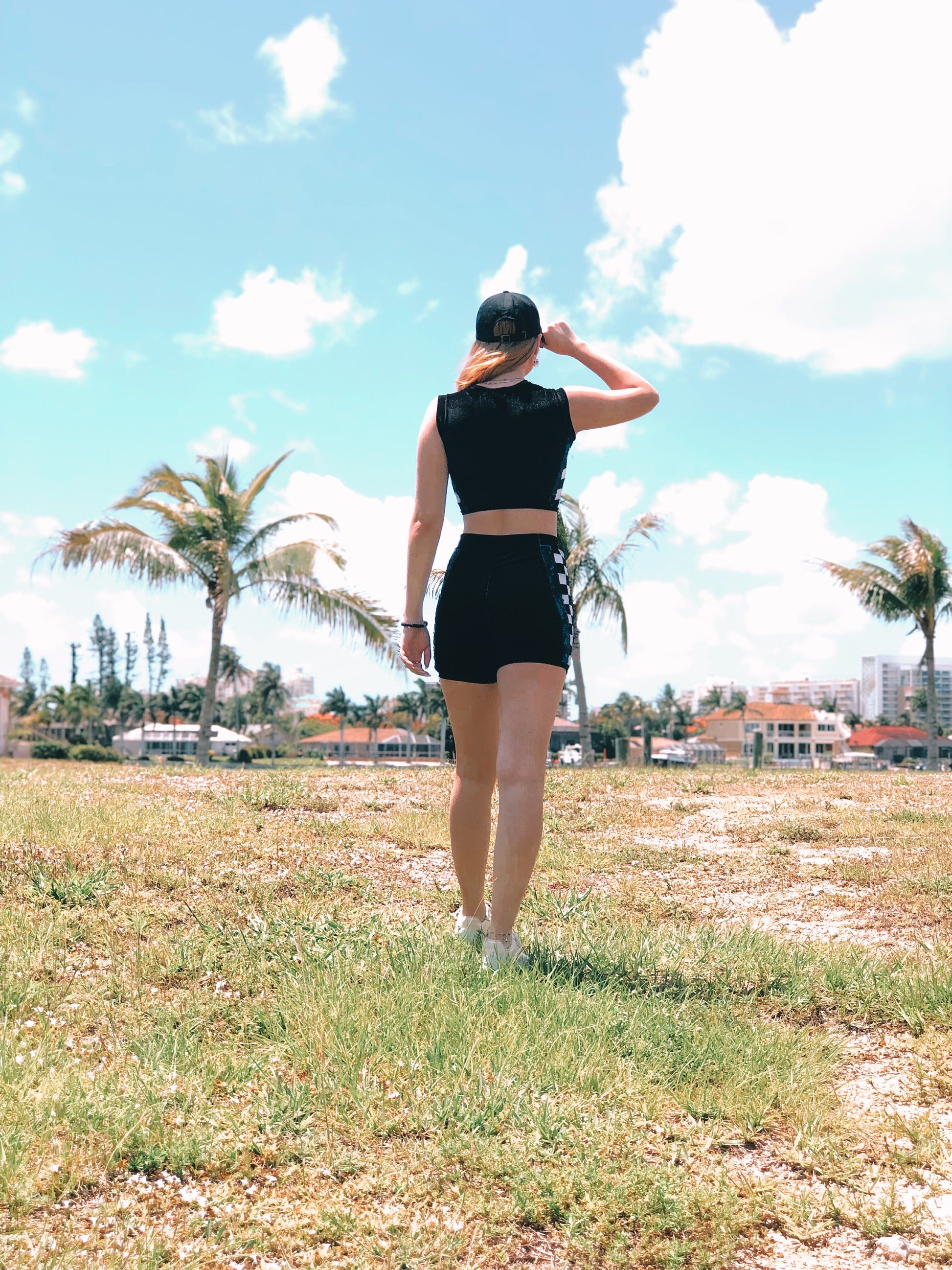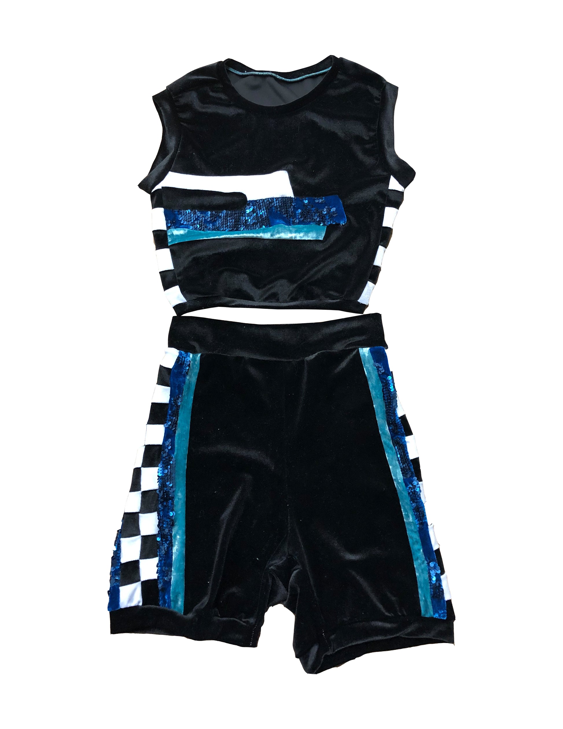 The Velvet Sports Set features a blue sequin velvet, turquoise crushed velvet, white, and black velvet striped accent that lays horizontally across the front of the black velvet sleeveless crop top. The side panel on the top and bottom feature black and white squares pieced together for a checkered pattern. The high-waisted bicycle style shorts, also, features the blue sequin and turquoise crushed velvet in two vertical stripes, outlining the checkered side panels. Thanks to the stretch of the velvet fabric, you can easily throw this look on for a beautifully curve hugging look. Perfect for a sporty, yet, glamours street-style look. Wear it to your favorite festival or upcoming concert!