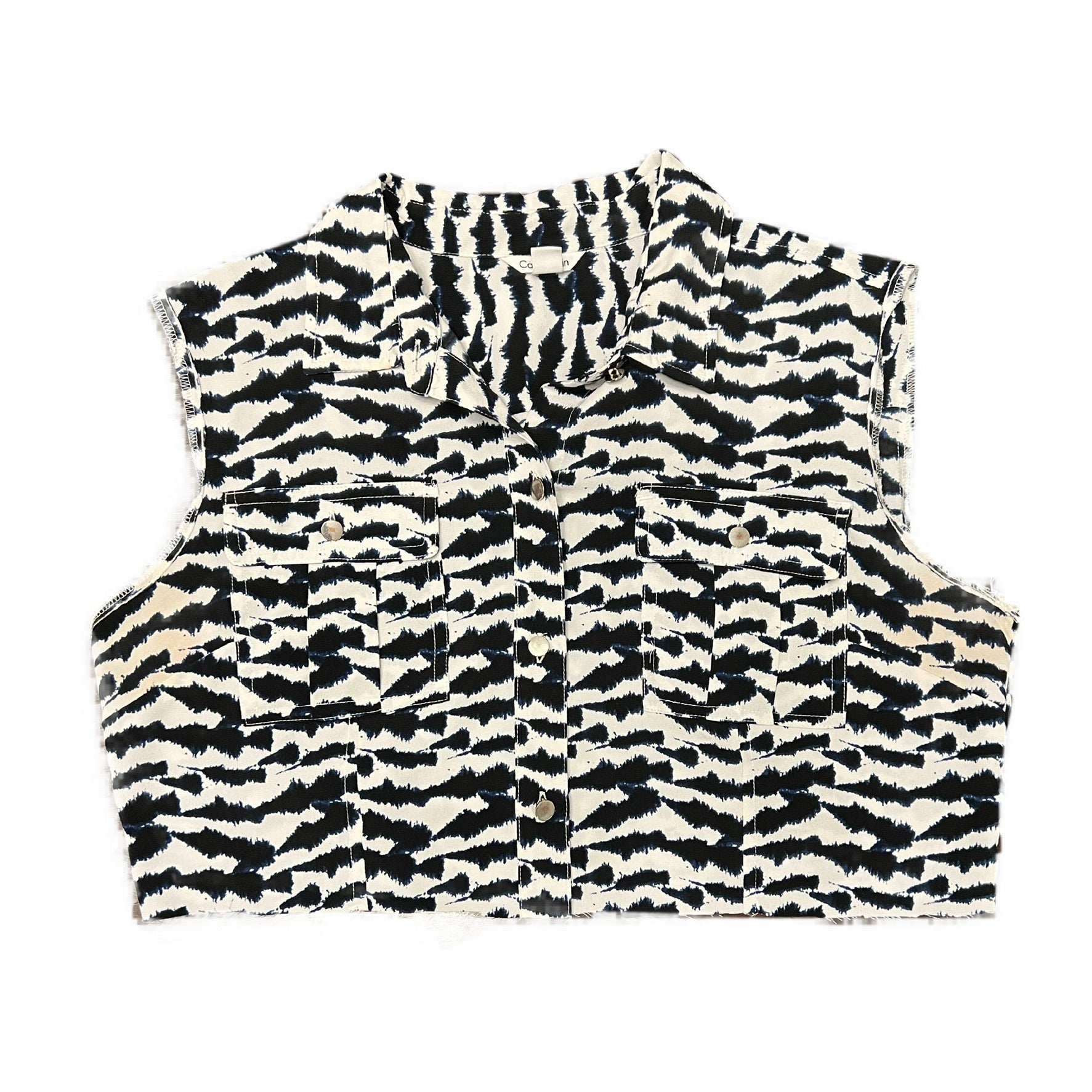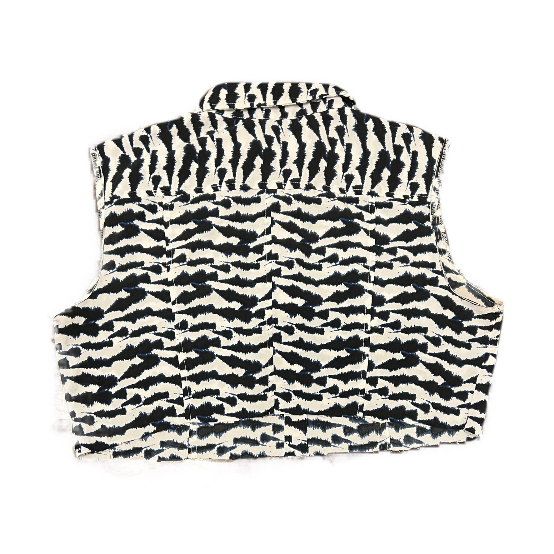 This upcycled Zebra Print Cropped Sleeveless Button-Up Top is the perfect addition to any wardrobe. Featuring a bold zebra print, a vest style cut, and a cropped design, it pairs perfectly with your favorite jeans and skirts. With its button-up front, you get the perfect fit every time.